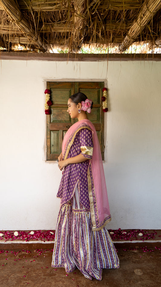 Saundh Purple and Peach Cotton block printed floral ghera dress