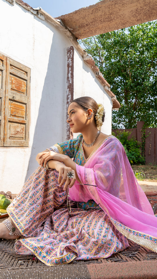 Saundh Sea Green and Pinm hand block printed cotton Salwar set