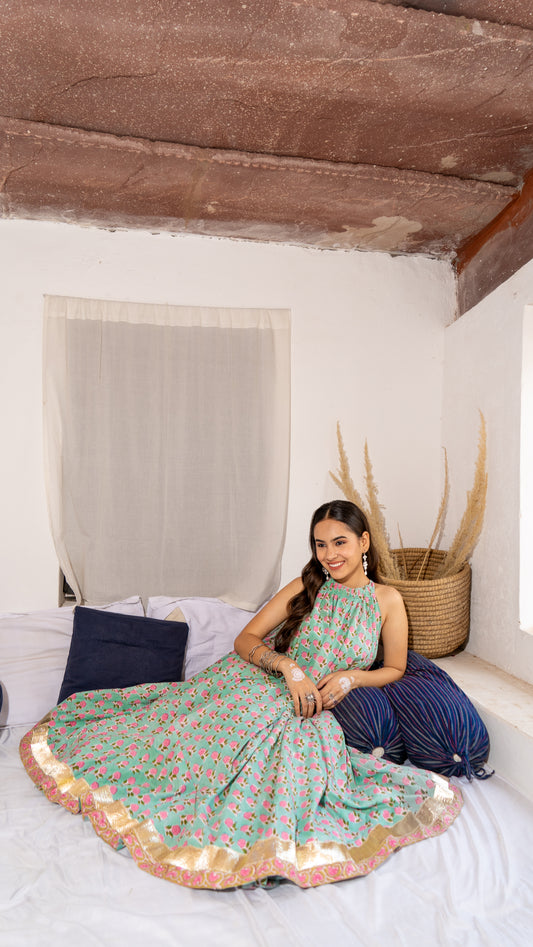 Saundh Pink and Blue Cotton hand block printed floral ghera dress