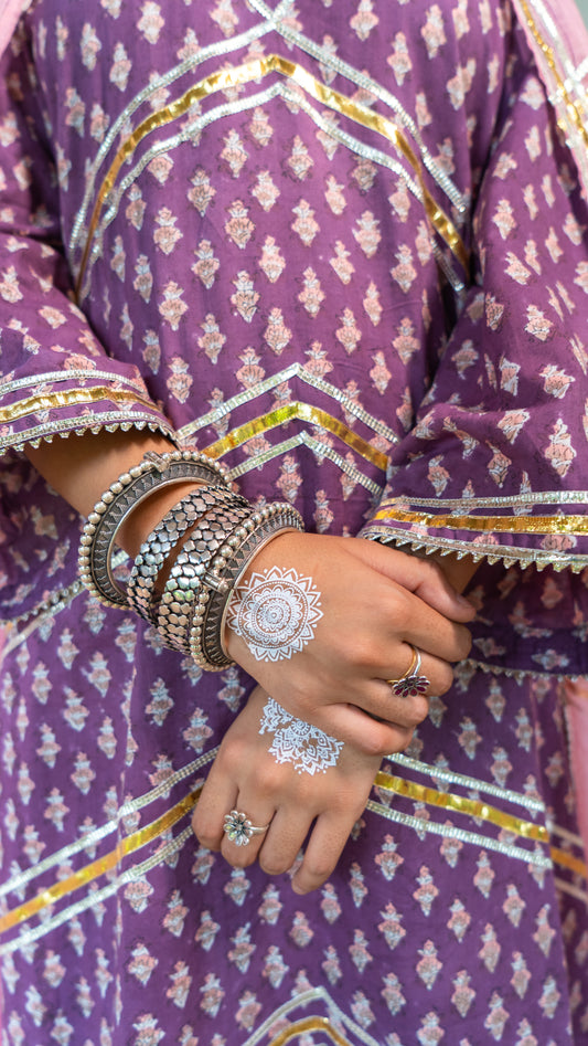 Saundh purple and peach hand block printed gota sharara set