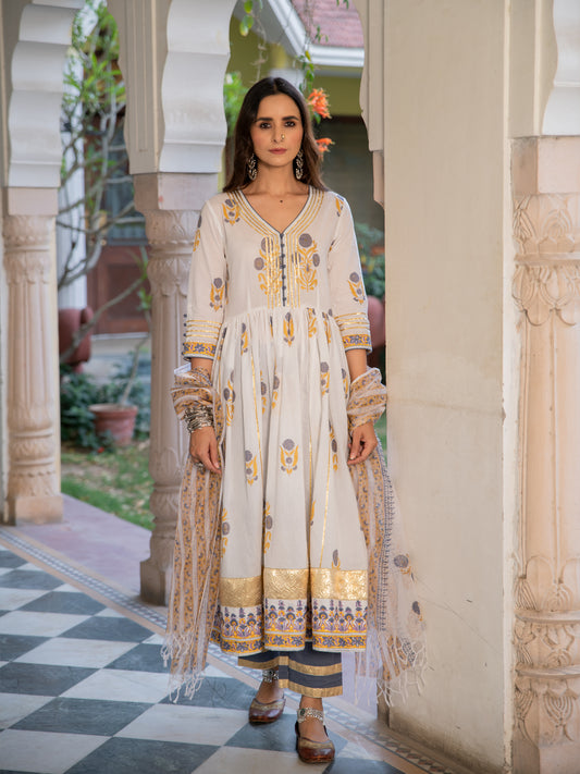 Lavender White Printed Cotton Gathered Kurta Set RTS