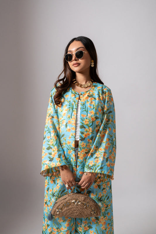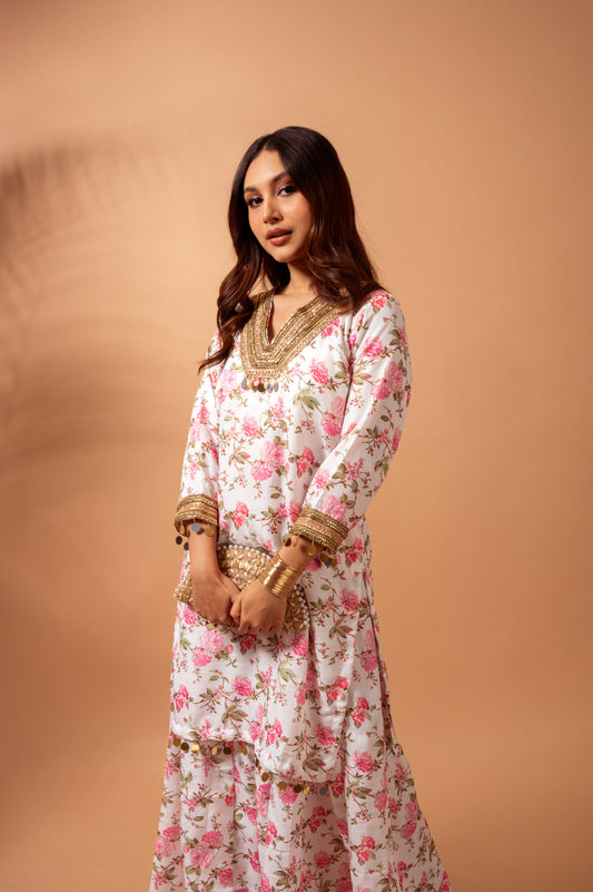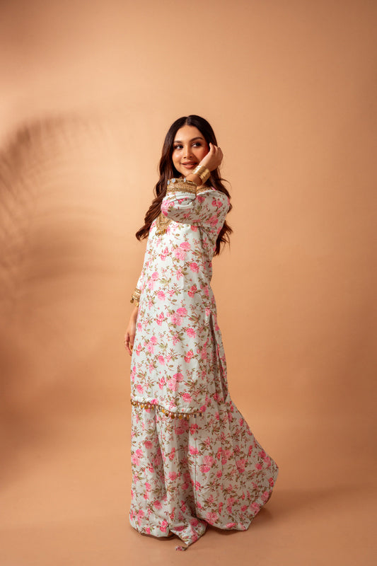 Saundh Sea Green and Pink Cotton hand block printed floral ghera dress