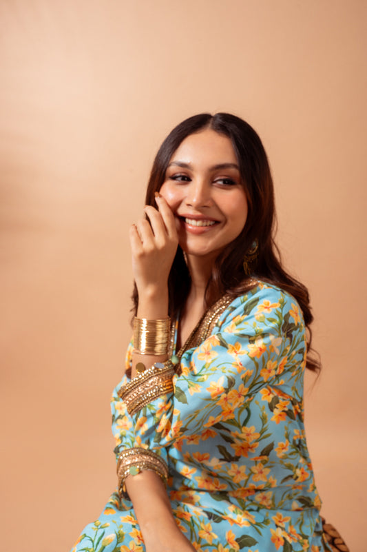 Saundh Pink and Blue Cotton hand block printed floral ghera dress
