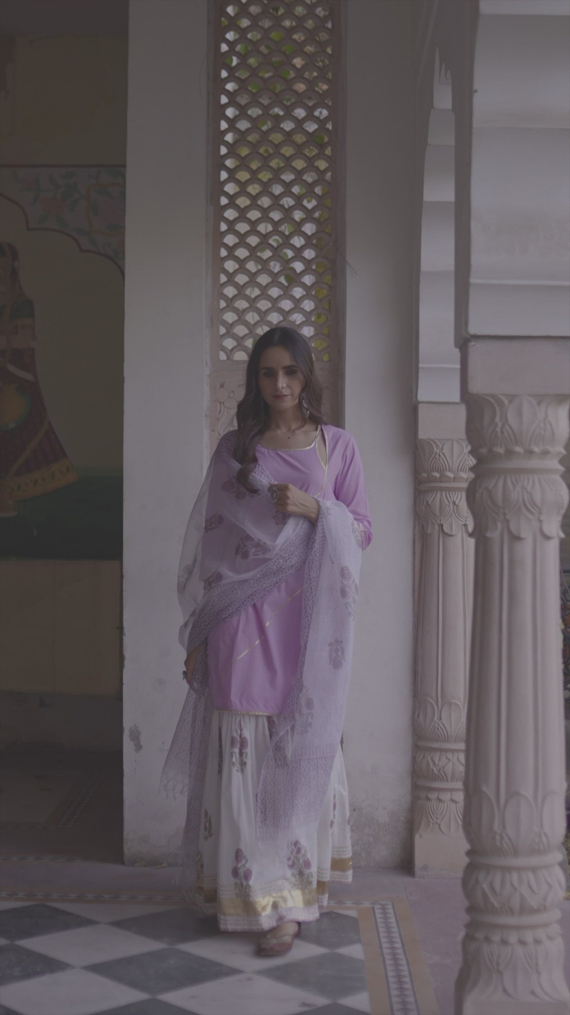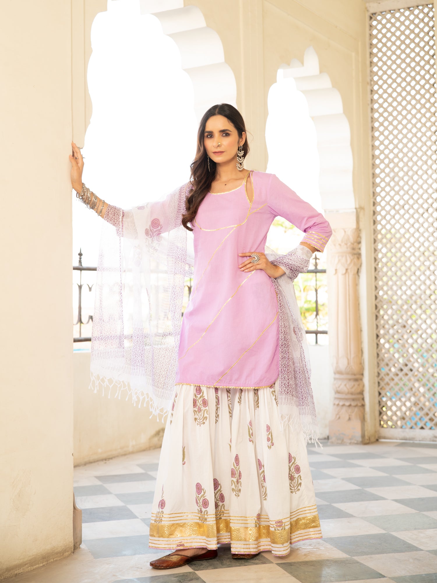 KURTA: A soft lavender hand block printed cotton kurta with gota dhari work.Â