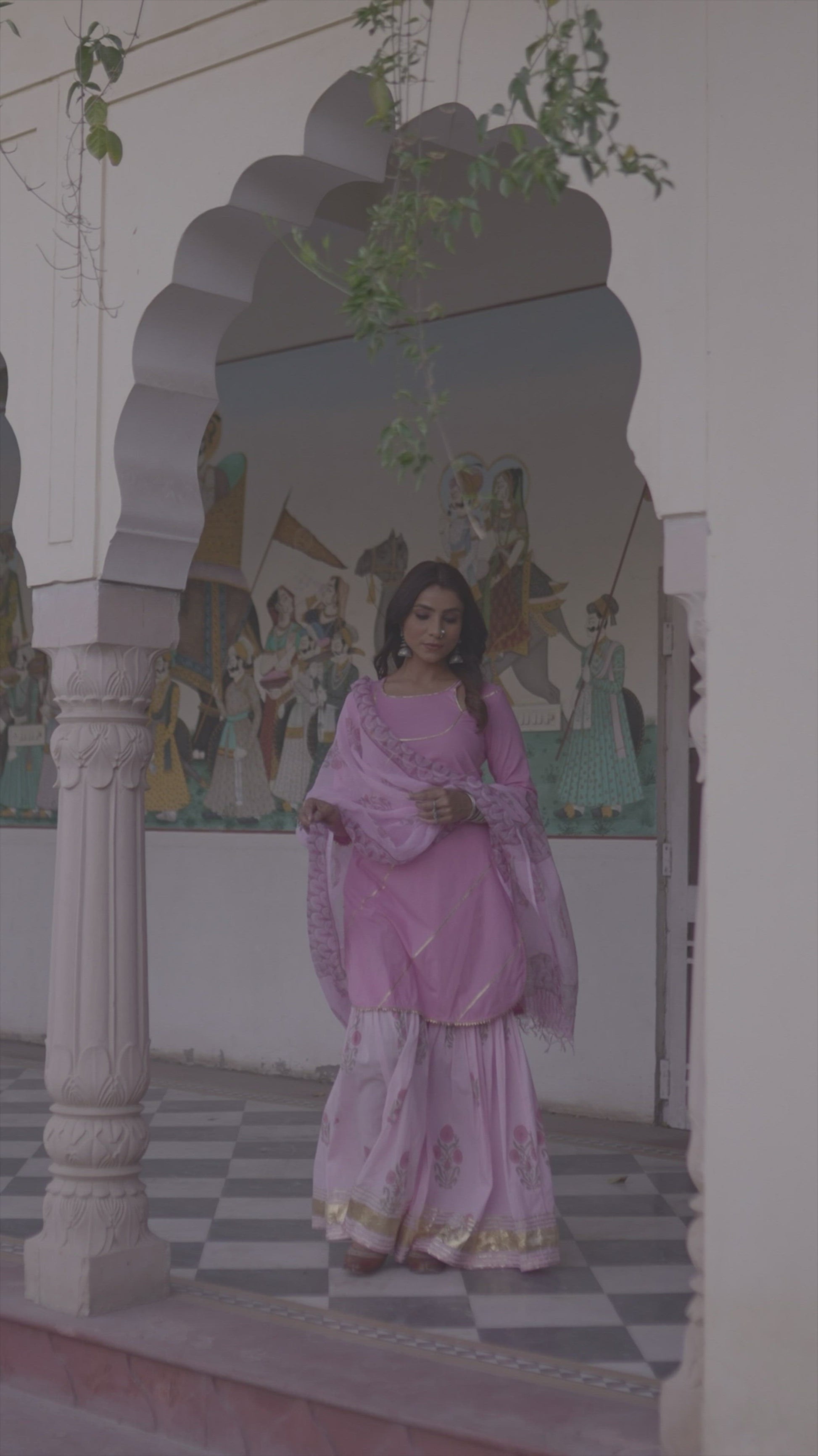 SHARARA: A cotton Mughal block printed sharara in a blush pink with gota detailing.