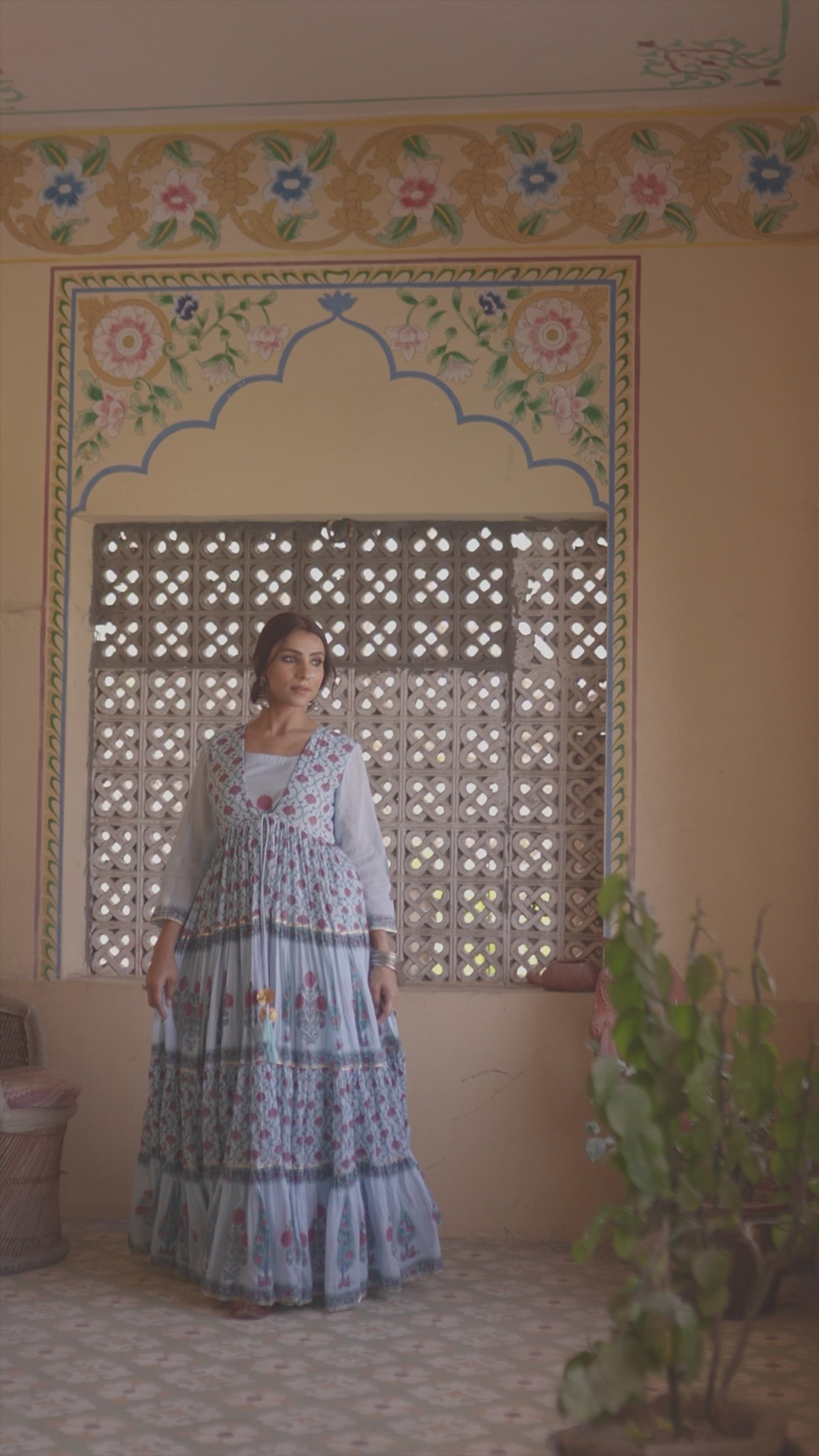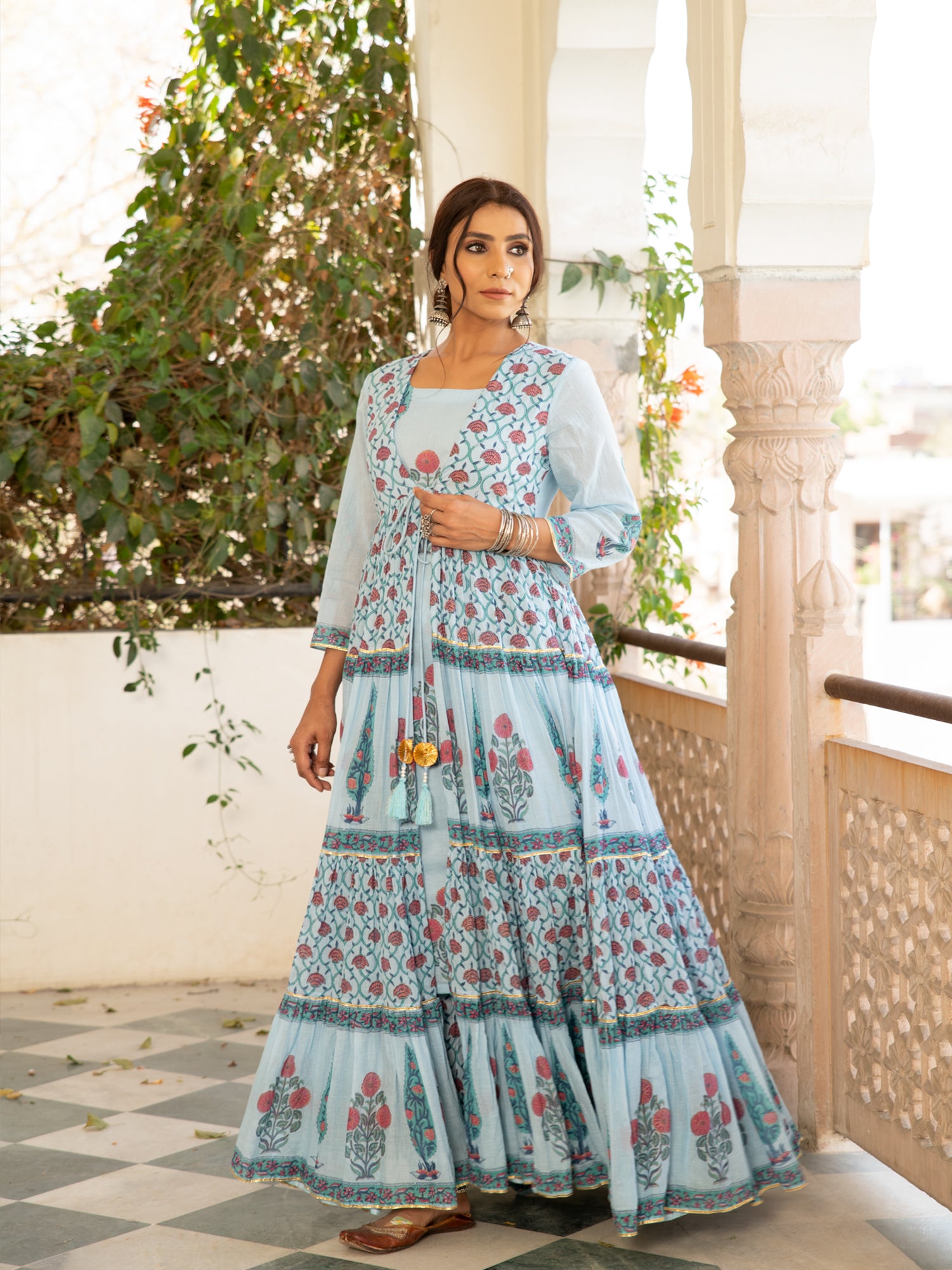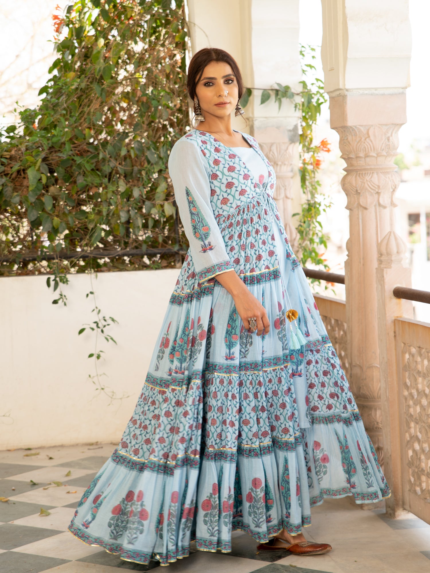 JACKET: A sky blue flowy tiered Mughal block print jama in floral Chinar and phool butta with Mughal jaal.