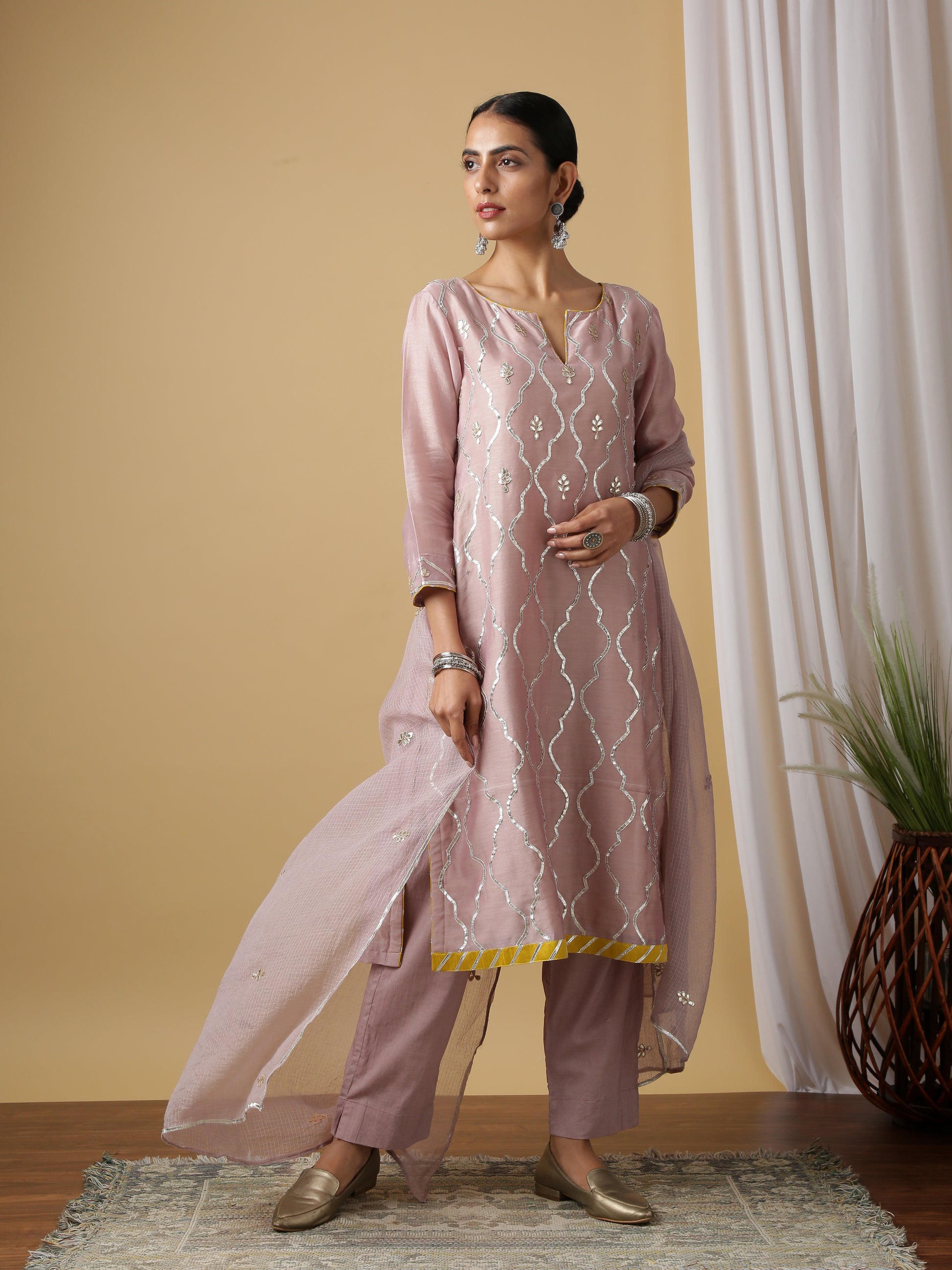 Set of 3 consists of kurta, dupatta and pants. Kurta- Chanderi kurta with gota embroidery inspired by the Jharonka at Amer Mahal Jaipur, finished with contrast yellow gota magzi on the neck, sleeves and slit. Dupatta- Kota doria dupatta with emroidered butas all over with gota lace finishing. Pants-Straight cotton pants. |