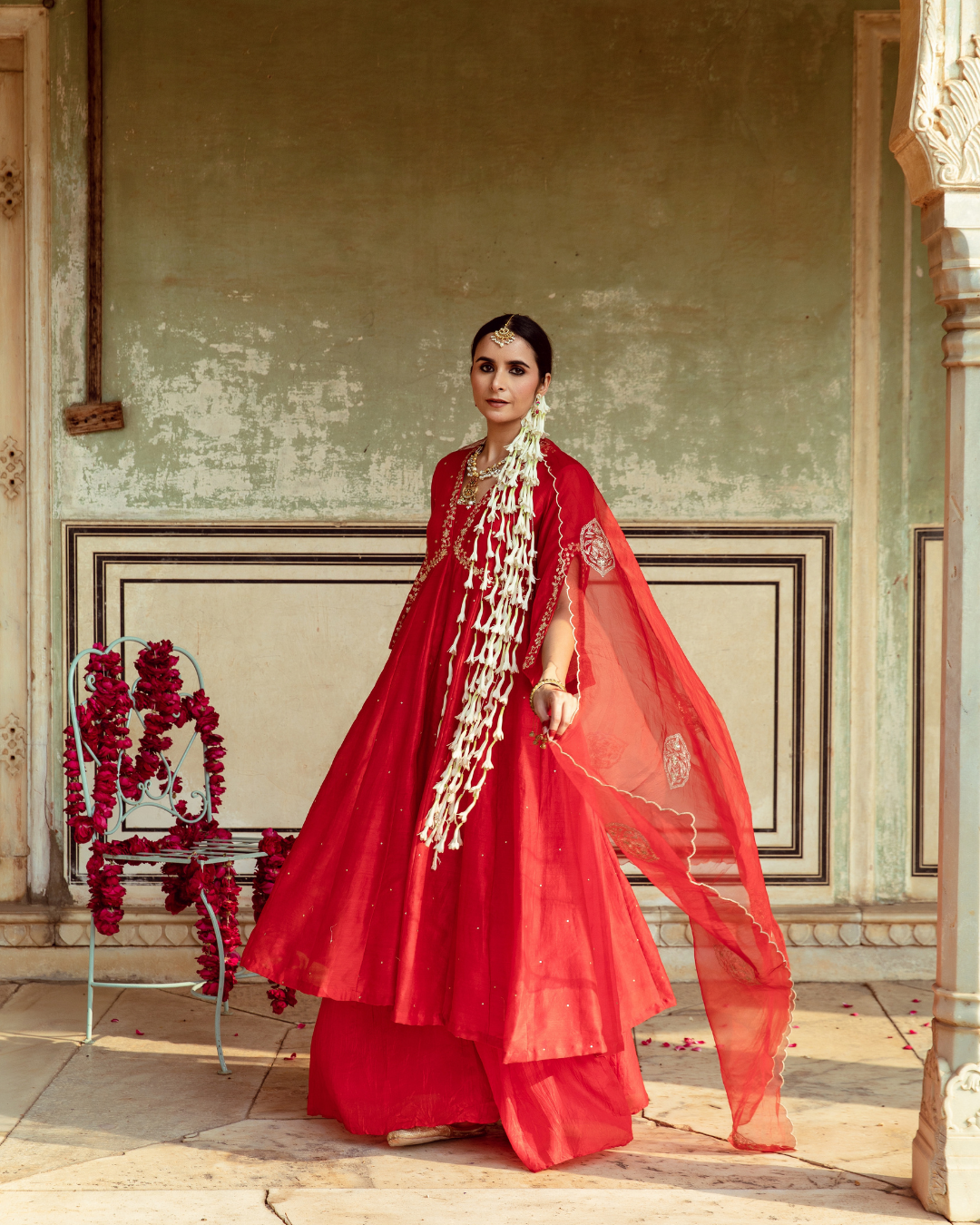 Kalidar: Chanderi silk in deep red with intricate zari embroidery on the neckline, sleeves, and back, embellished with scattered sequins.