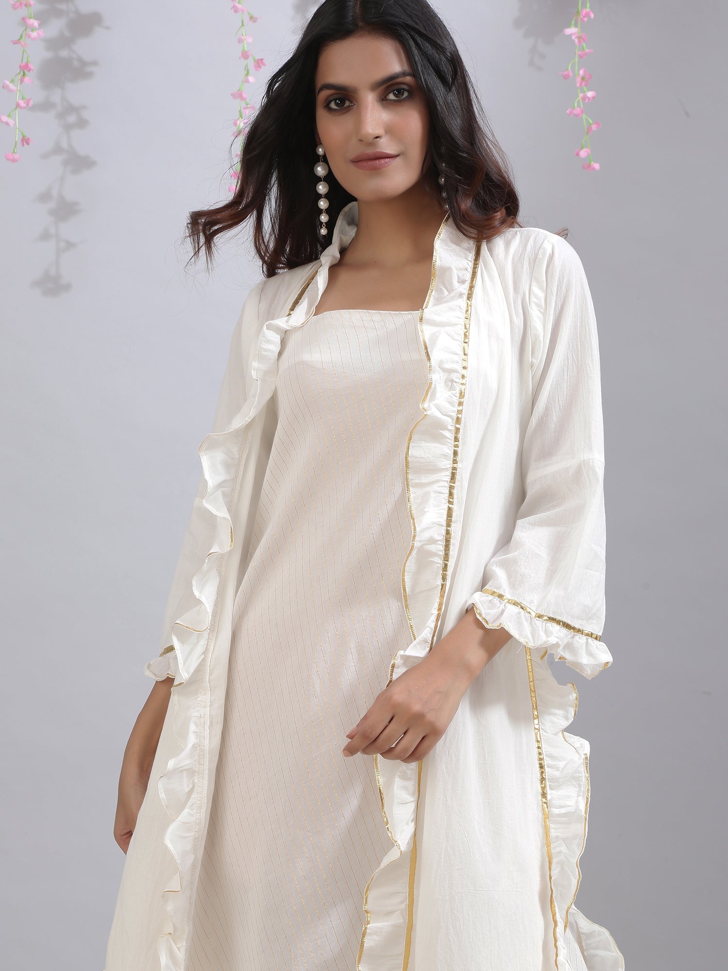 White front open cape style jacket with side slit and kaftan style sleeves finished with hand made gota frill lace. Style it over your denims and finish it with a belt for those semi formal festive vibes or pair it with our woven maxi dress and wear it for those summer weddings or cocktail nights. |