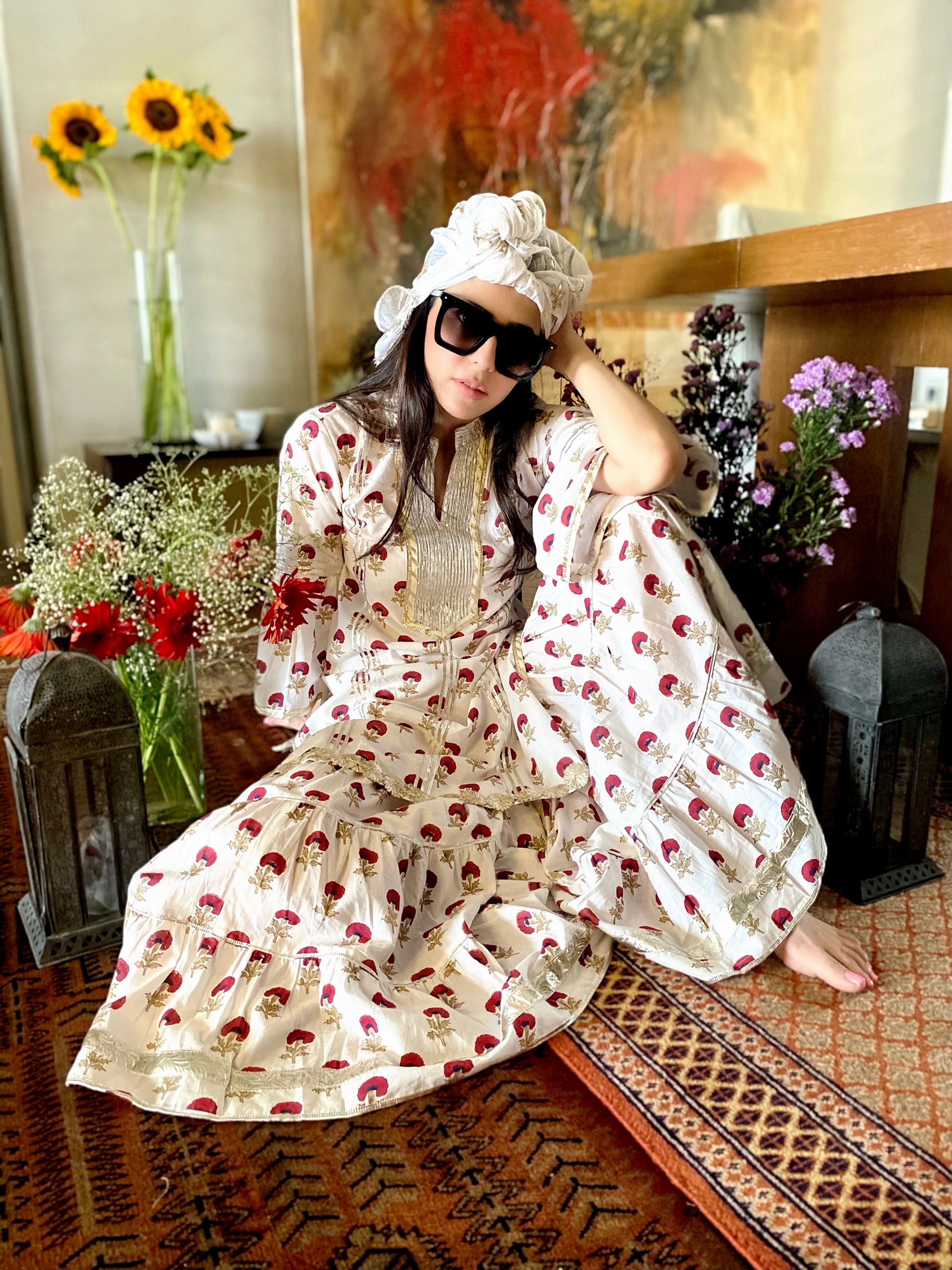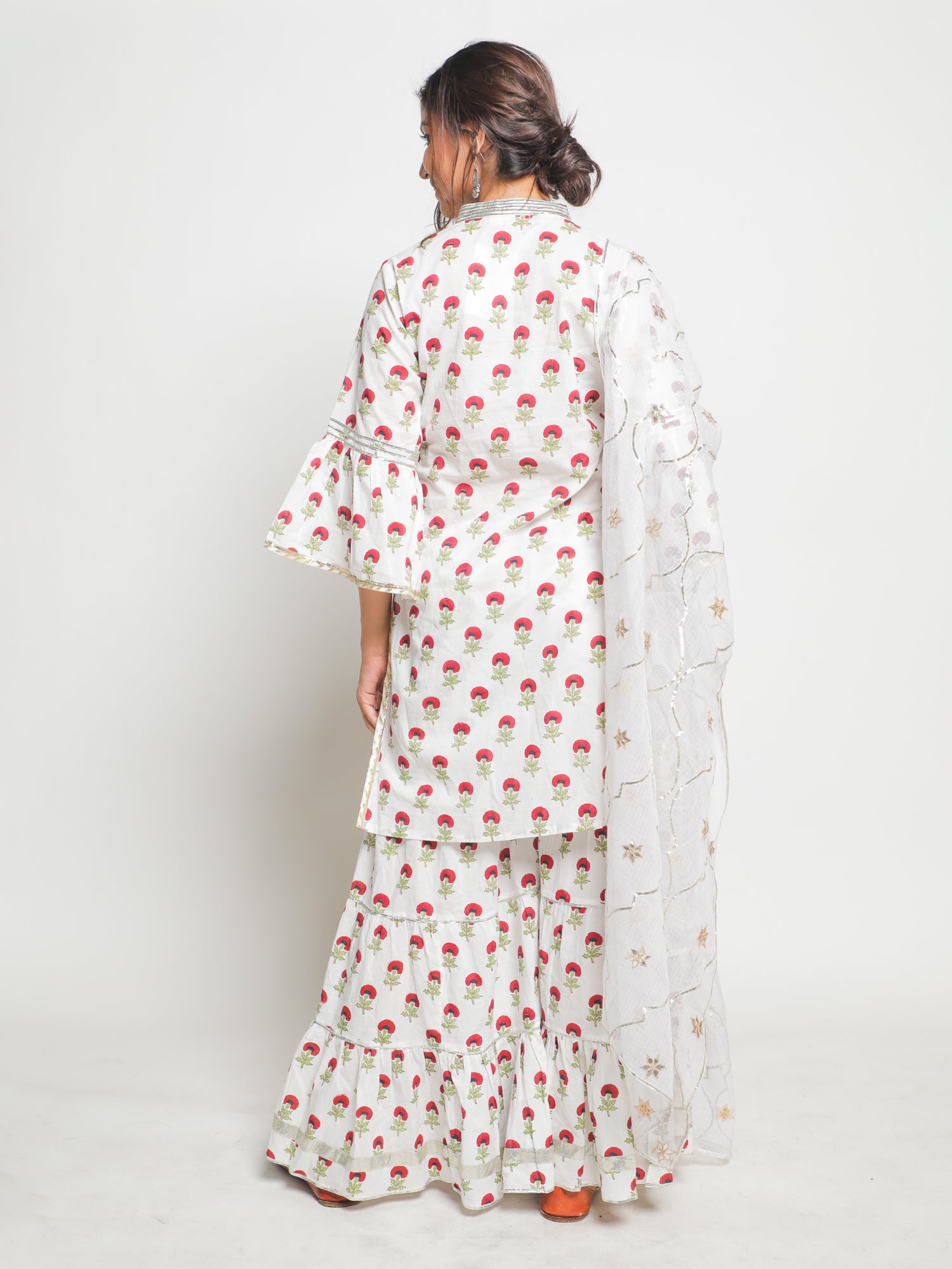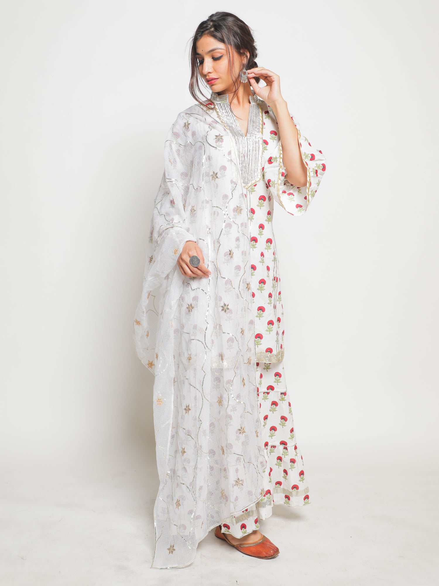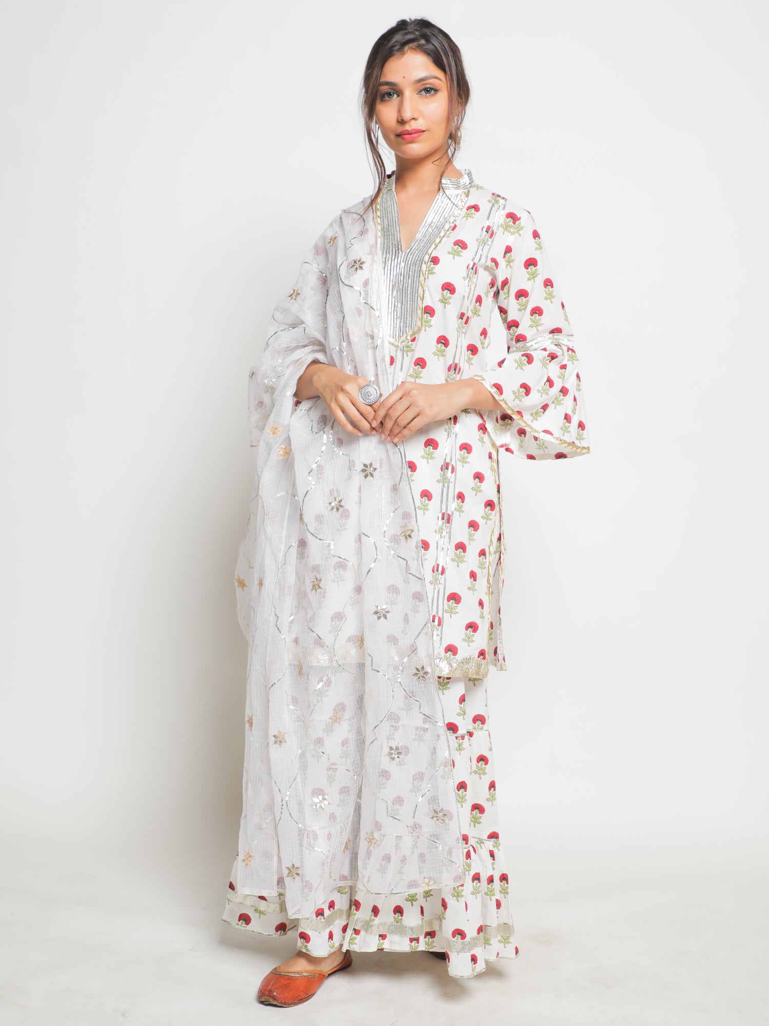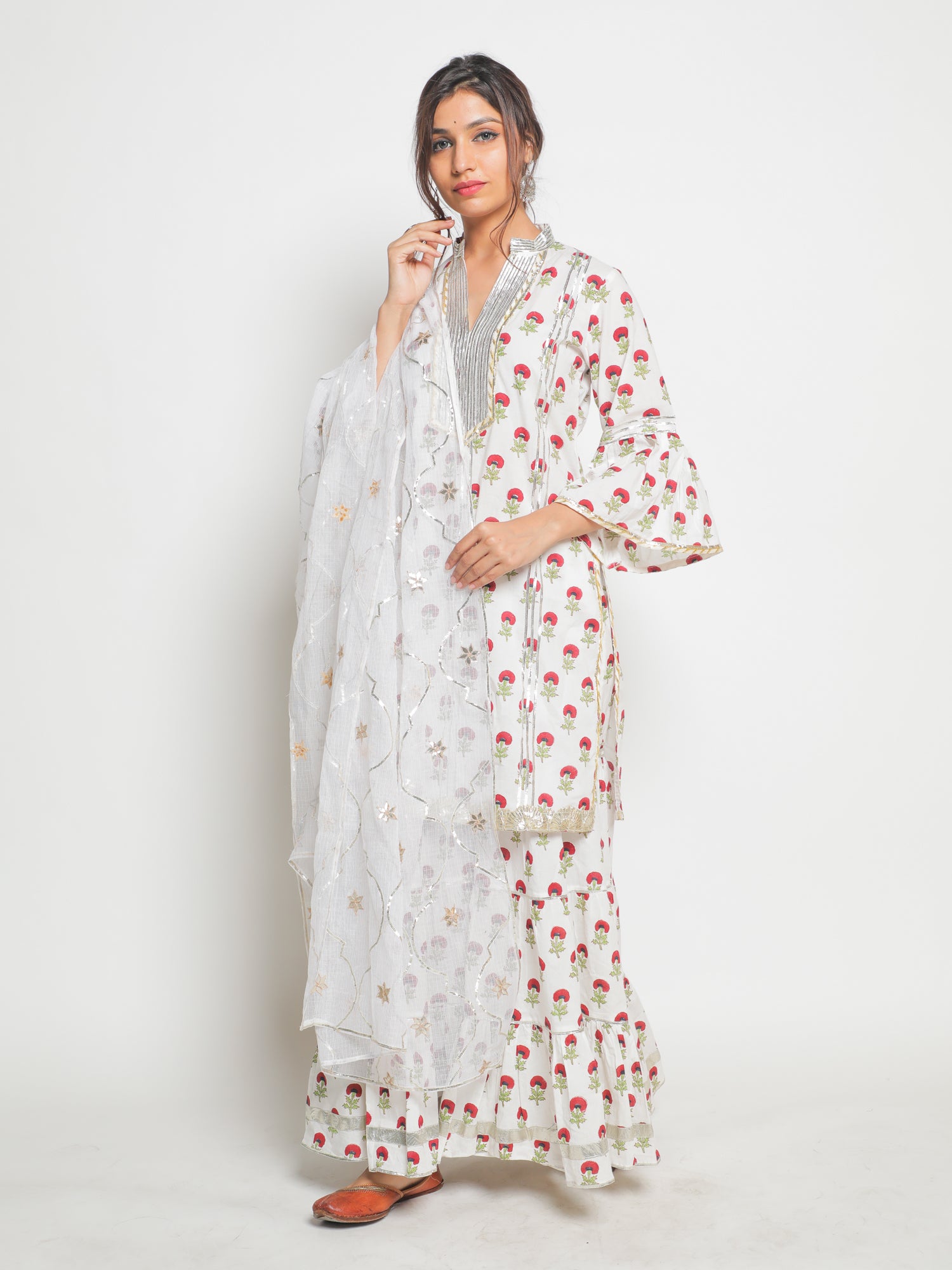 Floral hand printed sharara. Set of 3 - Consists of kurta, dupatta and sharara. KURTA - Straight bell sleeves kurta with gota dhari work and handmade floral gota lace detailing. SHARARA - Traditional ghera sharara in marigold print with silver gota lace work and hand worked DUPATTA - Hand work gota jaal dupatta in kota doria. |