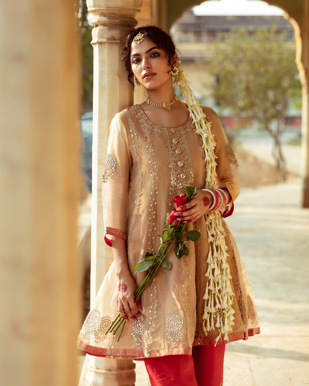 Kurta: Pure tissue silk with elegant gota patti butta and bel designs, enhanced by marodi embroidery.
