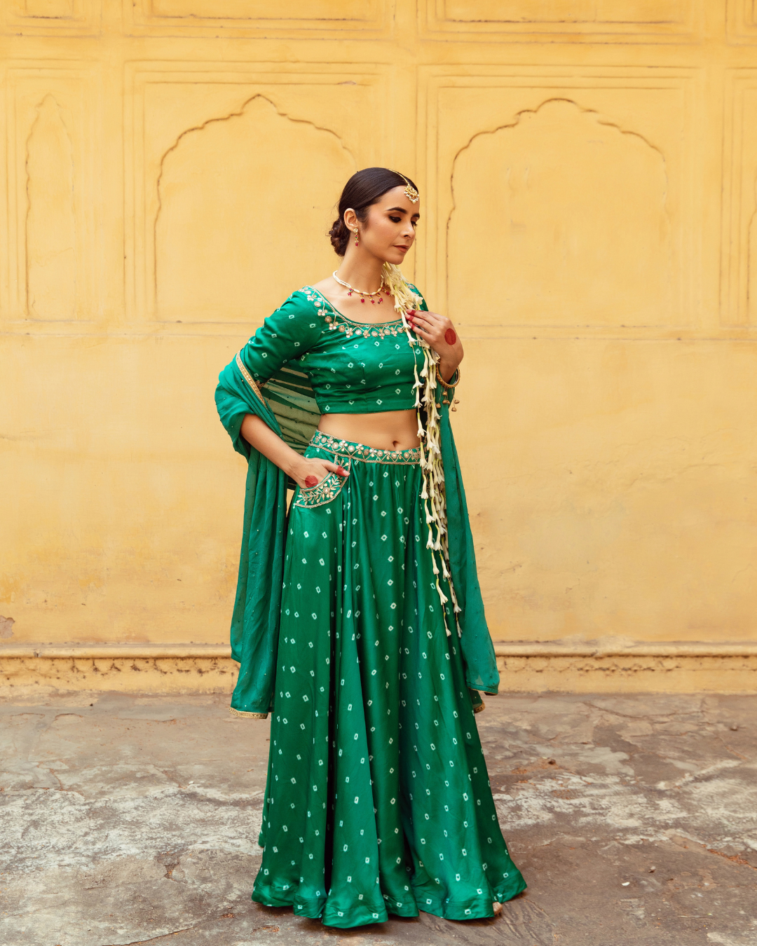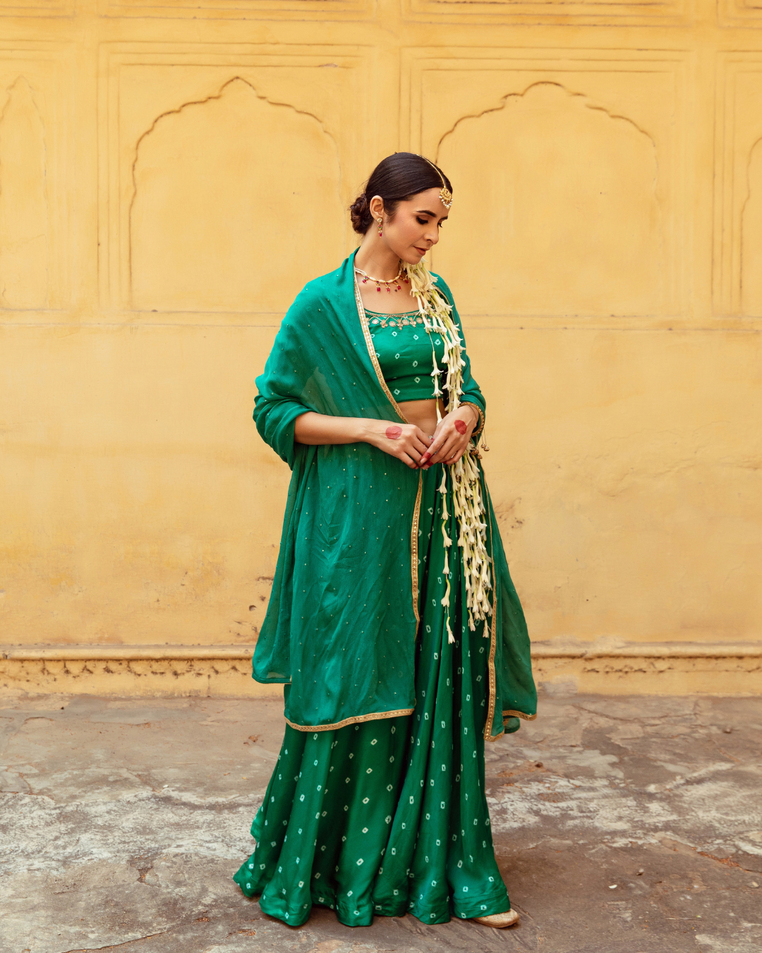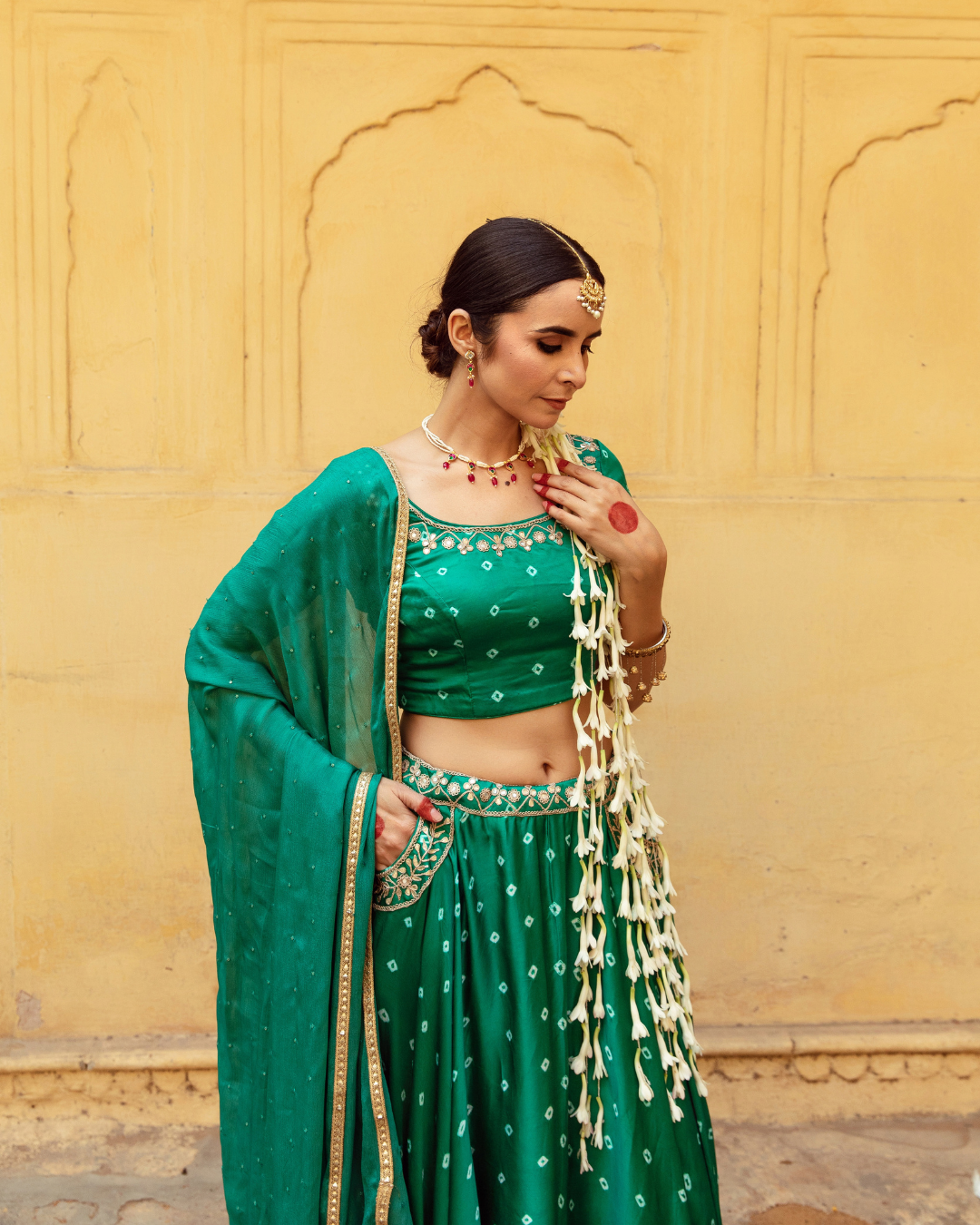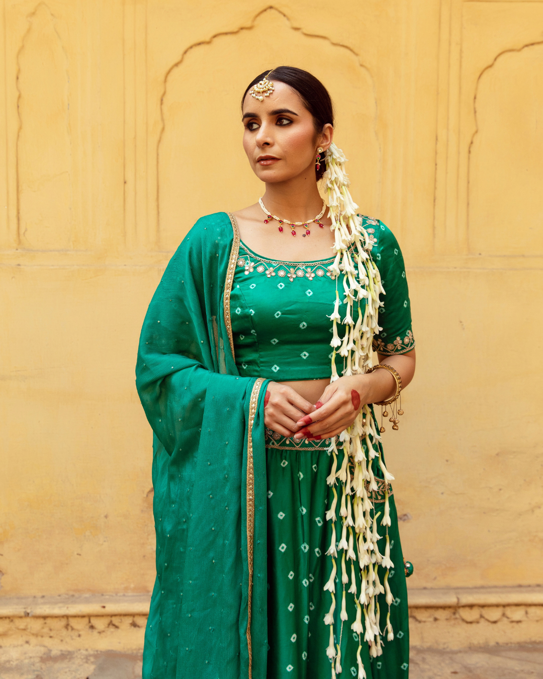 This Green and White Bandhej Print Lehenga Set exudes timeless elegance with a vibrant twist.