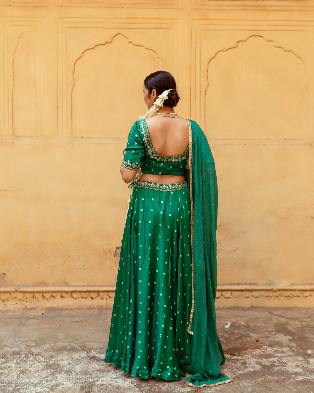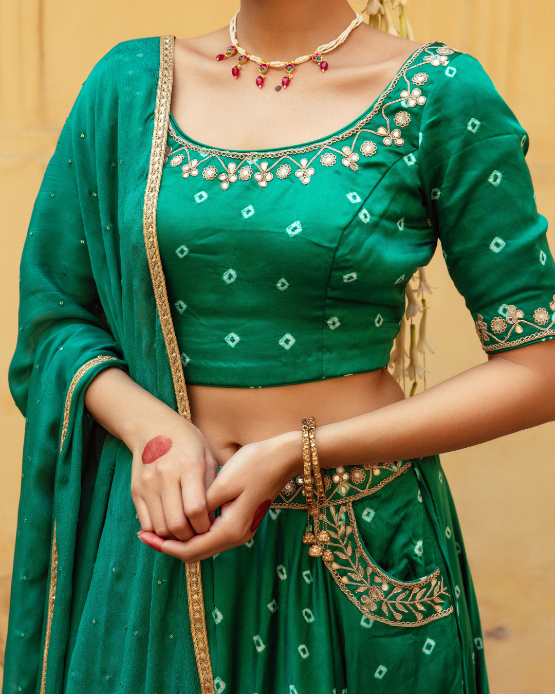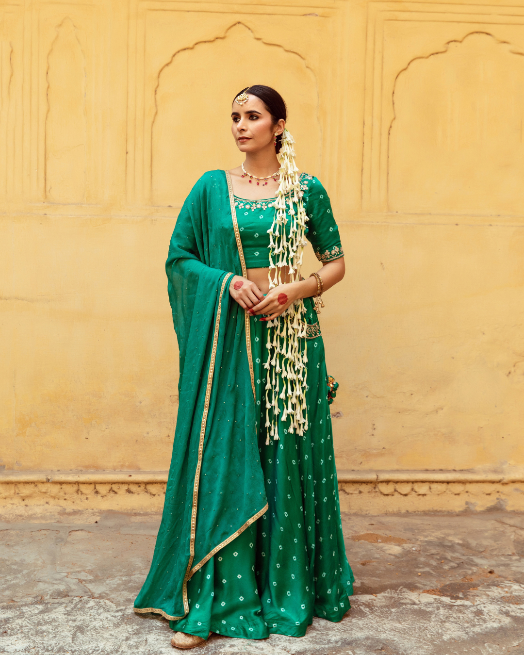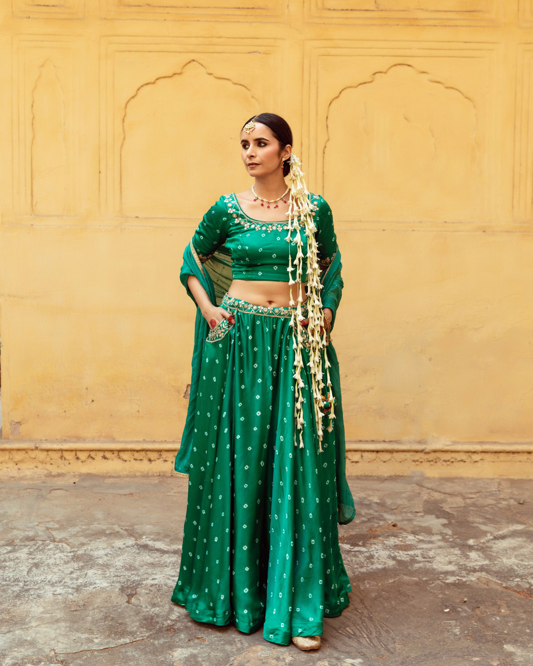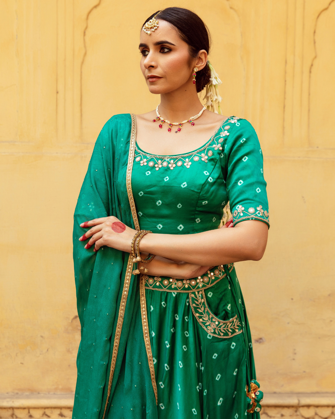 This Green and White Bandhej Print Lehenga Set exudes timeless elegance with a vibrant twist.