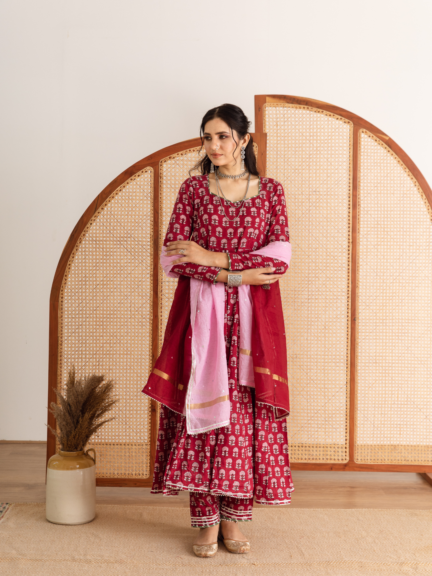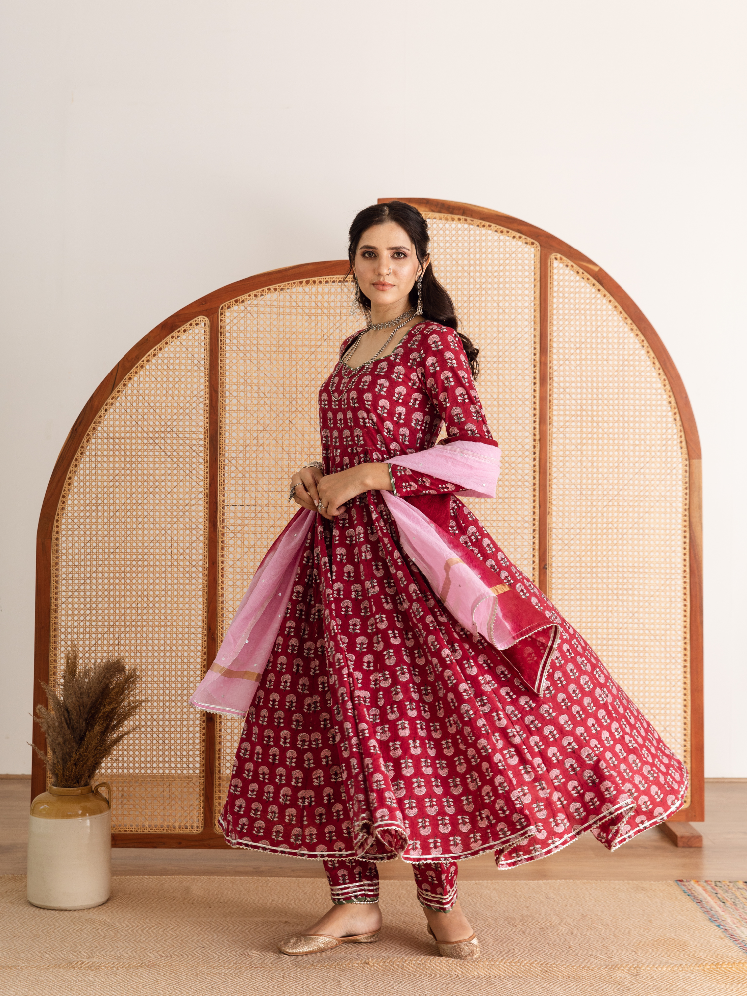 KURTI - Ghera kalidar with printed marigold flowers in pink, finished with magzi and gota detailing.