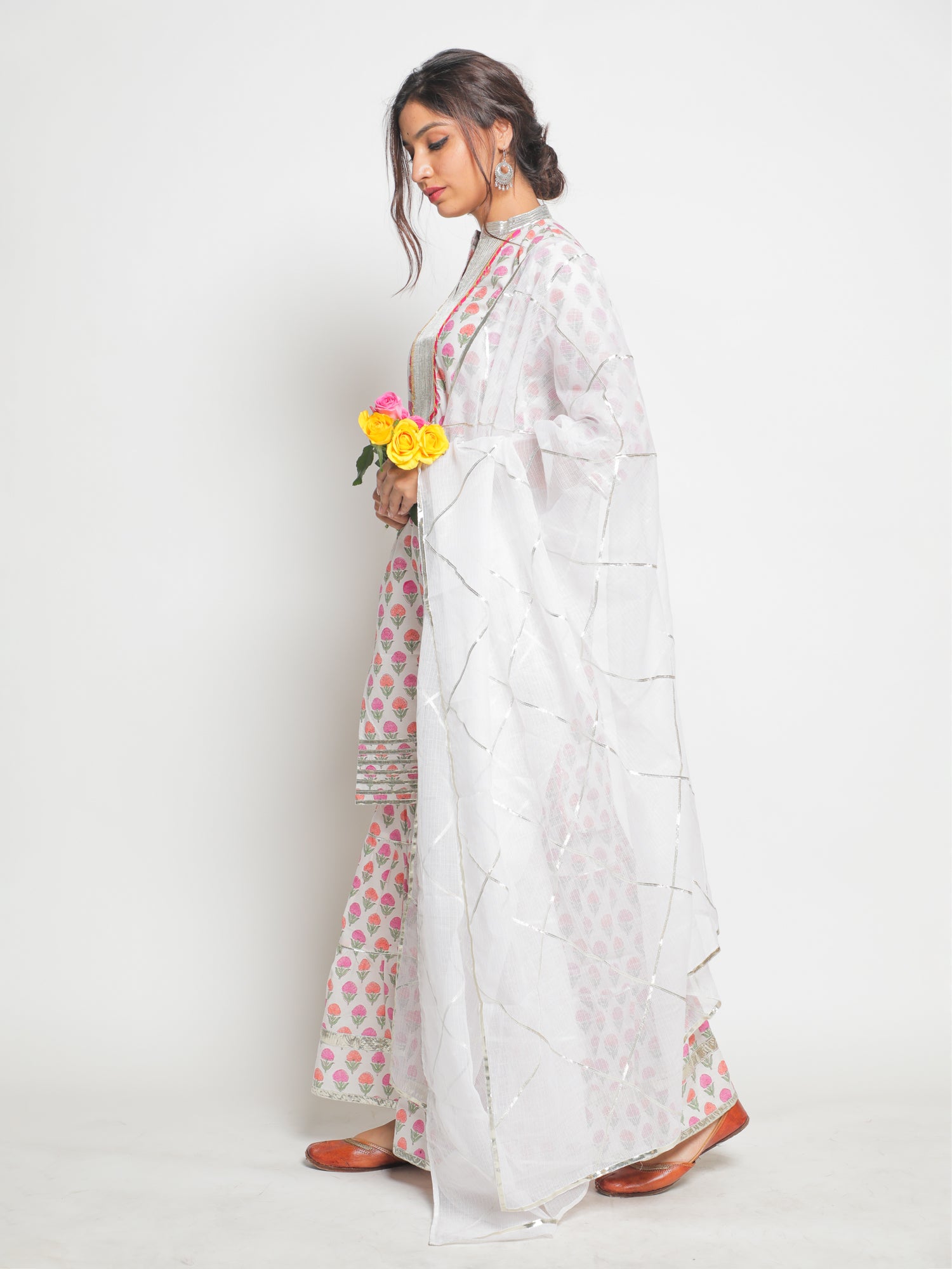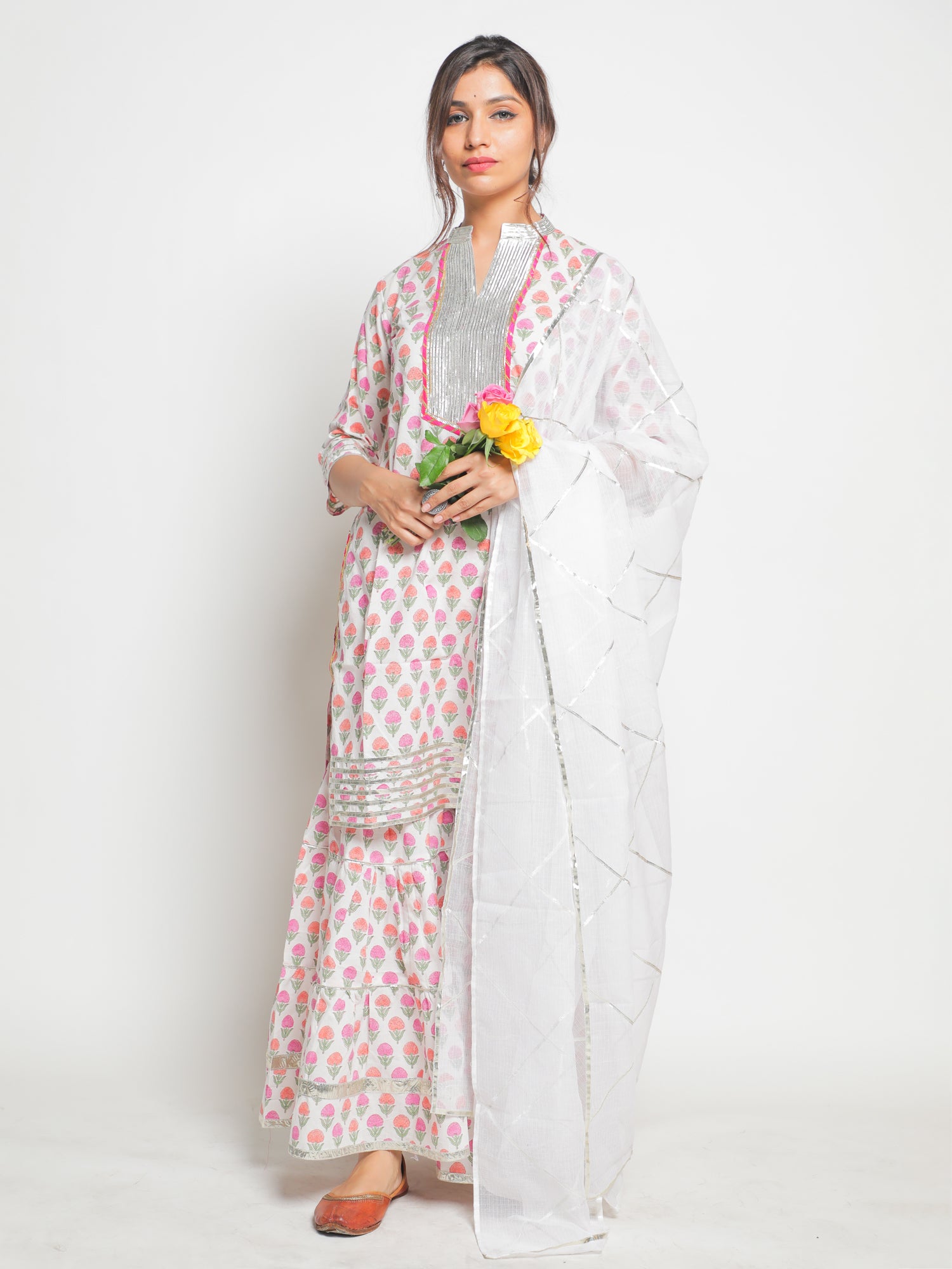 KURTA- Straight kurta with hand gota work on the neck, sleeves and hem finished with a traditional handcrafted magzi (gota lace) in a festive rani pink. Crafted in 100% hand spun cotton. SHARARA- Tiered sharara adorned with silver hand embossed gota lappa and gota lace. DUPATTA- Handwoven kota doria dupatta with gota chaukdi work. |