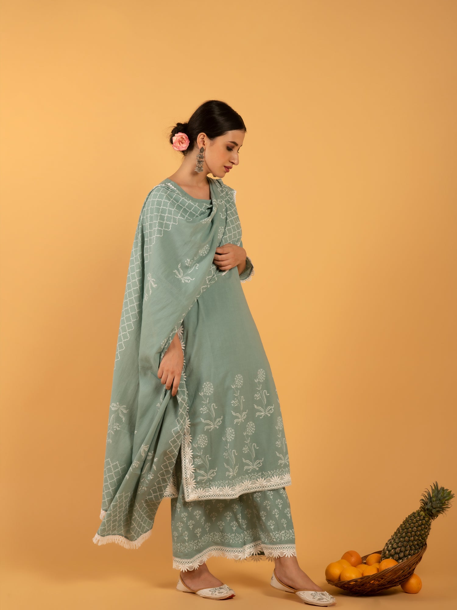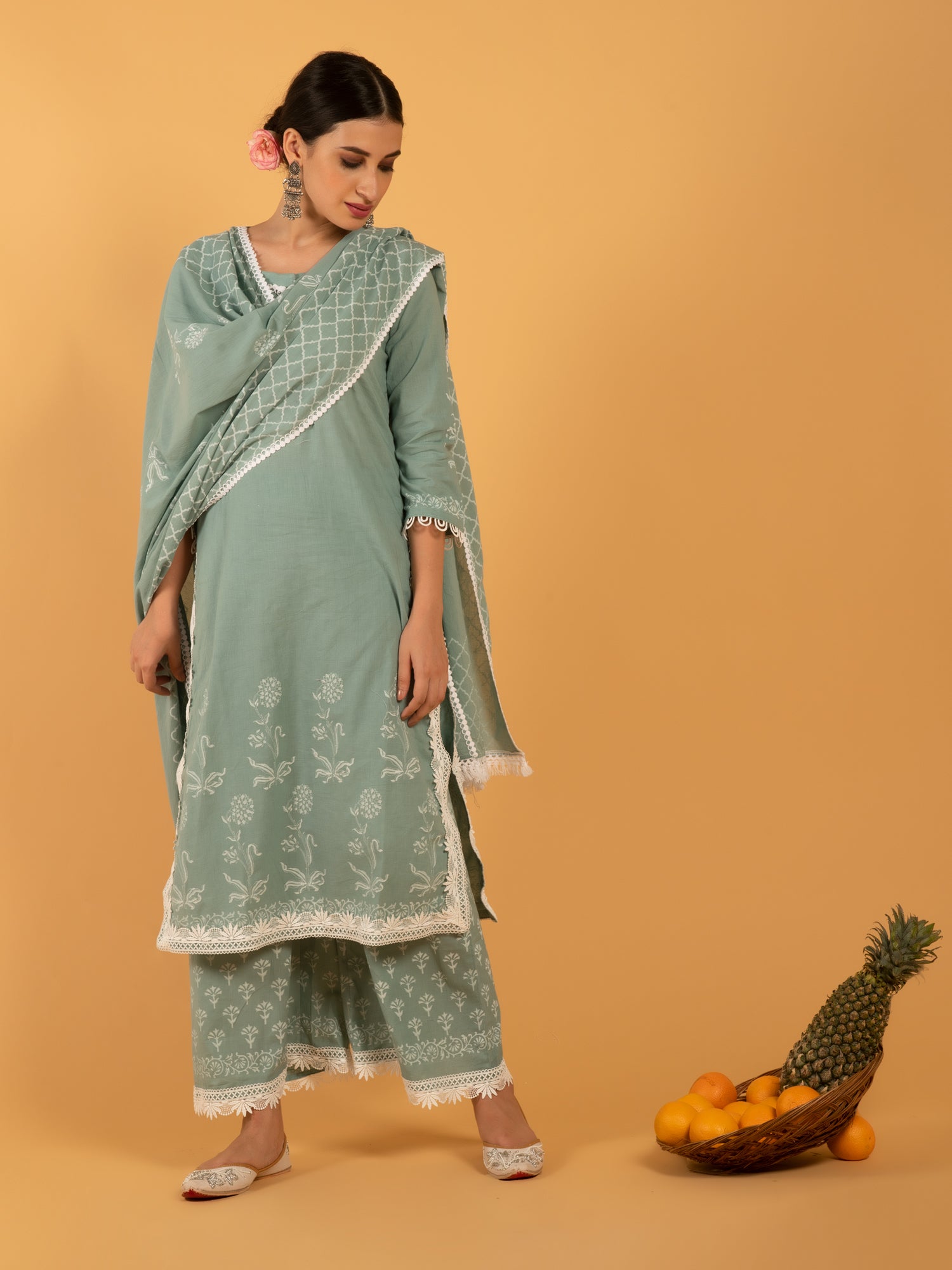 An Elegant & muted teal base ensemble, printed in white khari print set on a light cotton fabric.
