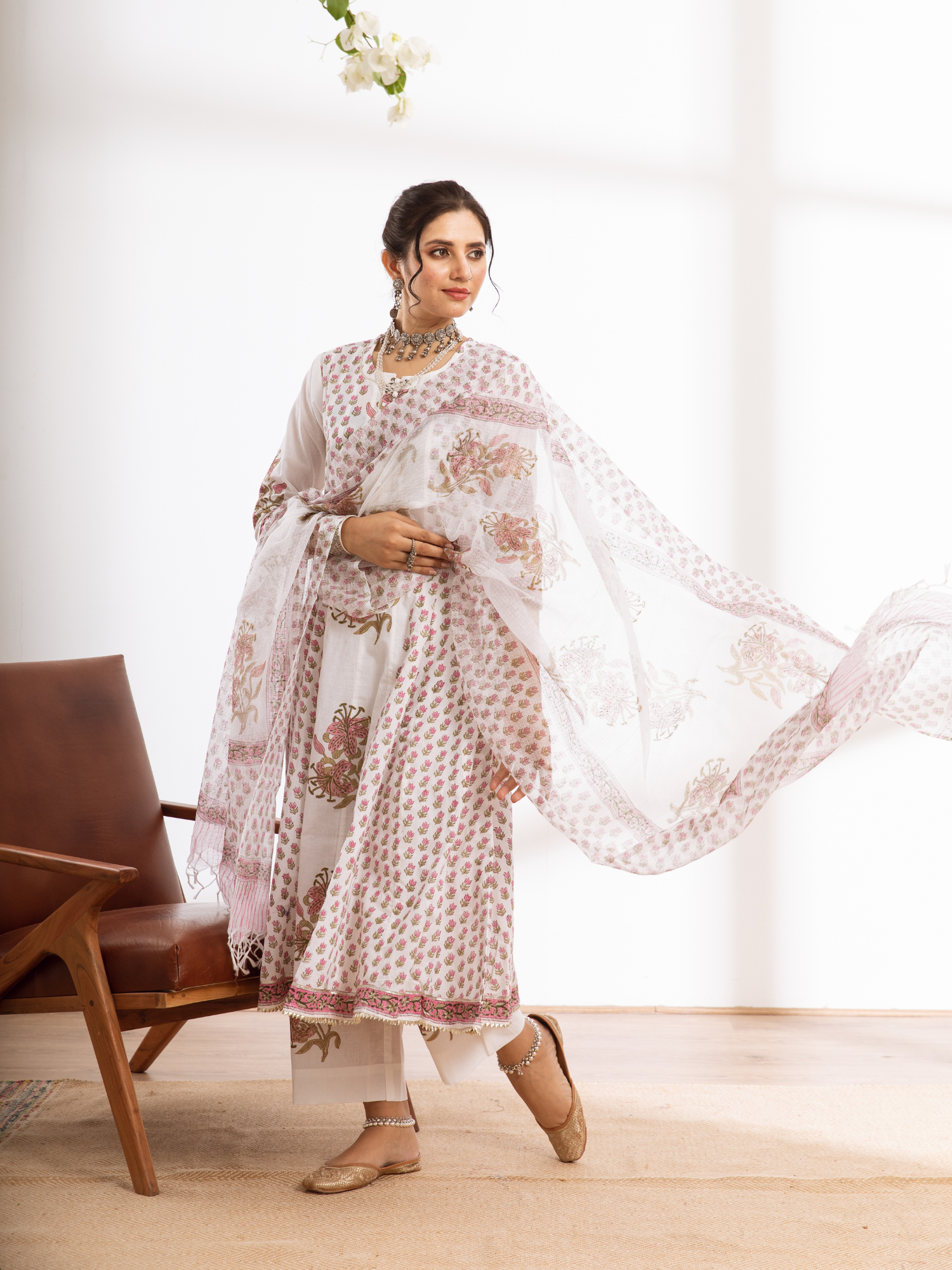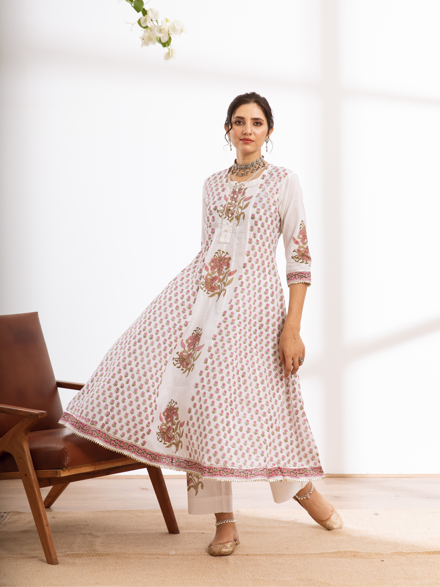 KURTI - Kalidar with hand block printed booti and jaal design, booti highlighted with gold khari and finished with light gota detailing.