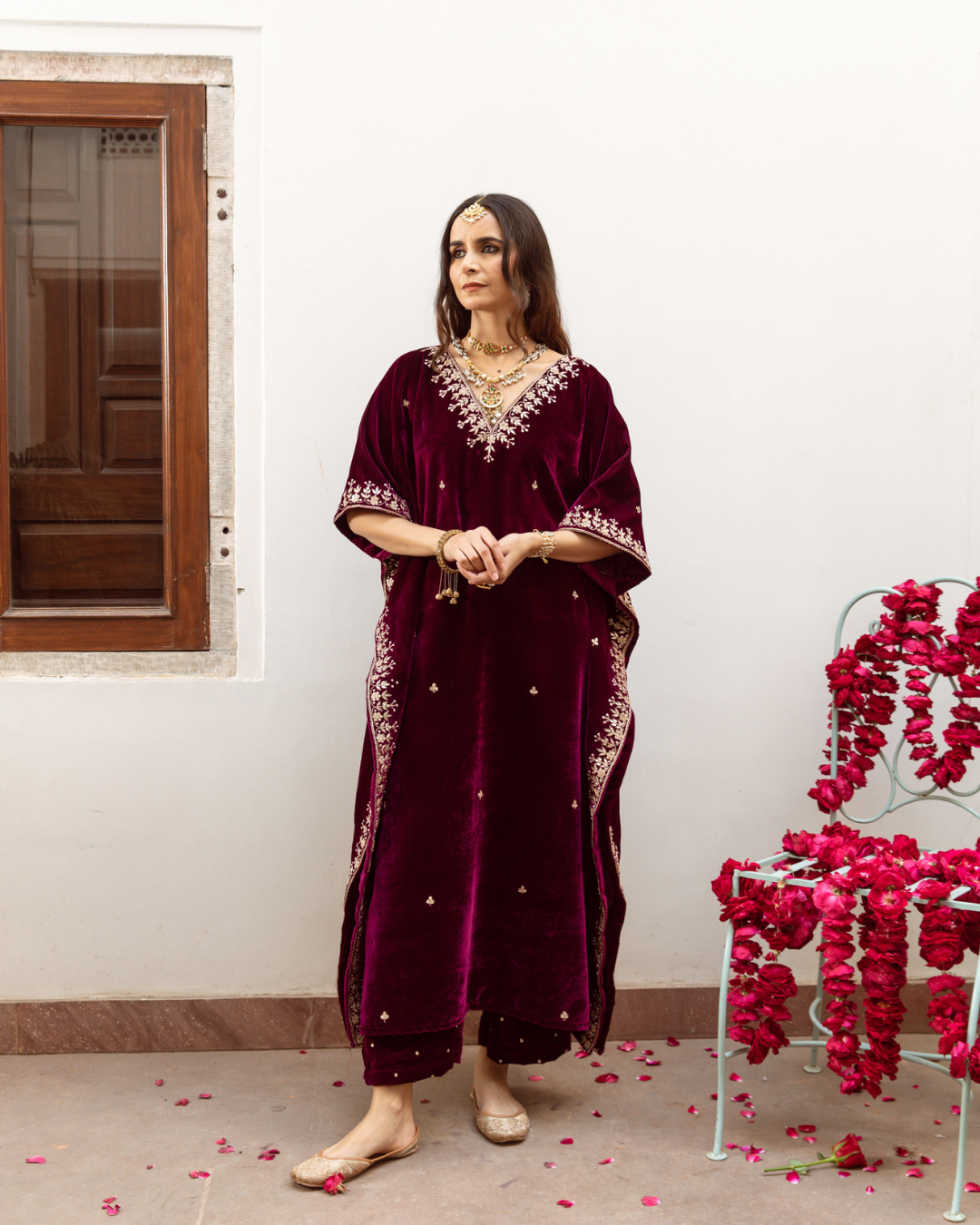 KAFTAN - A hand-dyed velvet silk kaftan is embellished with zardozi and marodi and gota patti work.