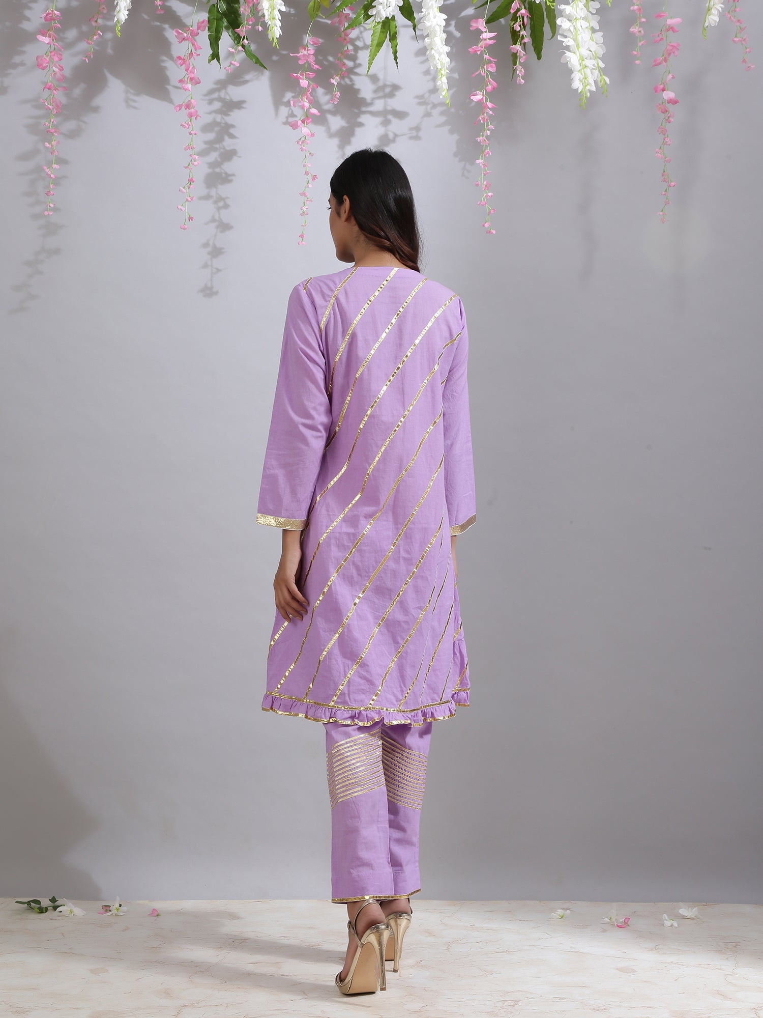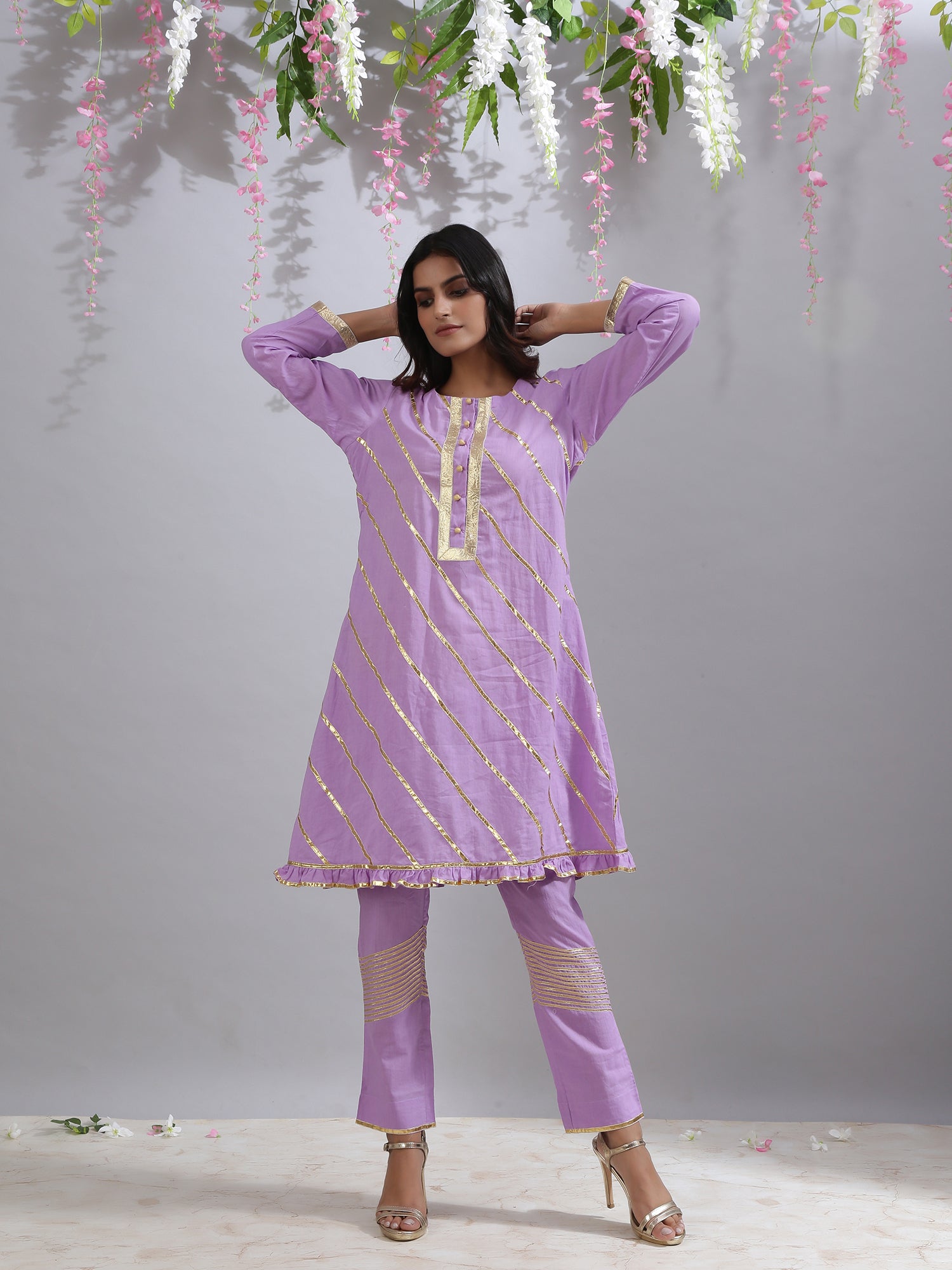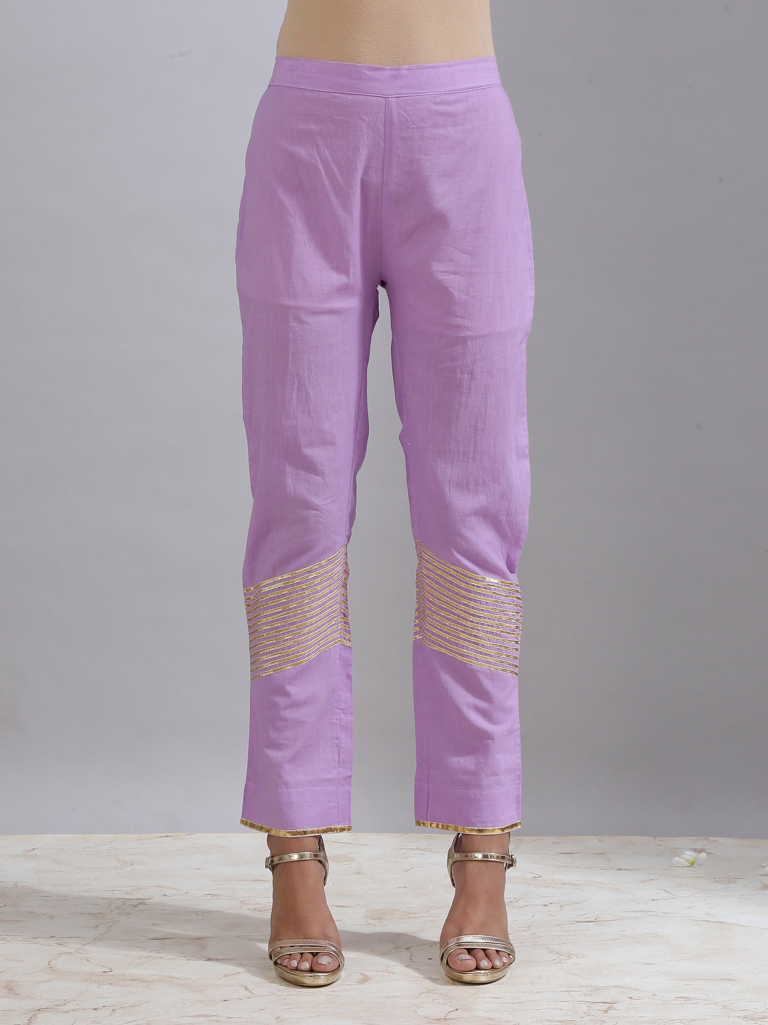 Lavender straight cotton pants with dainty gota stripes detailing for the perfect festive touch. Style it with your favourite basic white kurta or our lavender tunic for an instant lift me up festive mood. |
