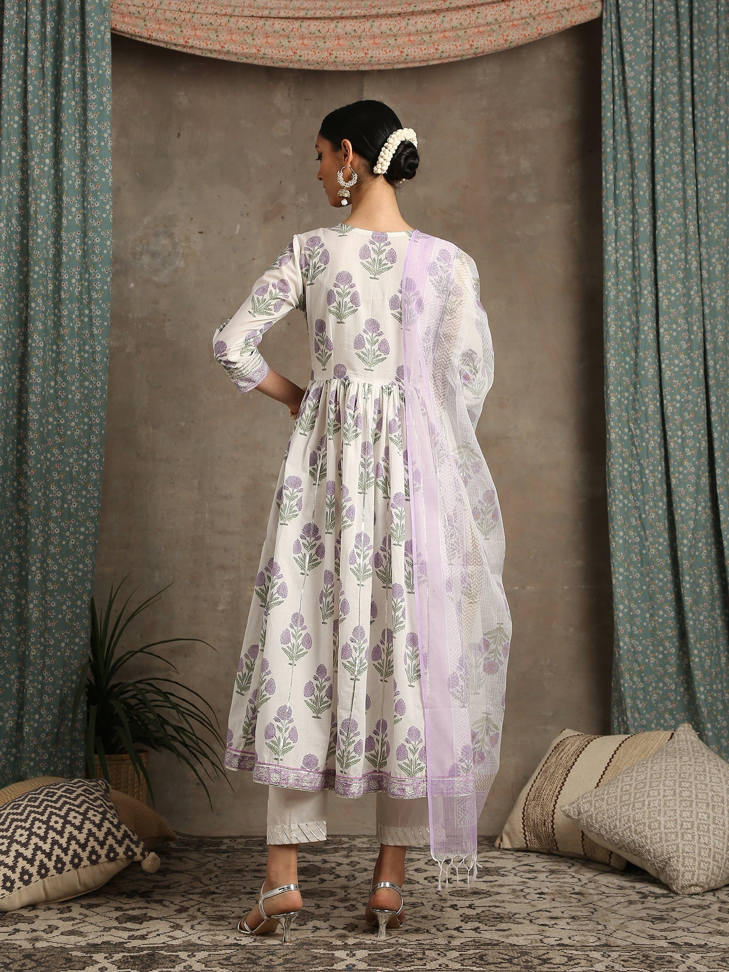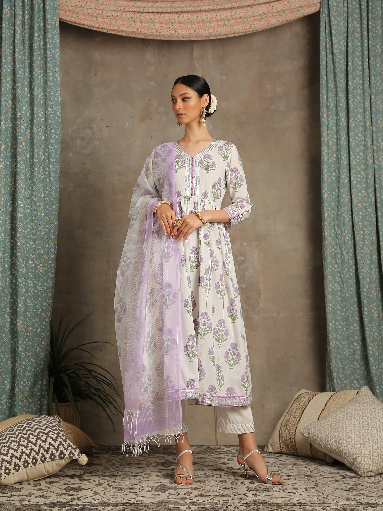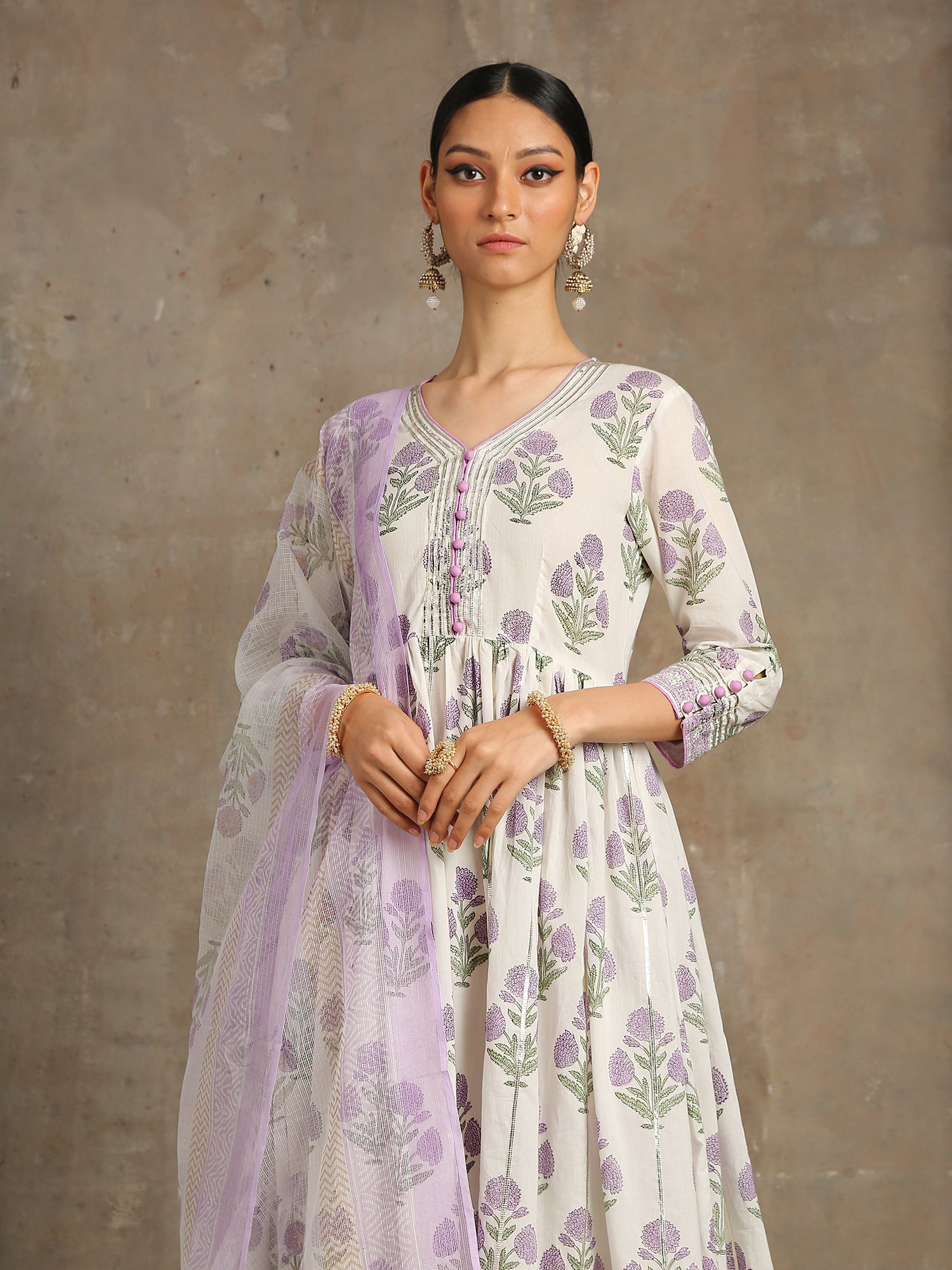 Lavender White Printed Cotton Gathered Kurta Set RTS