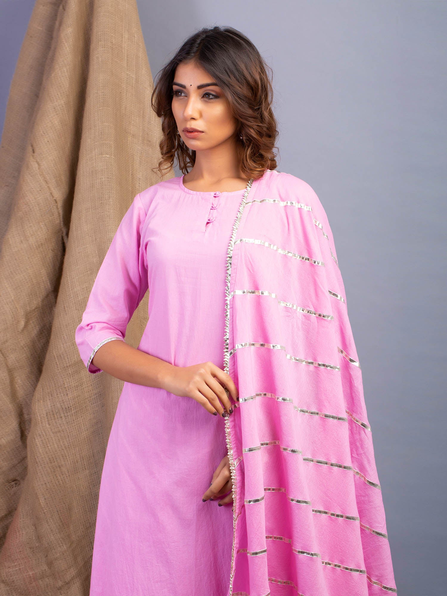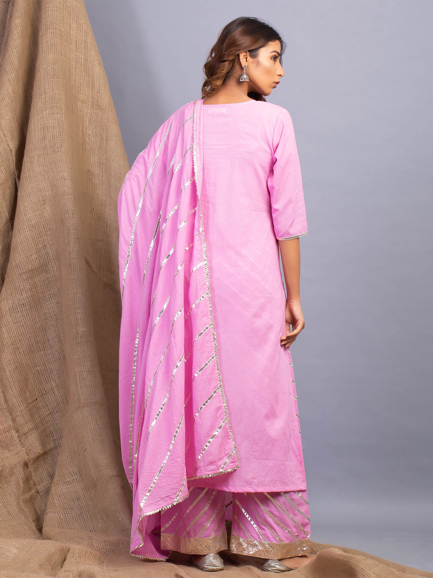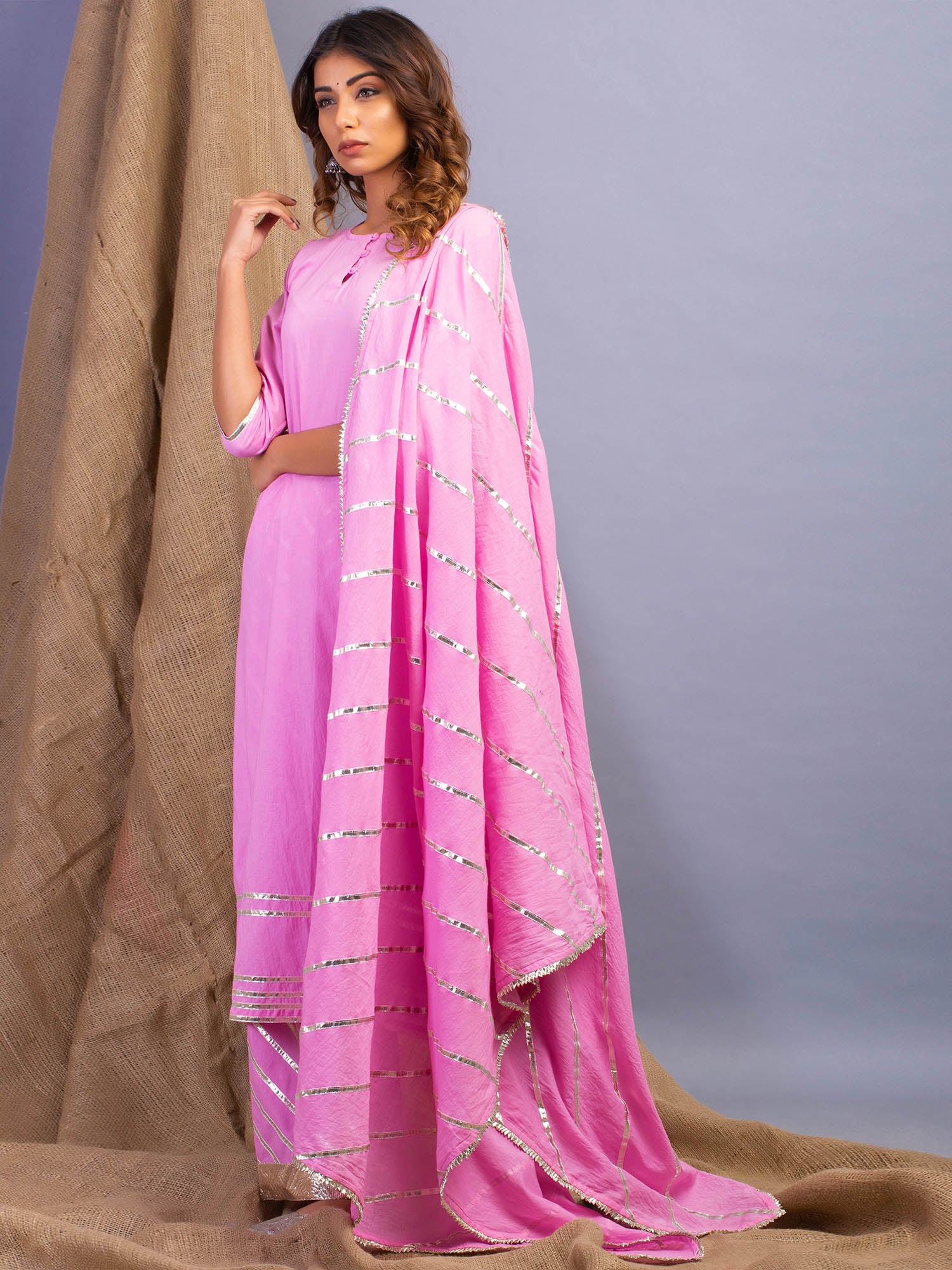 KURTA- A relaxed A-line silhouette with light gota highlights on sleeves and hem.Â