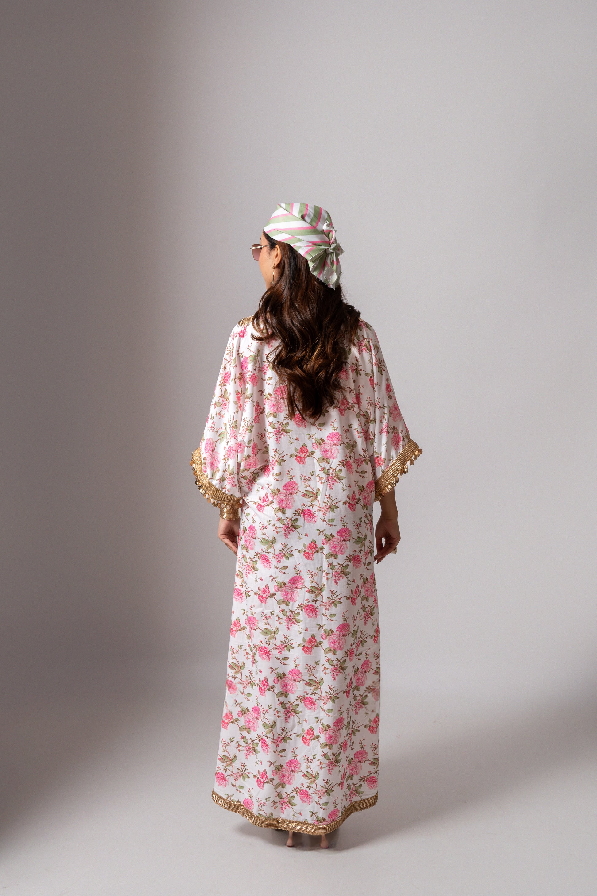 Kaftan dress with handwork lace detailing on neck, sleeves and hem. Finished with coin and pearl tassels on the sleeves.