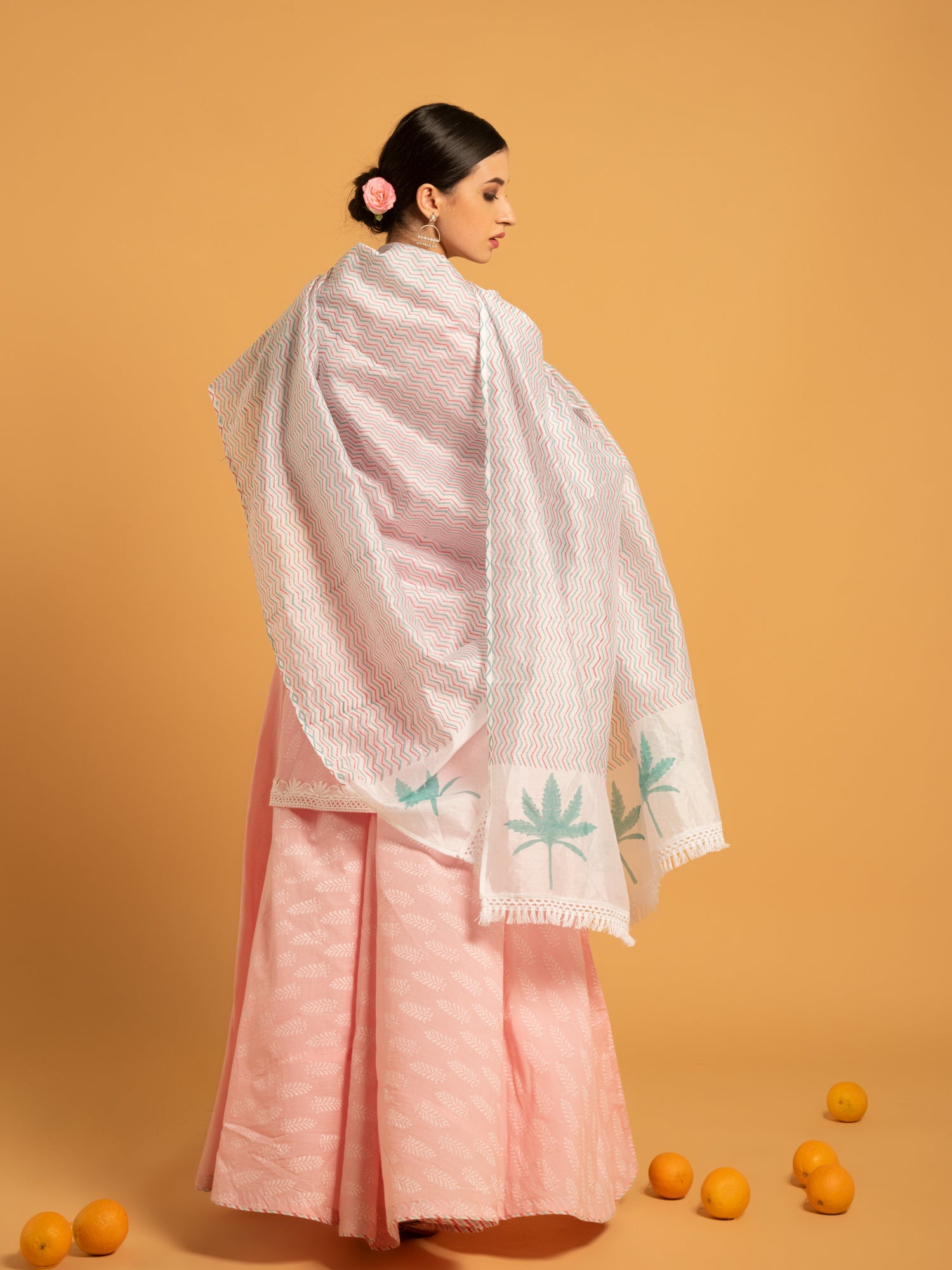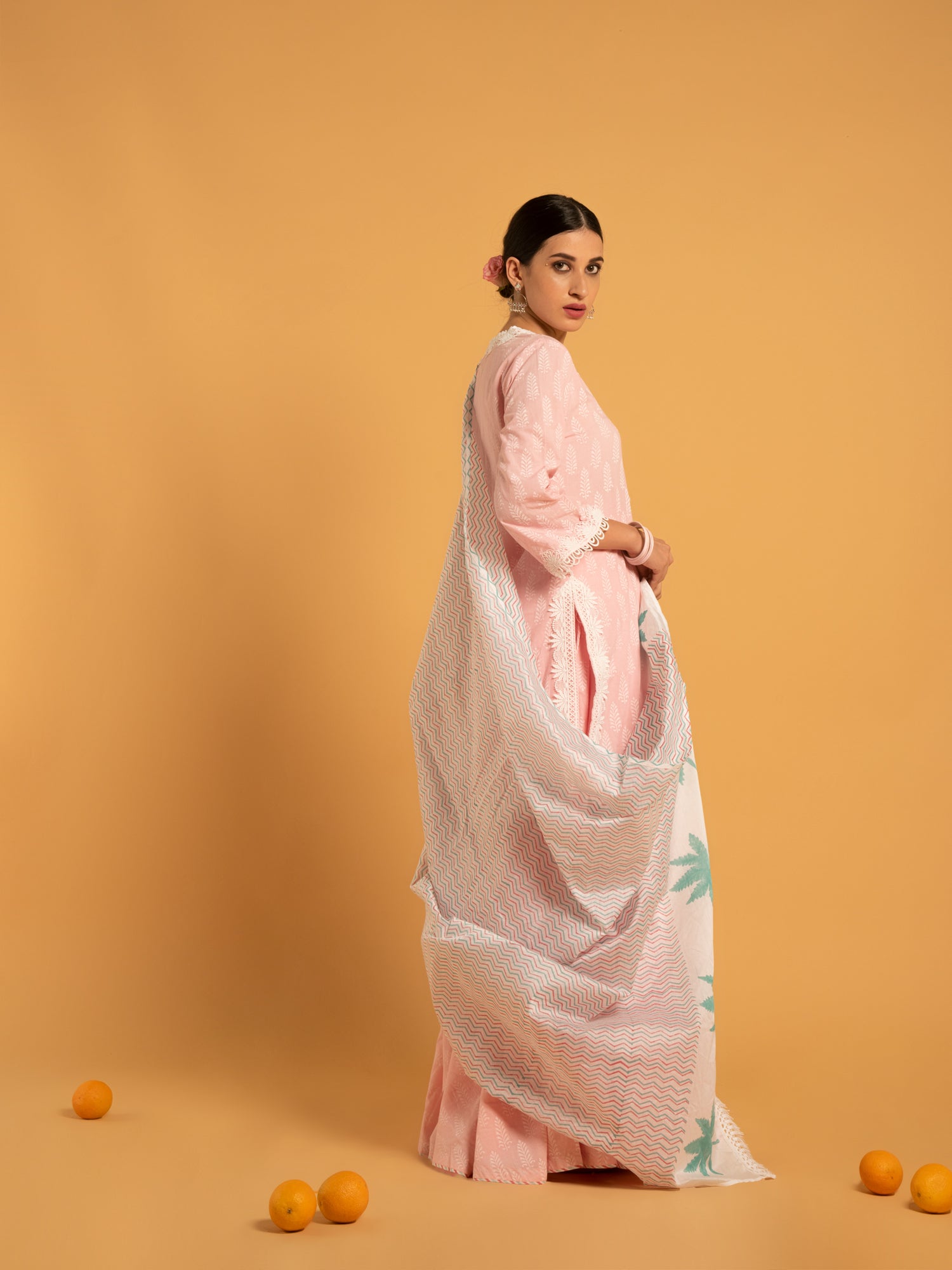 A blush pink kurti enriched with white khari print all across, set on pure chanderi.