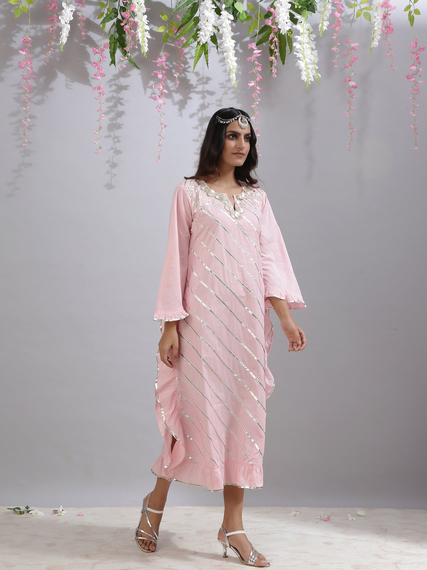 Pink kaftan dress/tunic with gota highlights all over. Side finishing with handmade fringe lace. Style it with your favorite festive bottom for a formal Indian look or a festive fanny pack for a night out. |