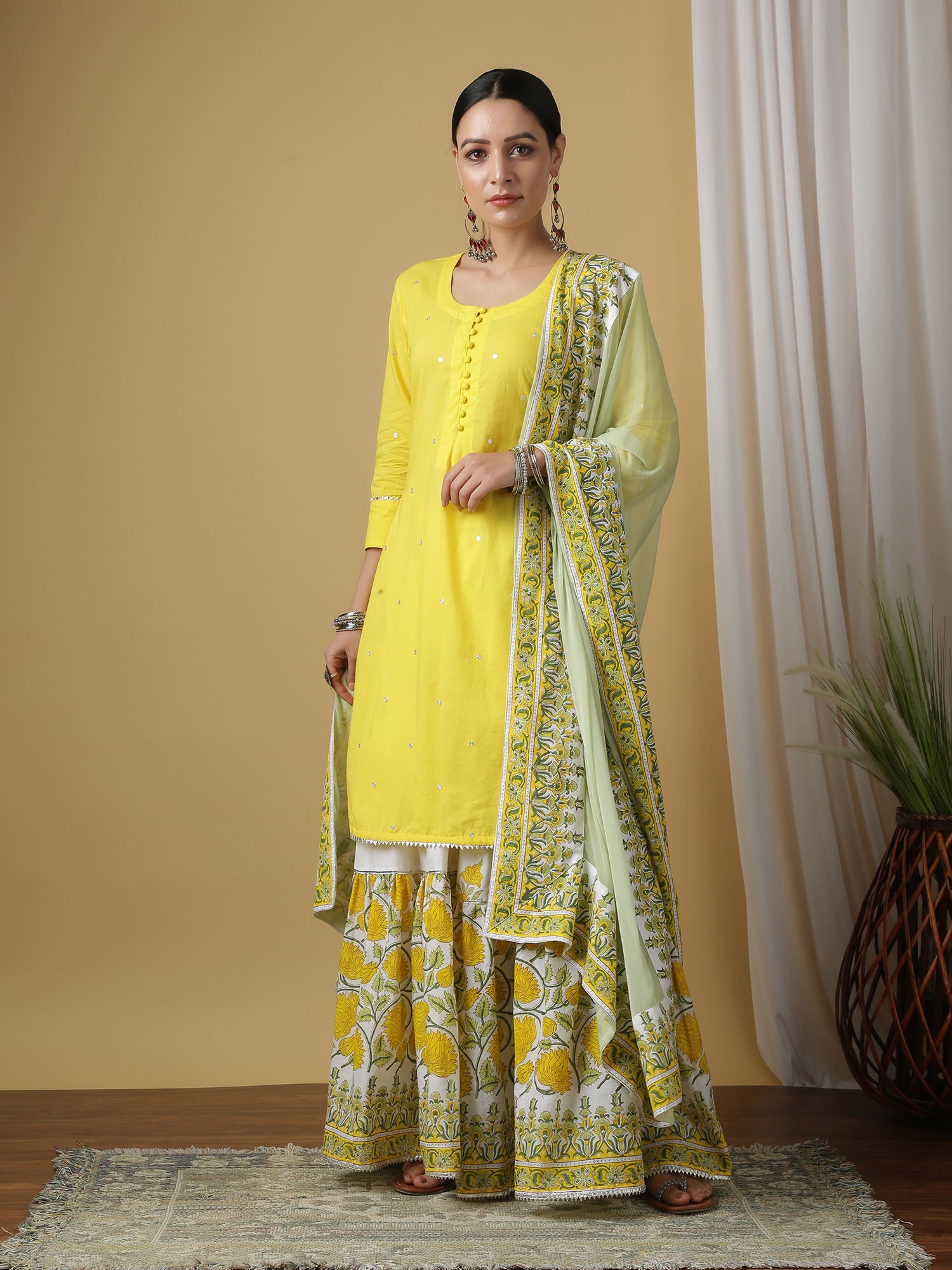 KURTA- Cotton hand embroidered kurta in a contrast yellow finished with gota detailing on the hem and sleeves.