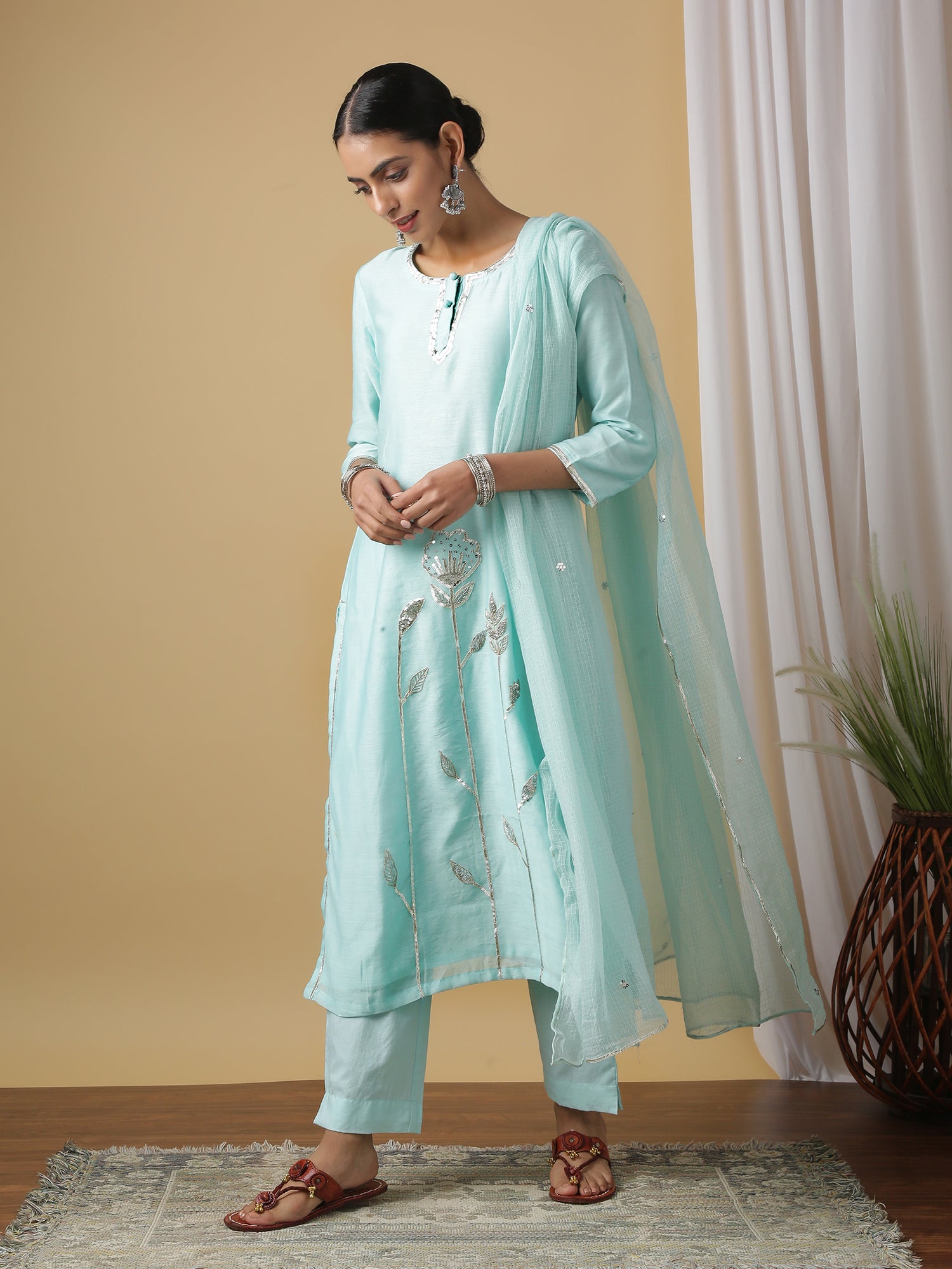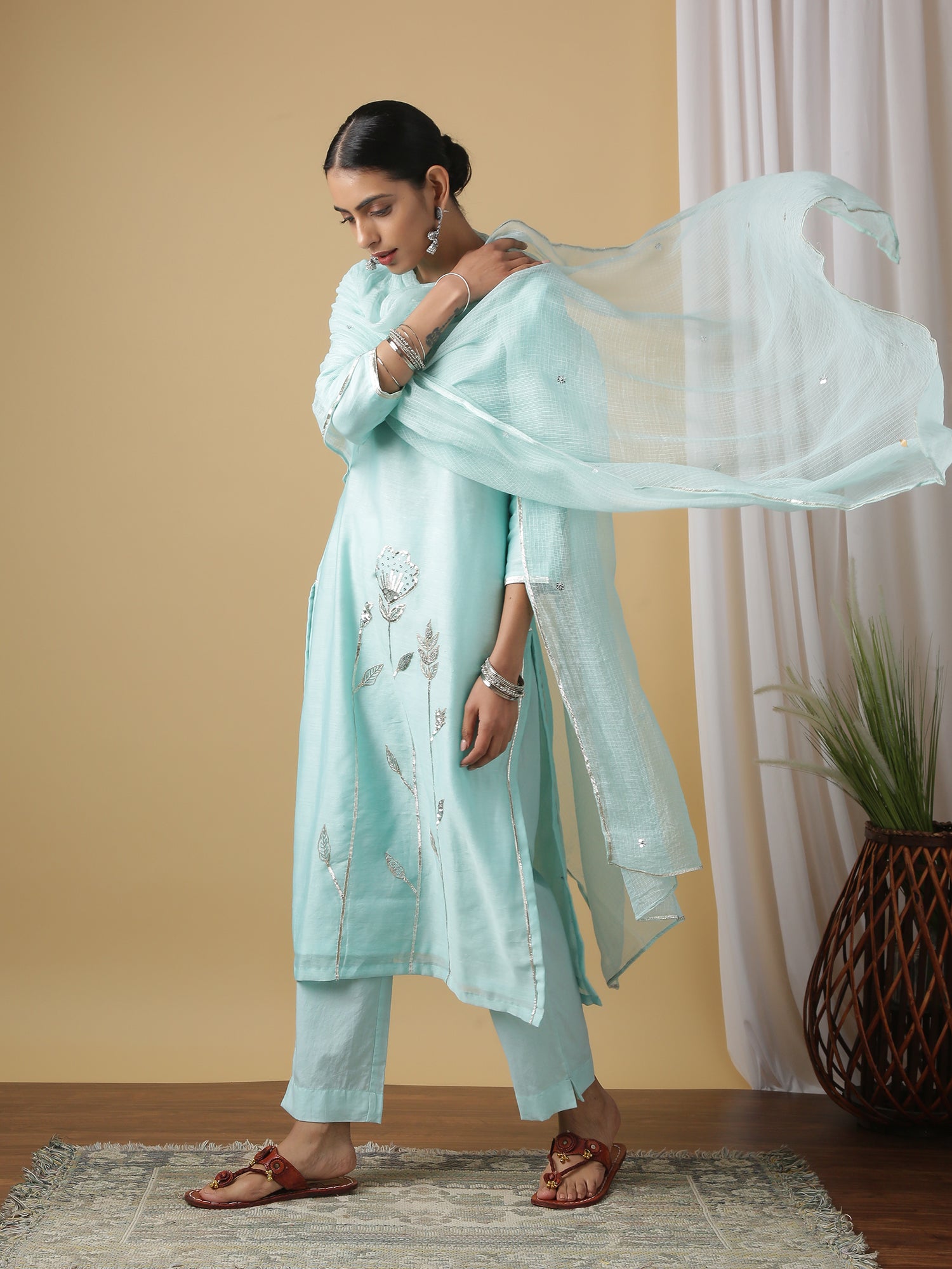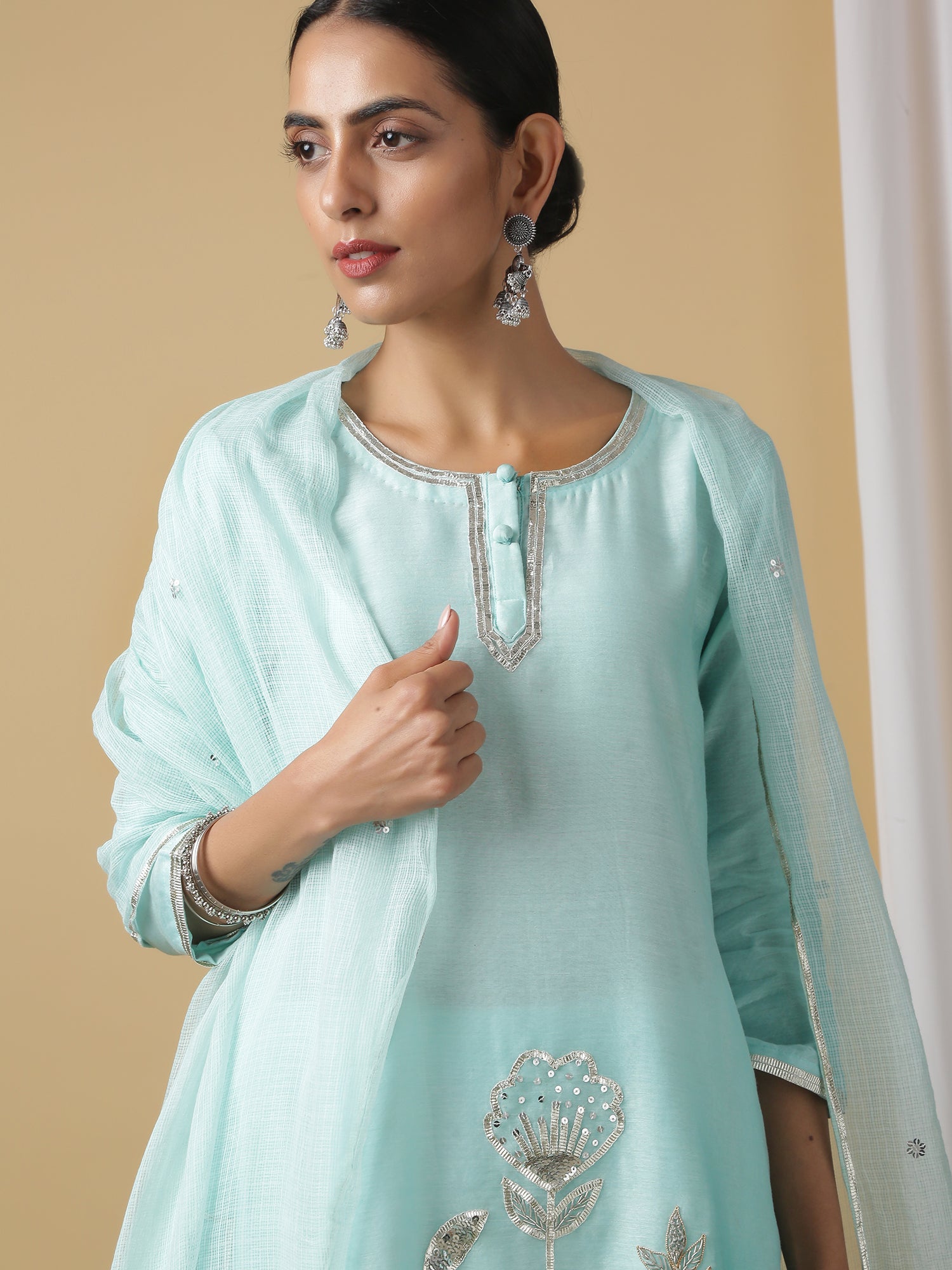 KURTA- Chanderi kurta in a soothing light blue with embroidered flower stems in gota, sequins and zardozi.