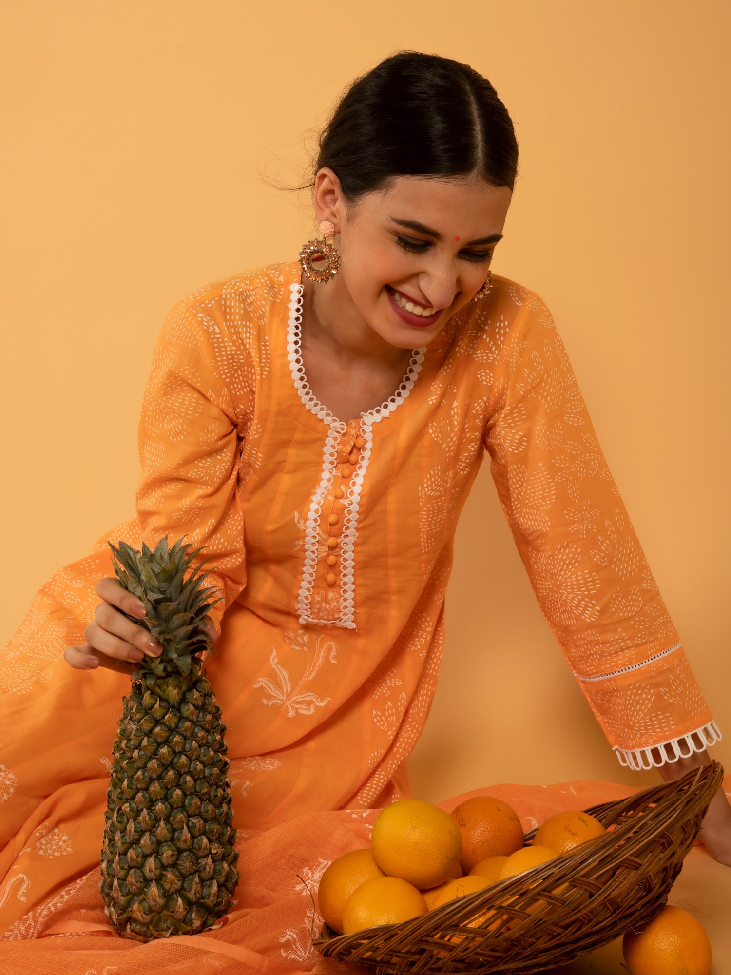 A summer bright orange kurta enriched with white khari print set on a light cotton base.