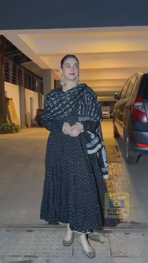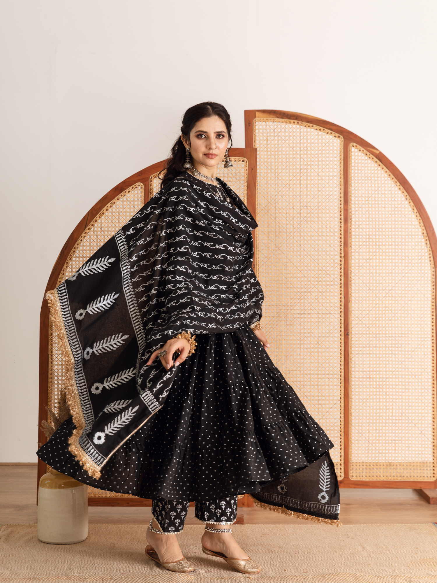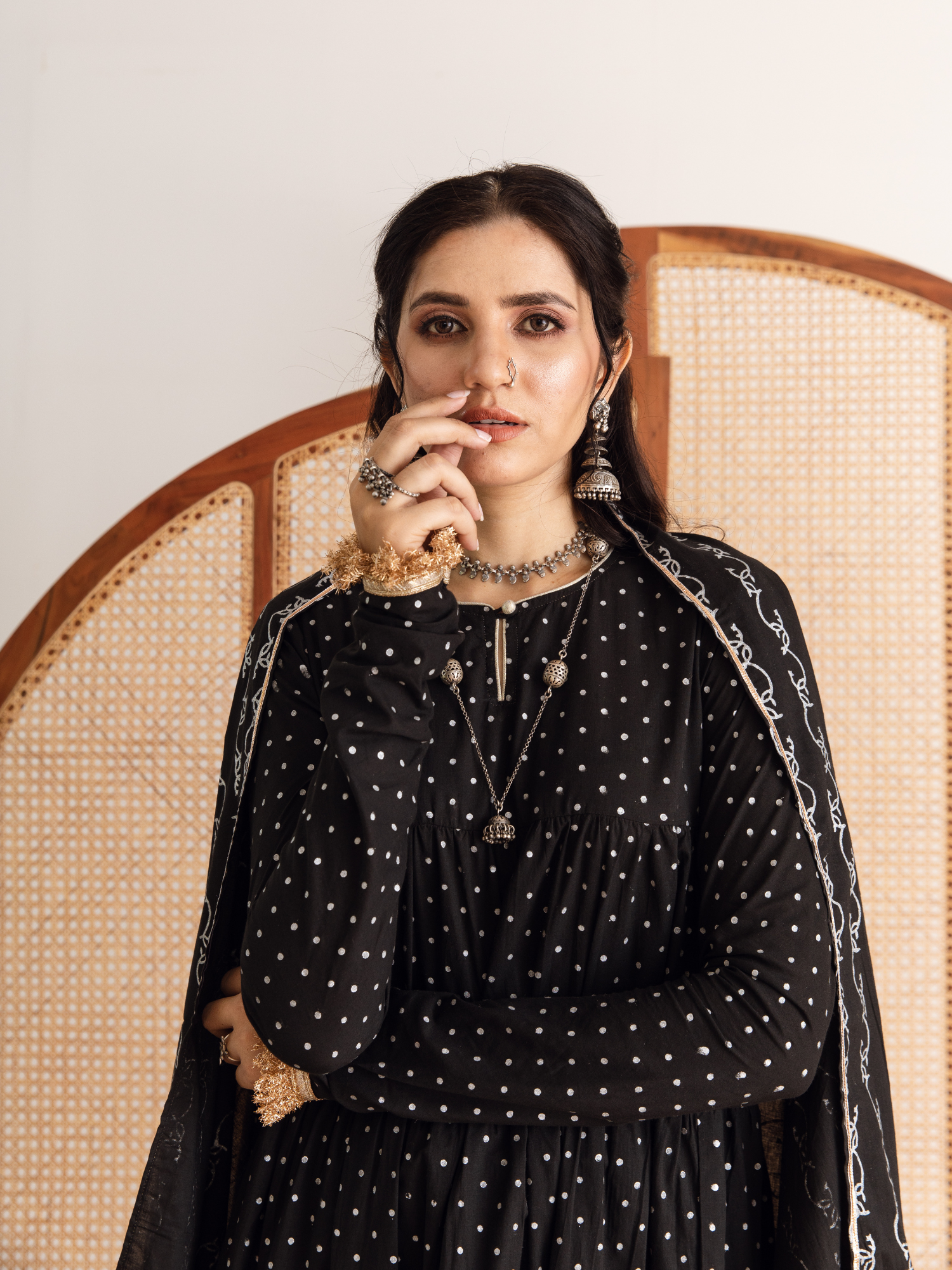 KURTI - A summer stunner black tiered kurti with polka khari print finished with churidar sleeves and gota lace detailing.