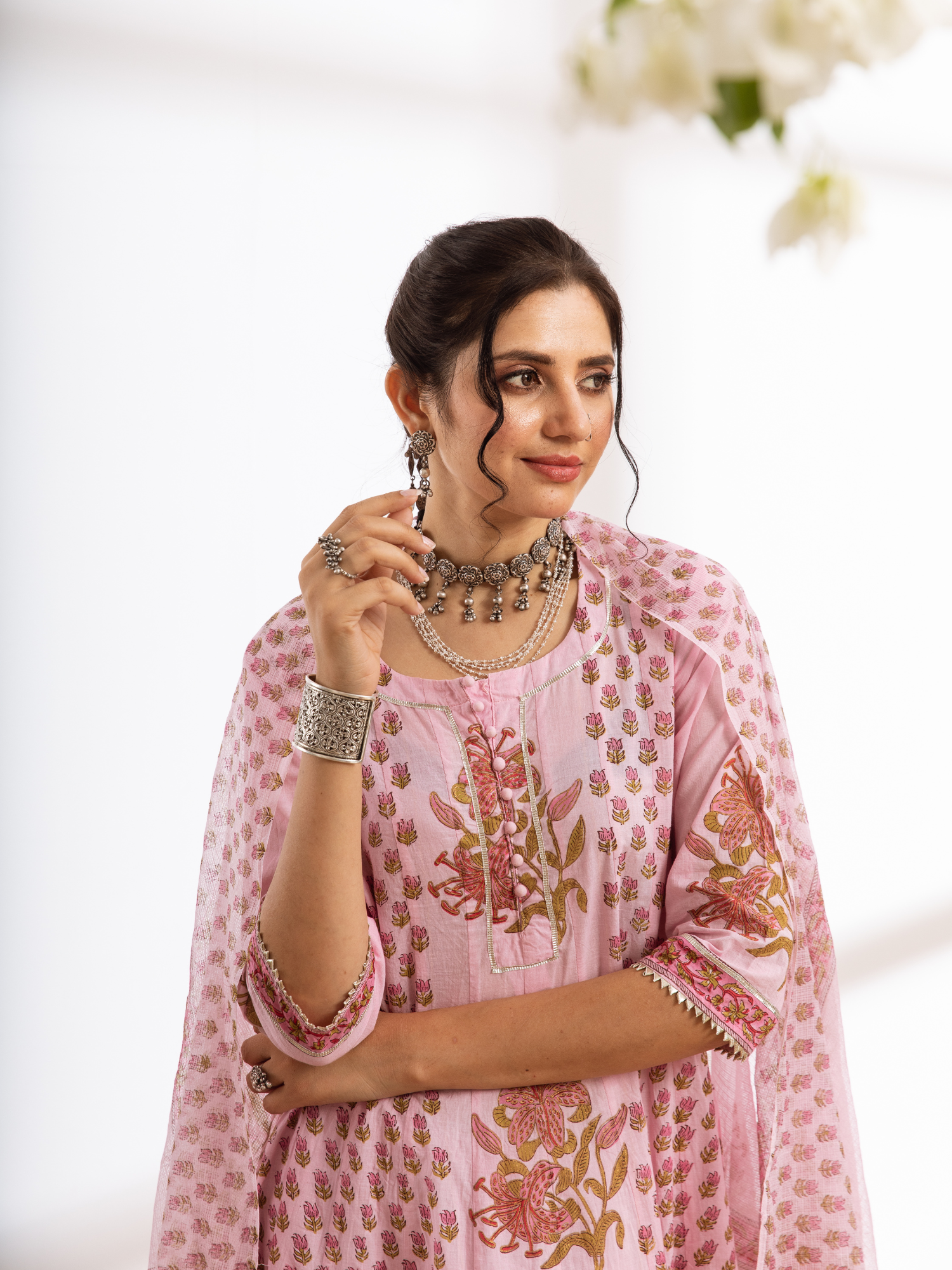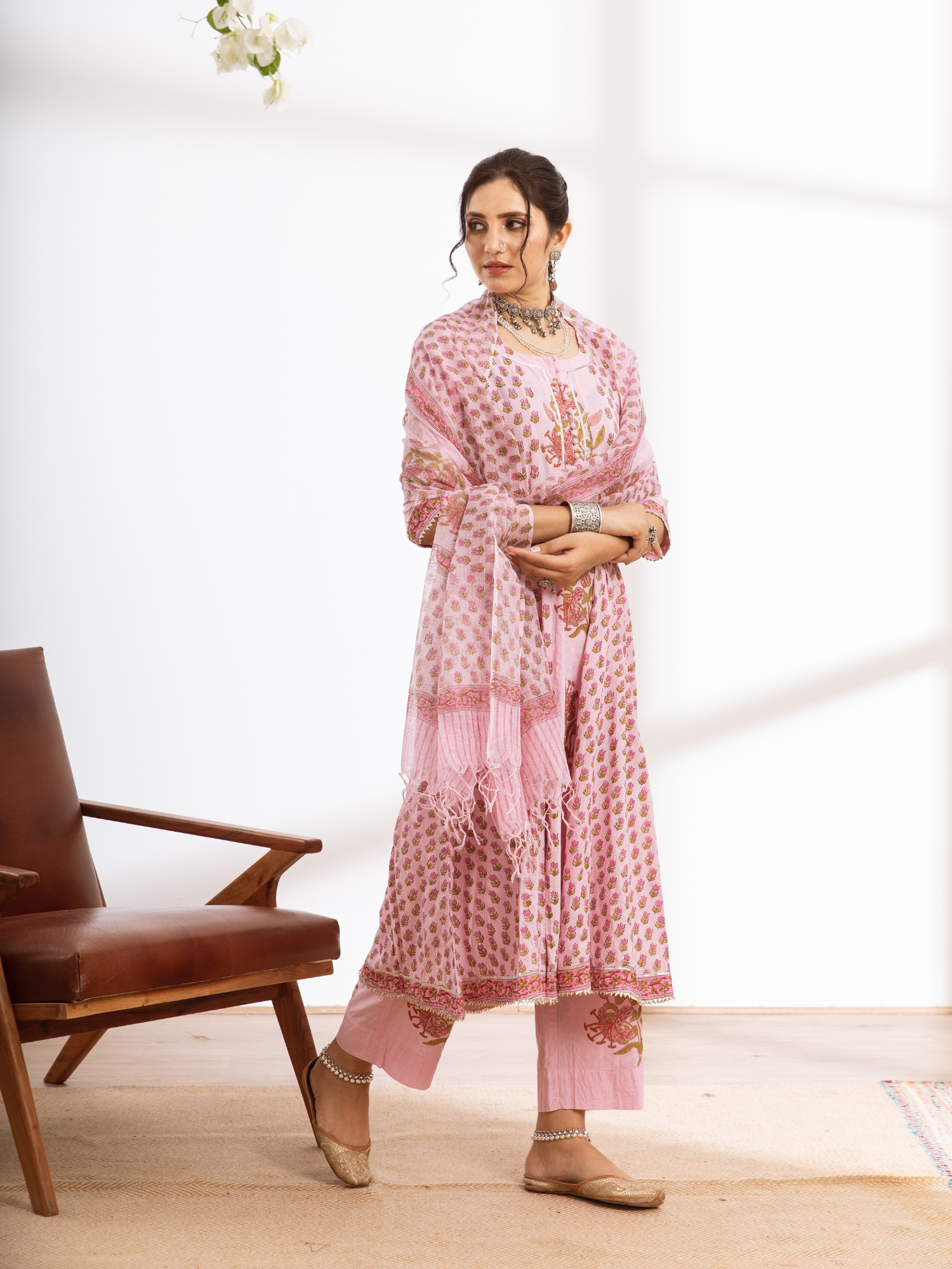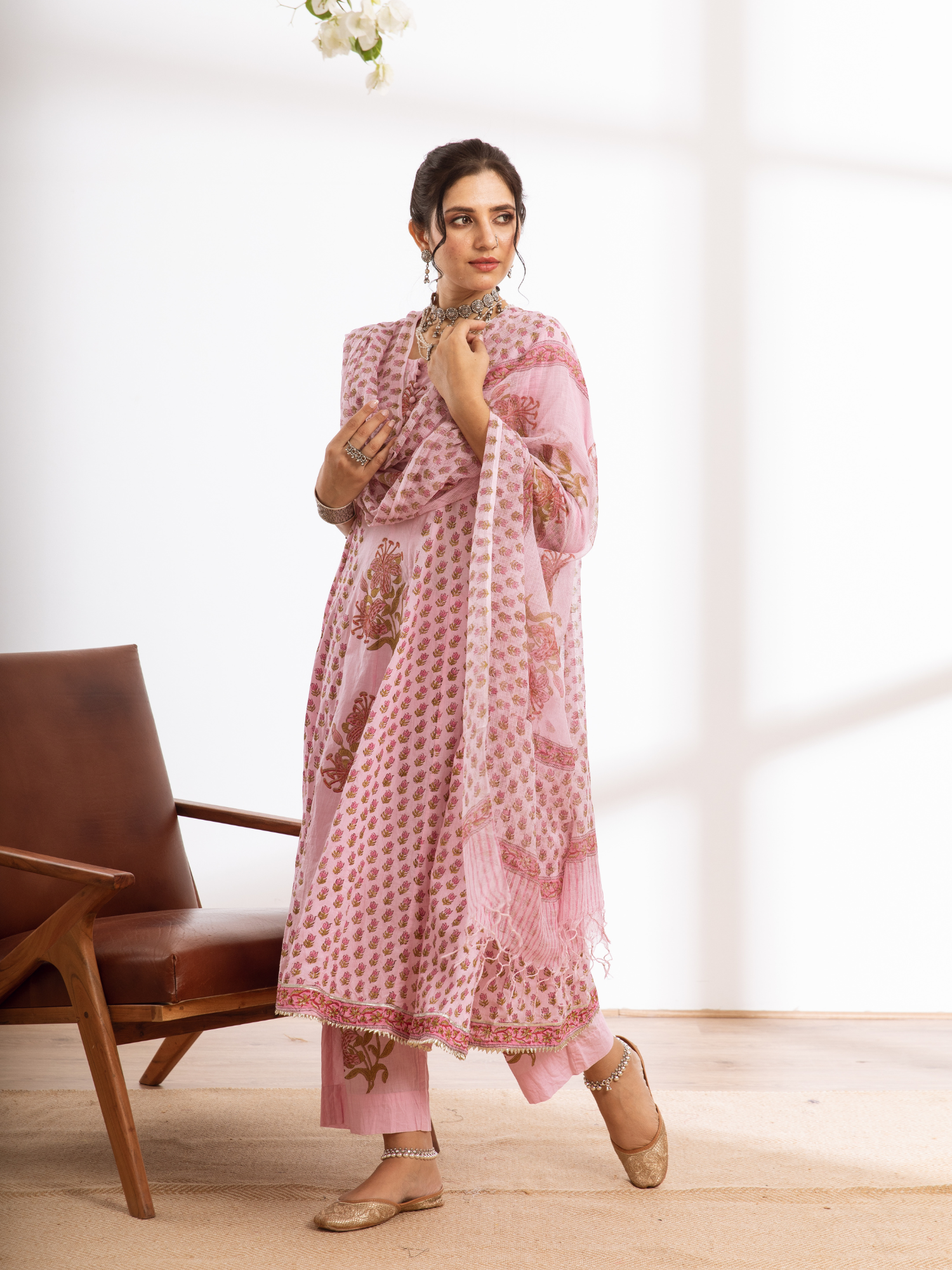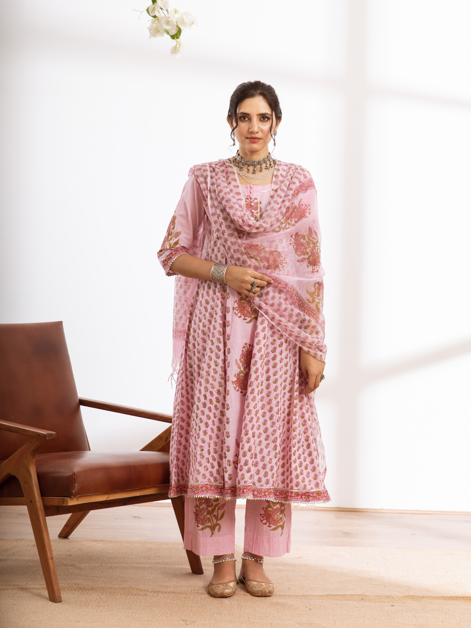 KURTI - Kalidar with hand block printed booti and jaal design, booti highlighted with gold khari and finished with light gota detailing.