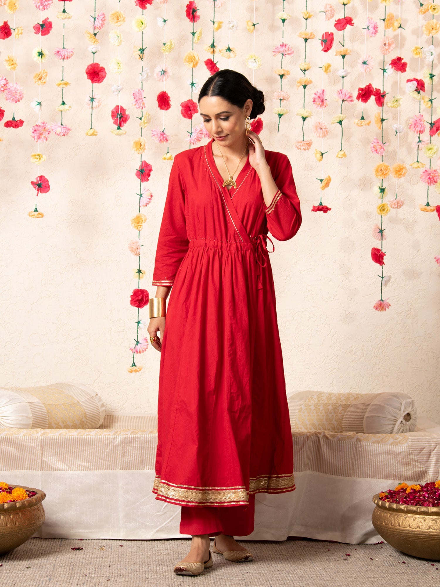 KURTA: This stunning red cotton kalidar angrakha kurta is detailed with with delicate badla work on neck and sleeves and is finished with gold gota lace detailing at the hem.