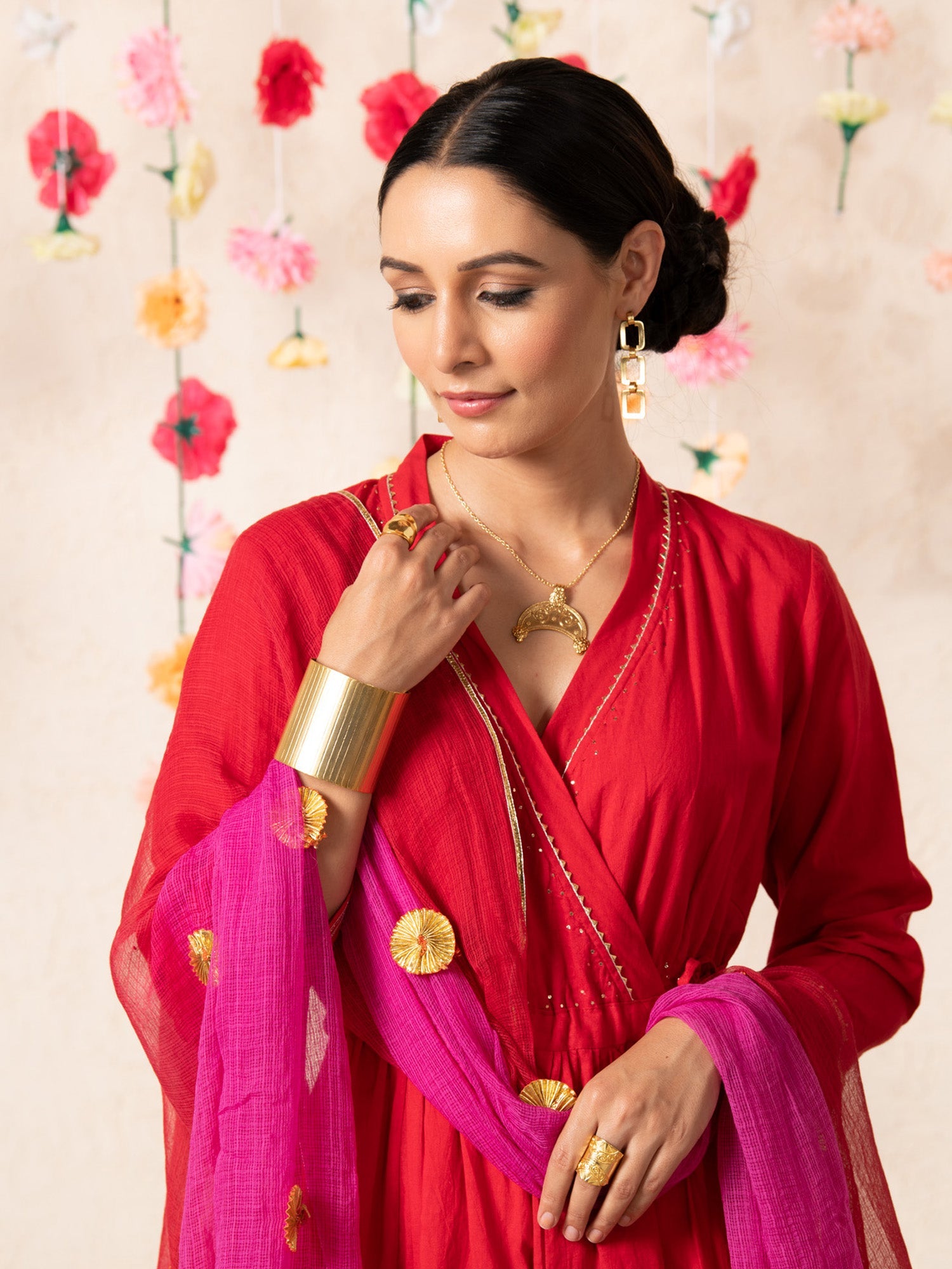 DUPATTA: It is finished with a beautiful magenta and red ombre dyed kota doria dupatta detailed with charkhi gota flowers and gota edging.