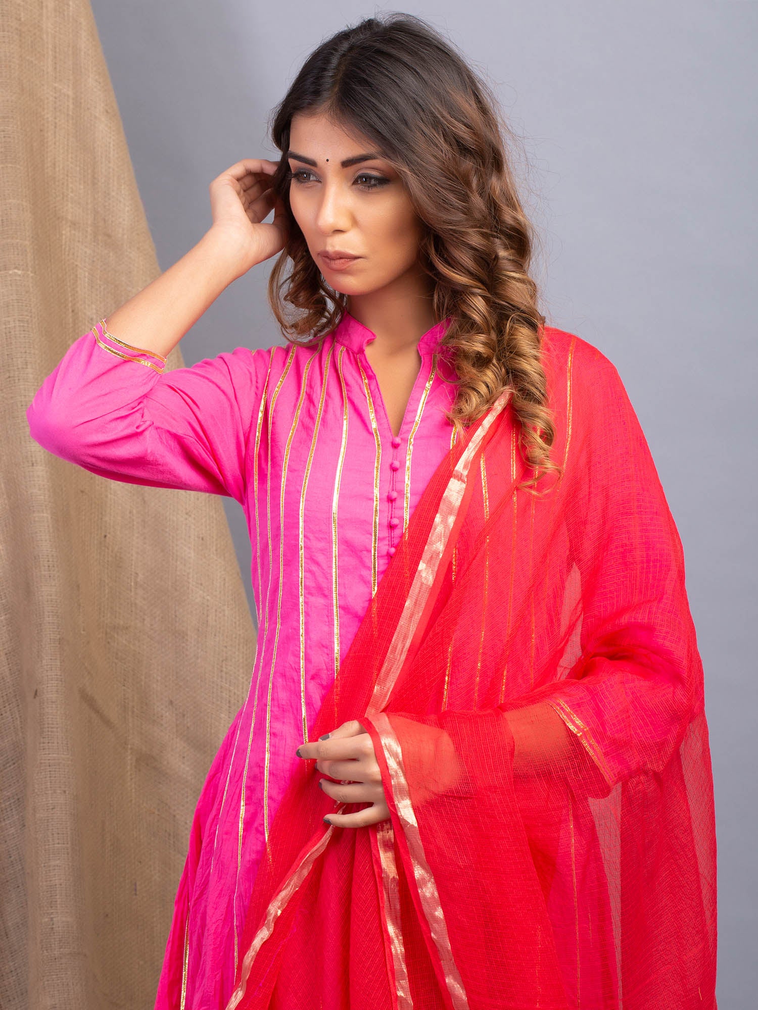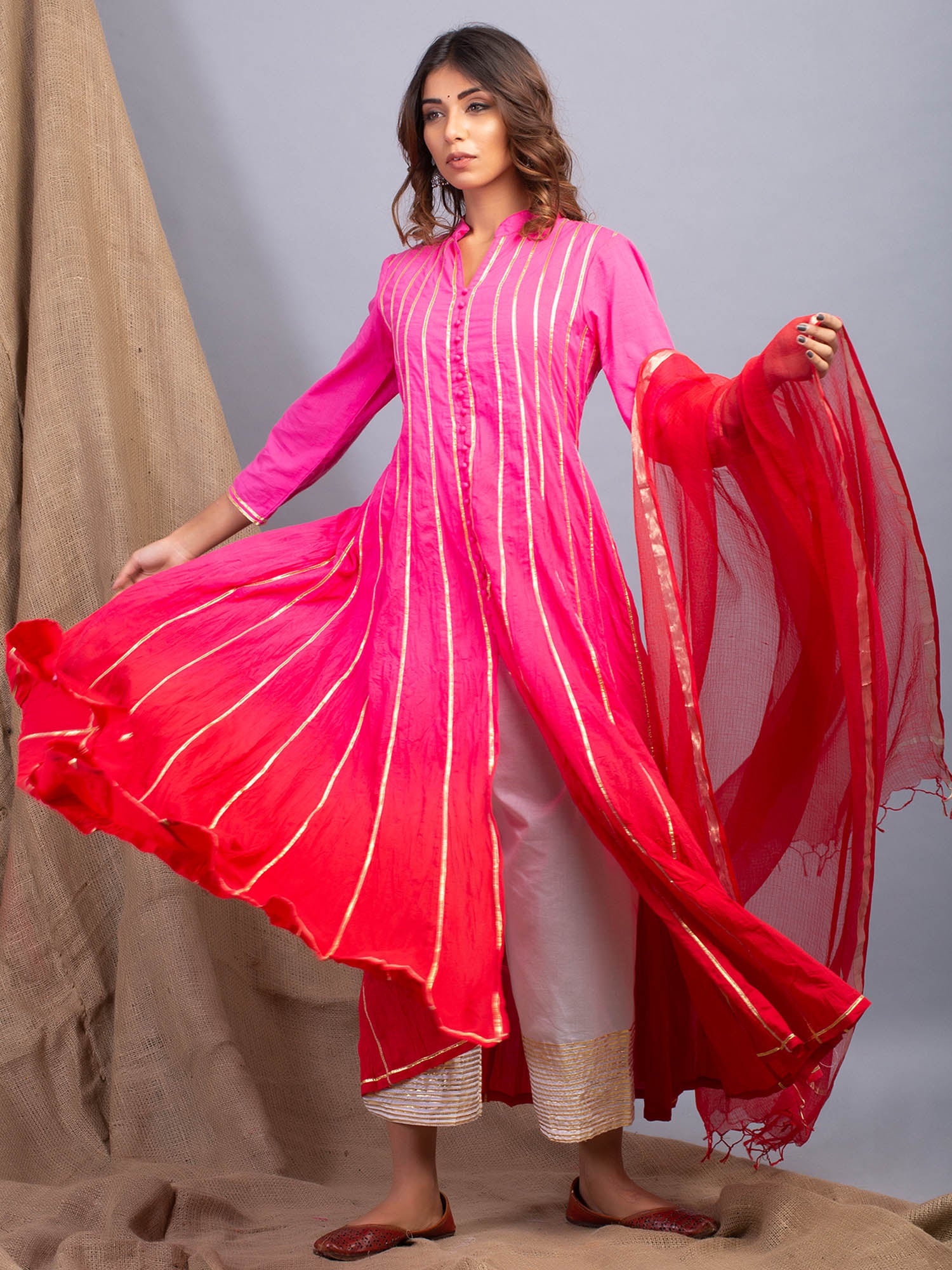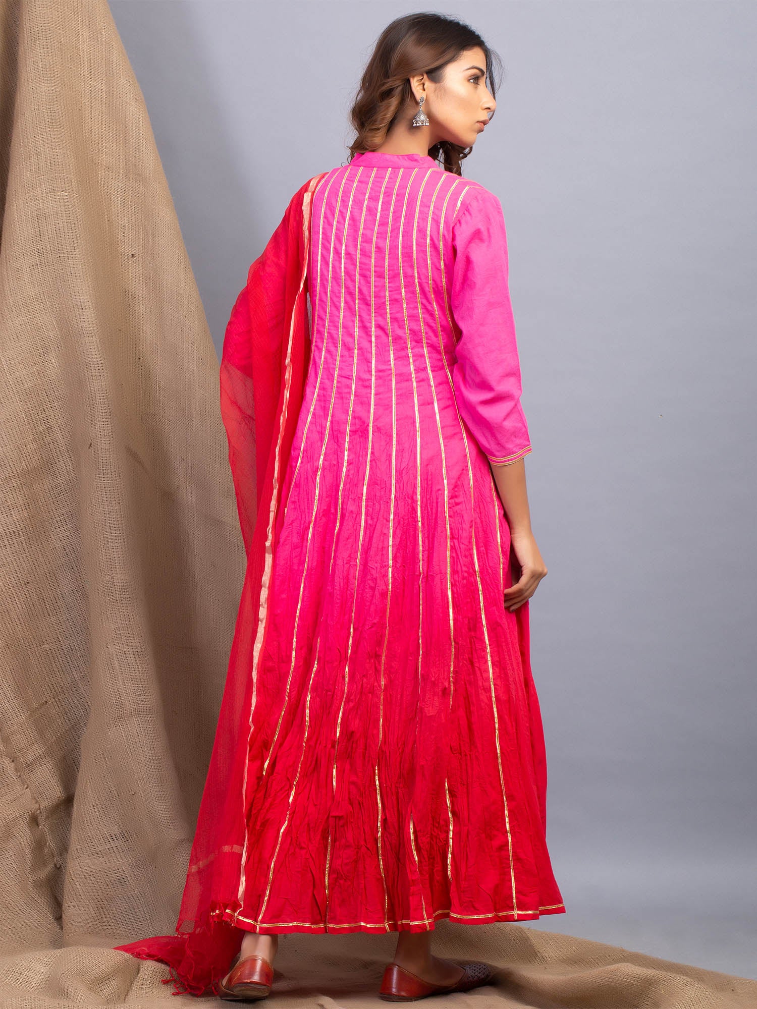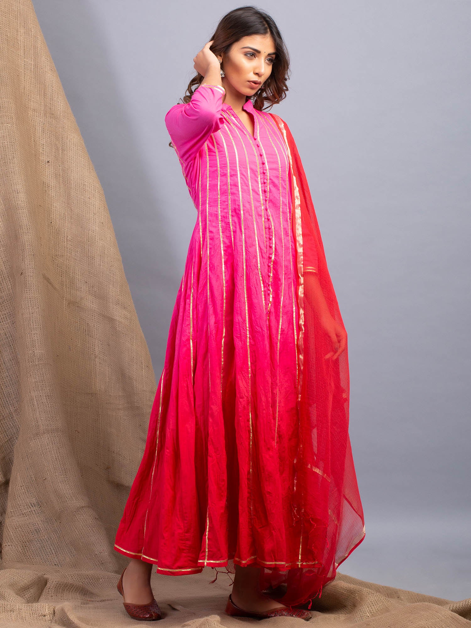KURTA- Crush cotton kurta in a traditional 36 kali ghera, hand dyed in fuchsia and red ombré dyeing. Each kali adorned with striped gota highlights.