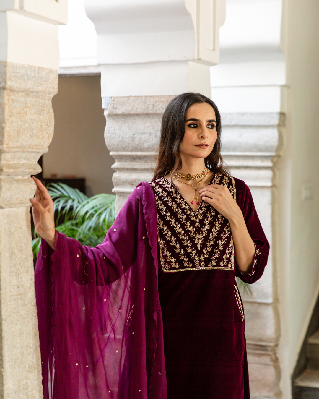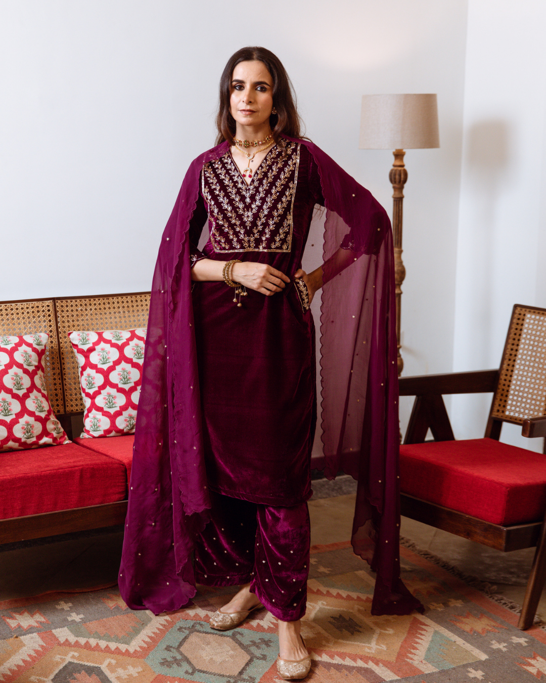 KURTA - A hand-dyed velvet kurta is embellished with zardozi and moti dana work.