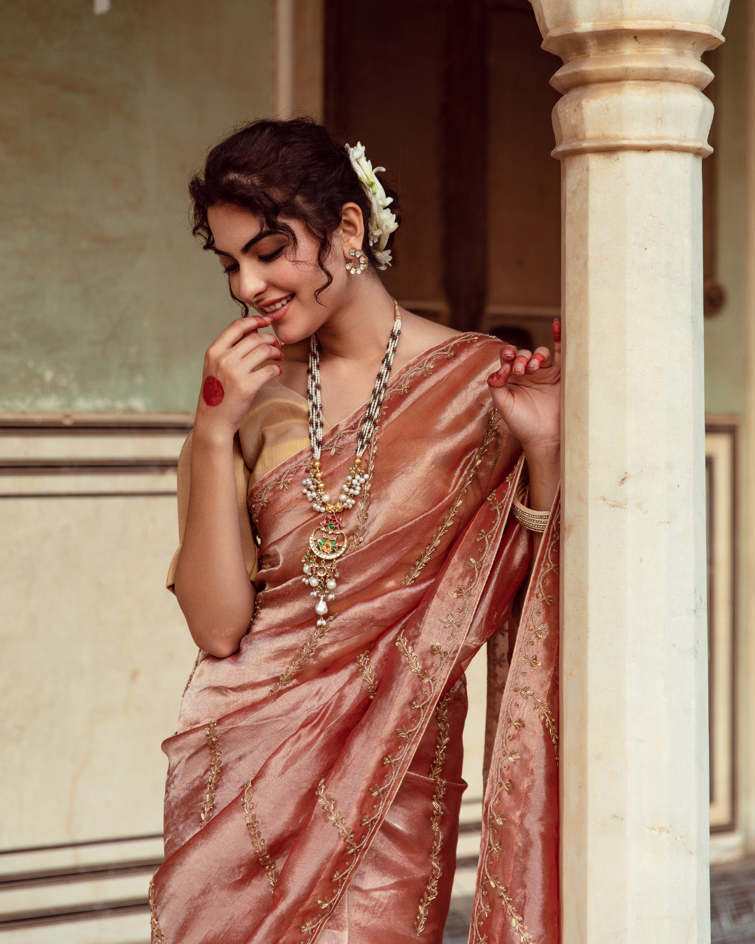 This Rust Tissue Silk Embroidered Sari exudes vintage elegance and opulence.