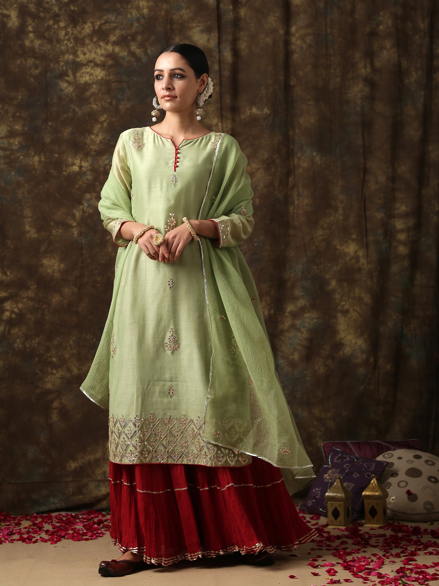 KURTA- Light green kurta in chanderi with gota embroidery inspired by the floral designs at the City Palace Jaipur, finished with contrast red piping on the neck, sleeves and slit.