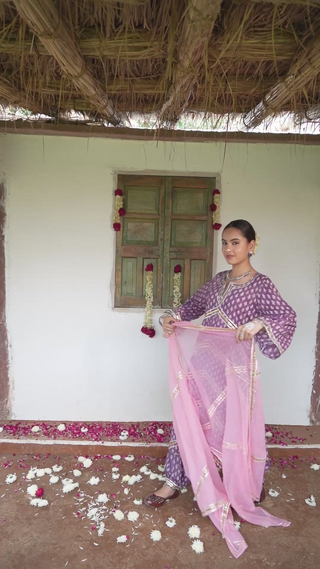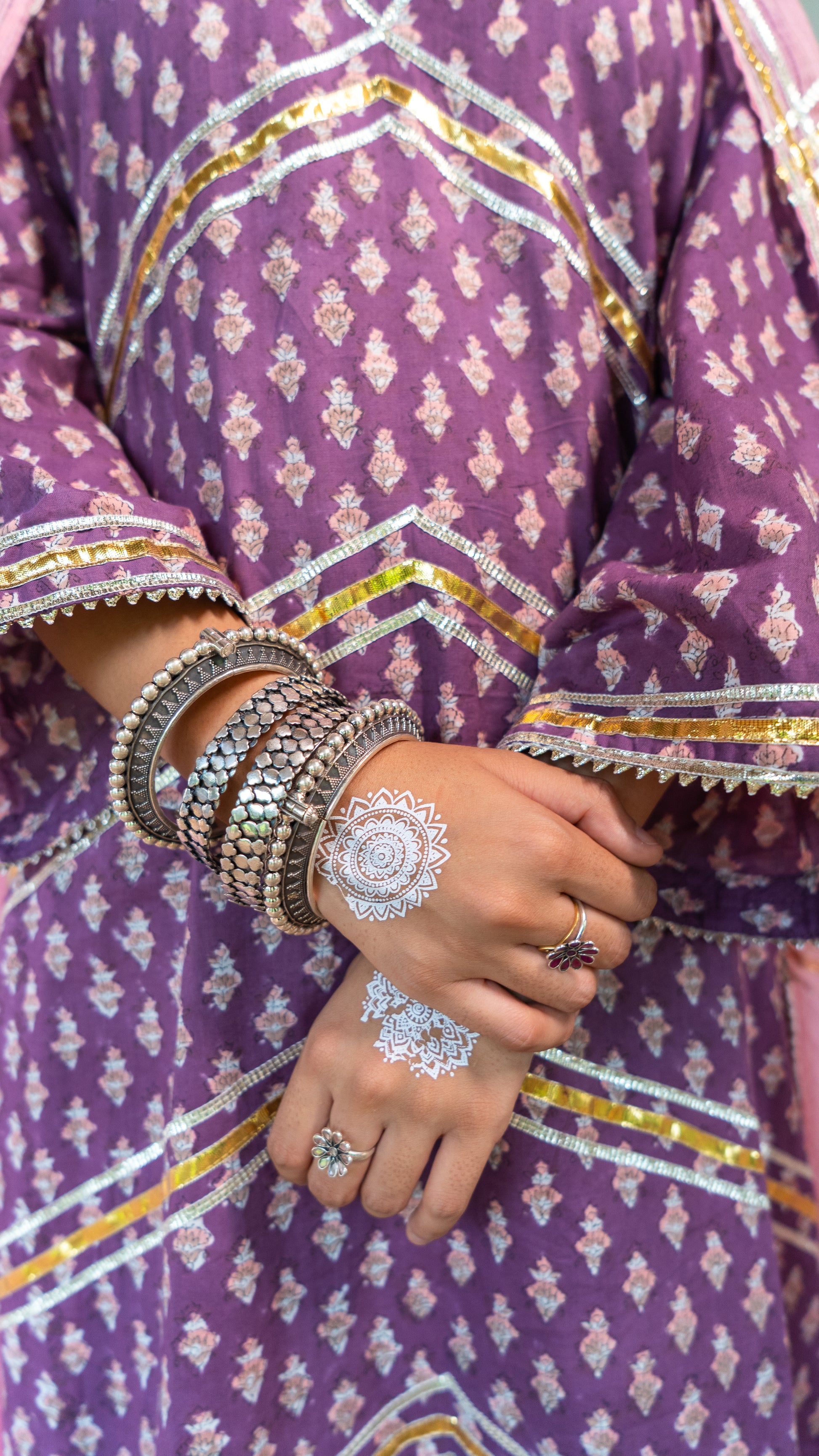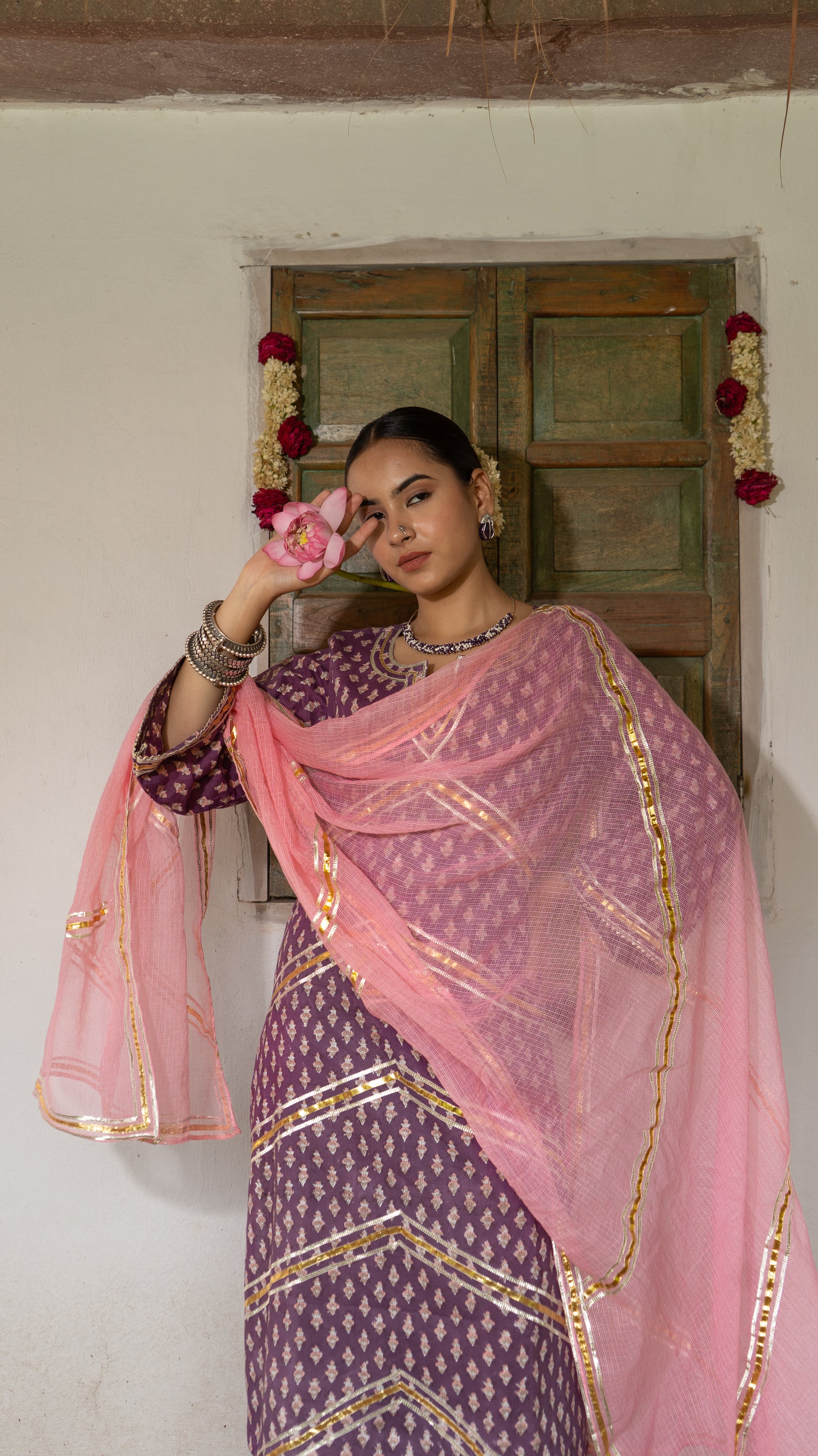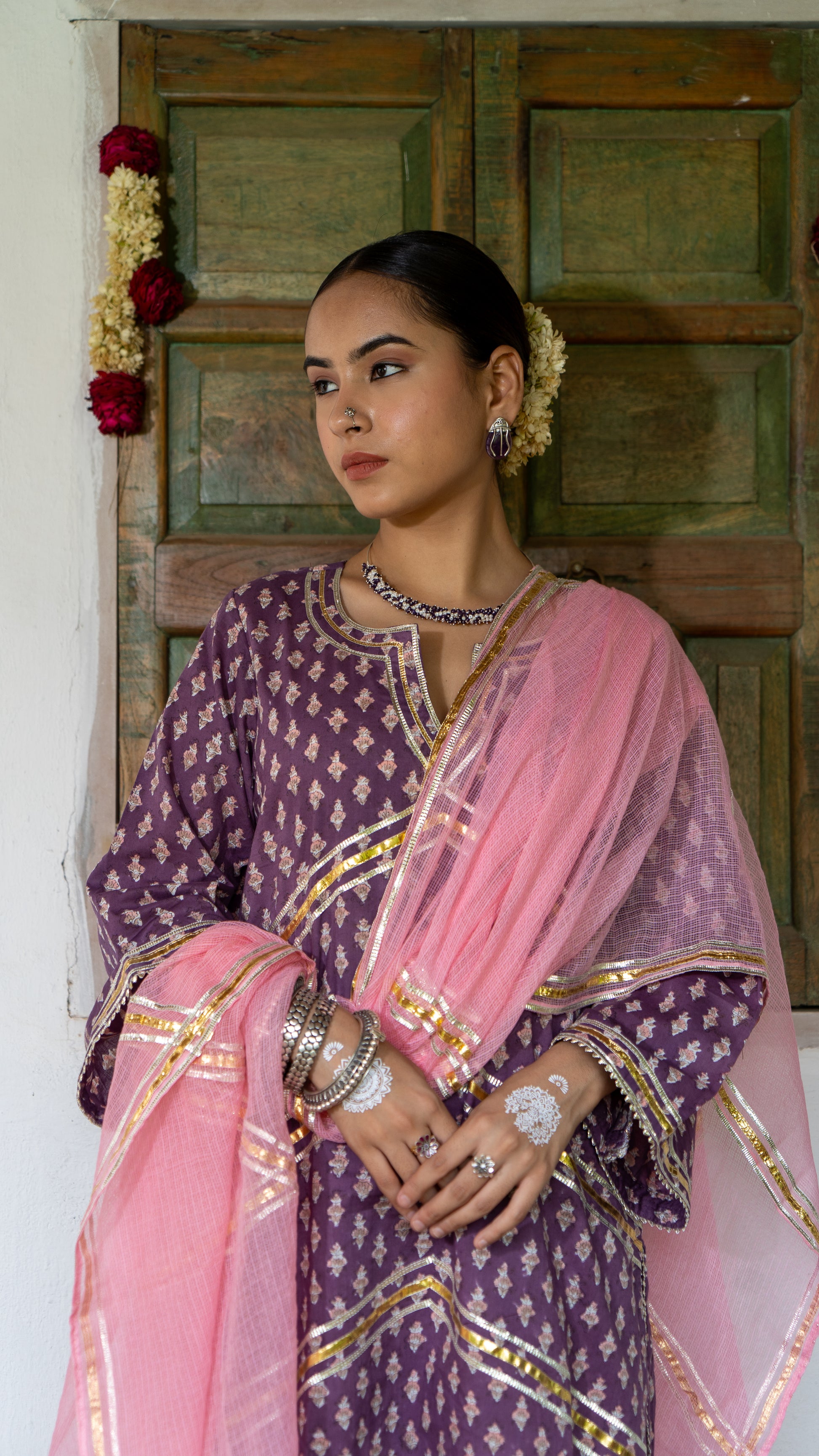 Saundh Purple and Peach hand block printed cotton Salwar set- Cotton salwar set with gota dhari work and ghera sleeves with salwar in matching print. Kota doria dupatta with gota work.