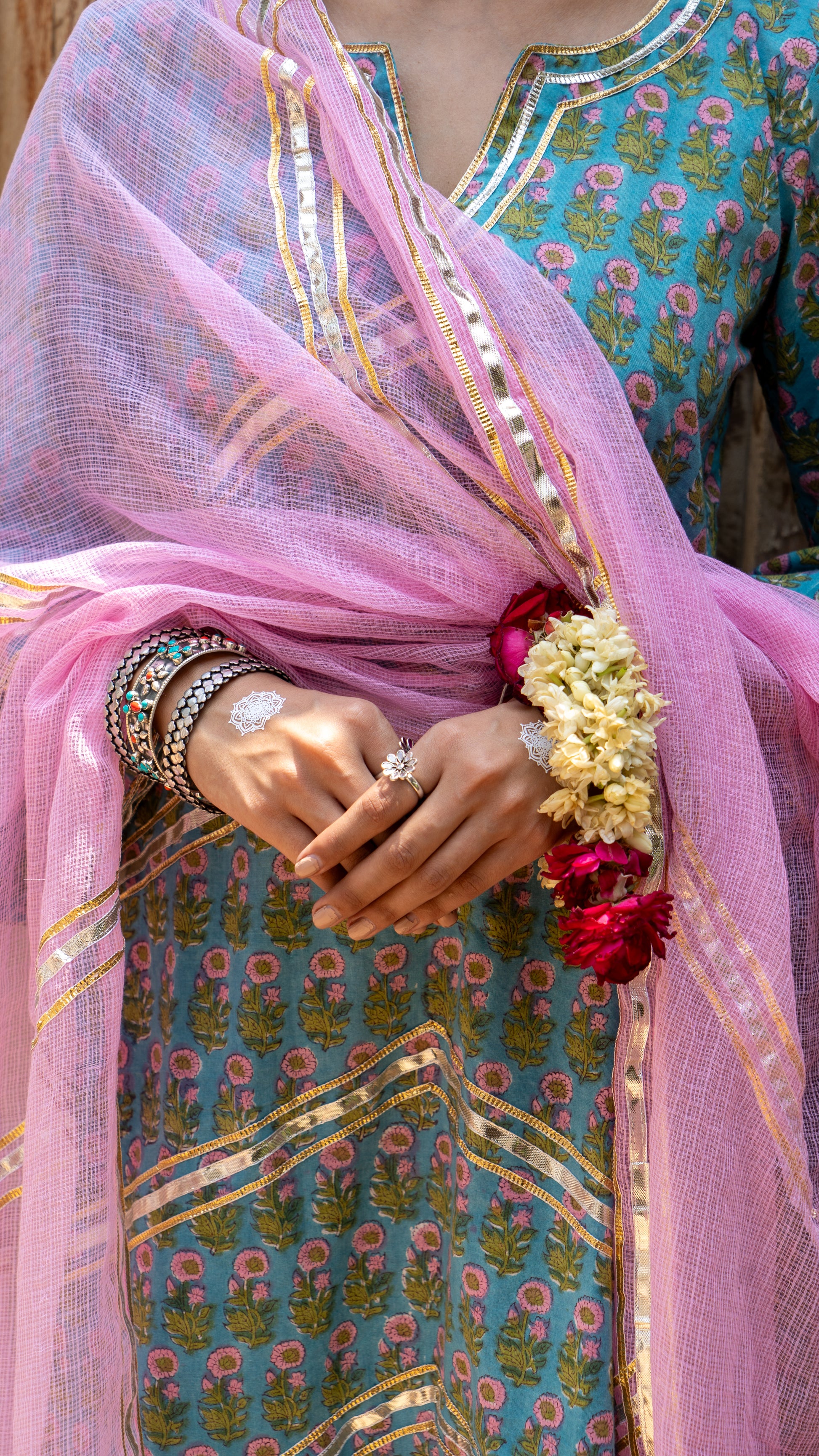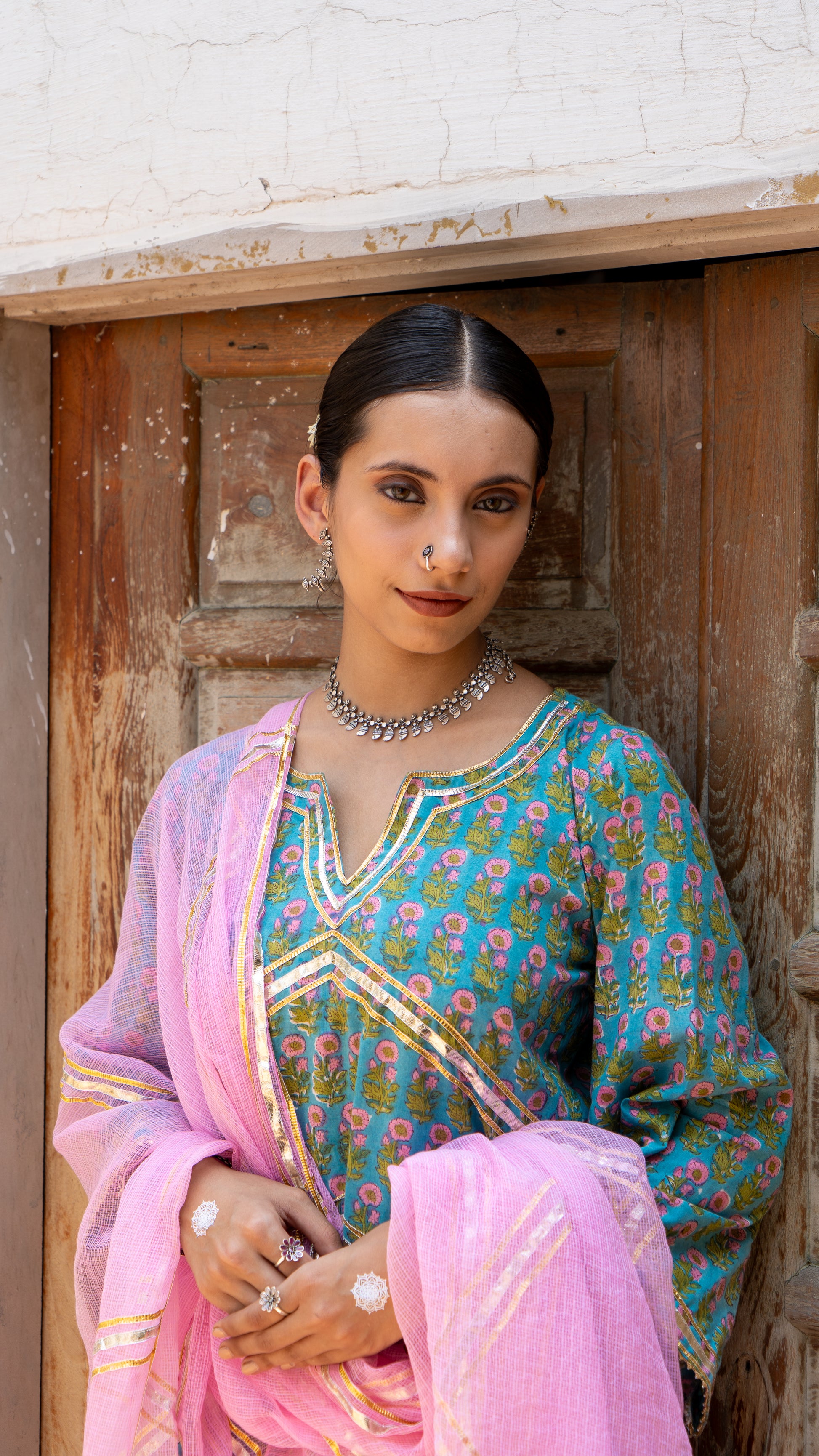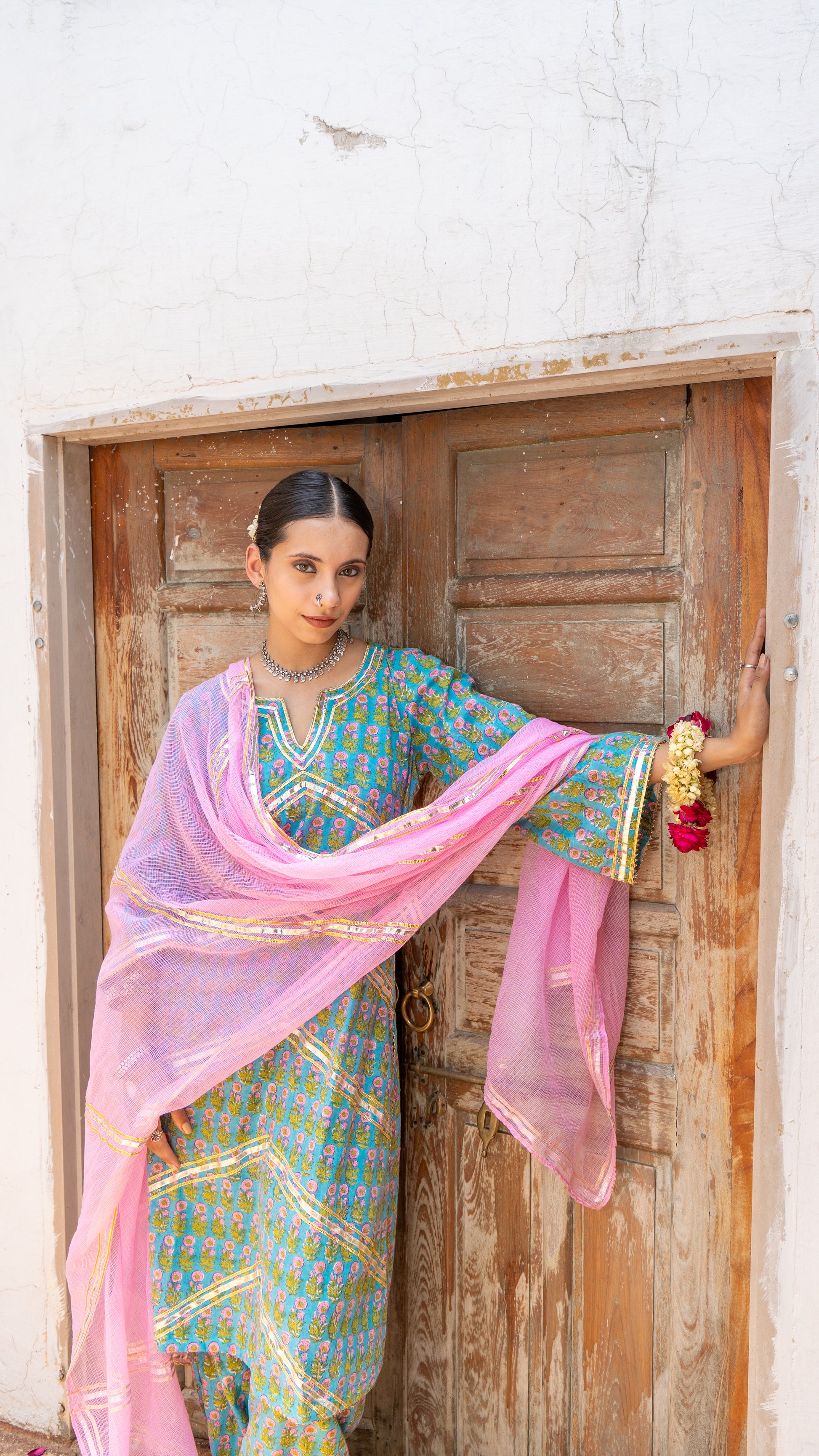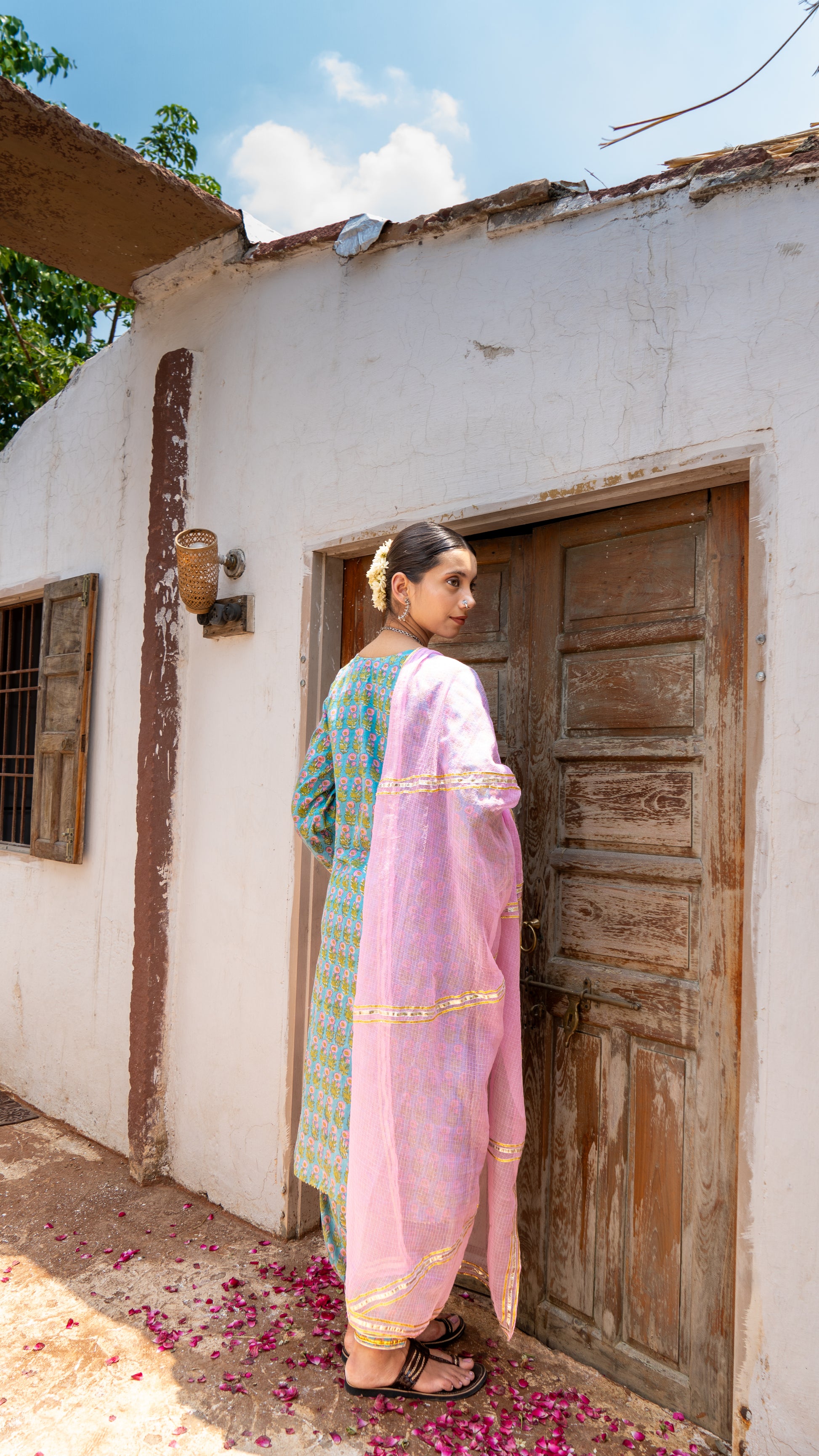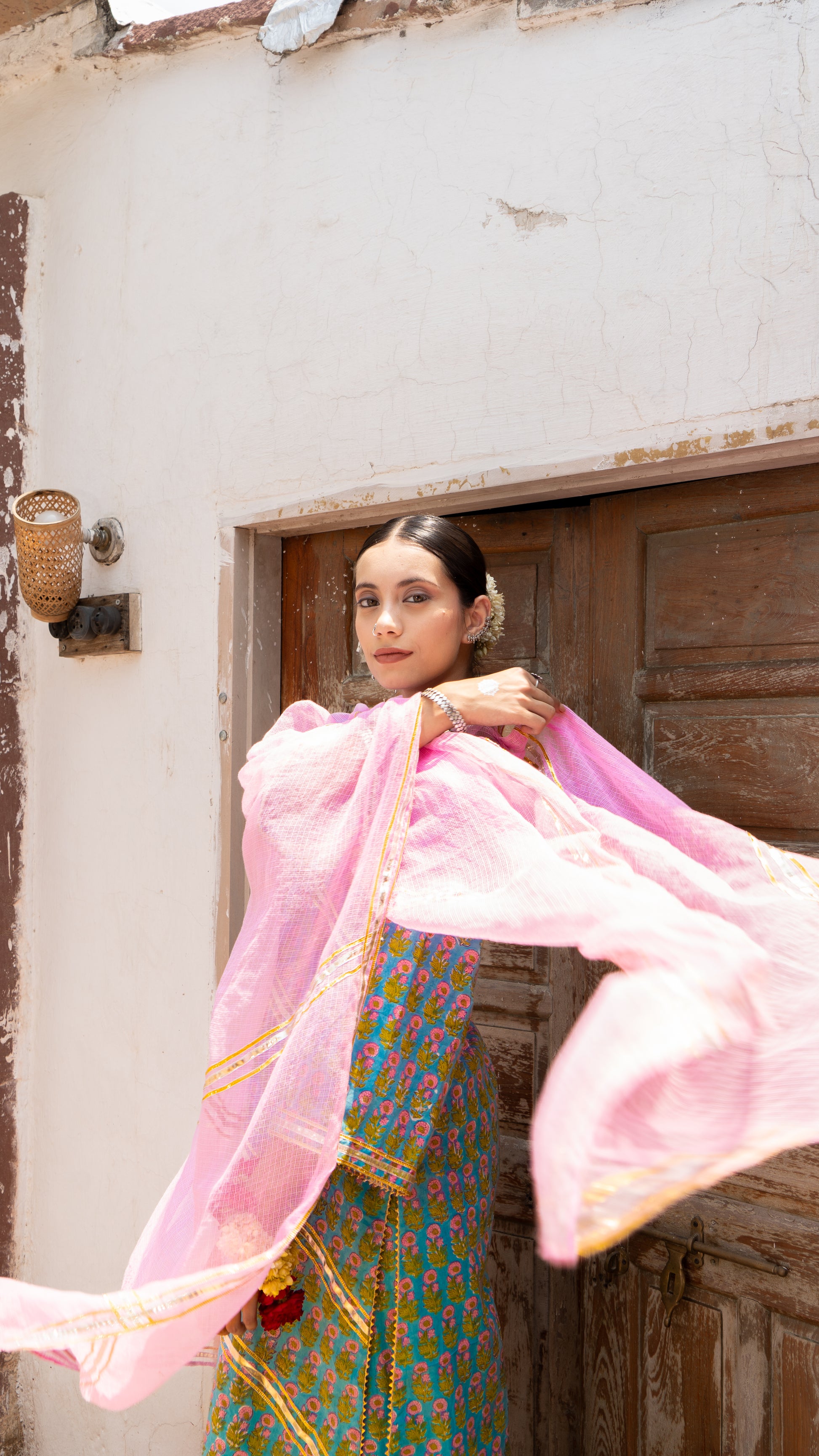 Saundh Sea Green and Pinm hand block printed cotton Salwar set- Cotton salwar set with gota dhari work and ghera sleeves with salwar in matching print. Kota doria dupatta with gota work.
