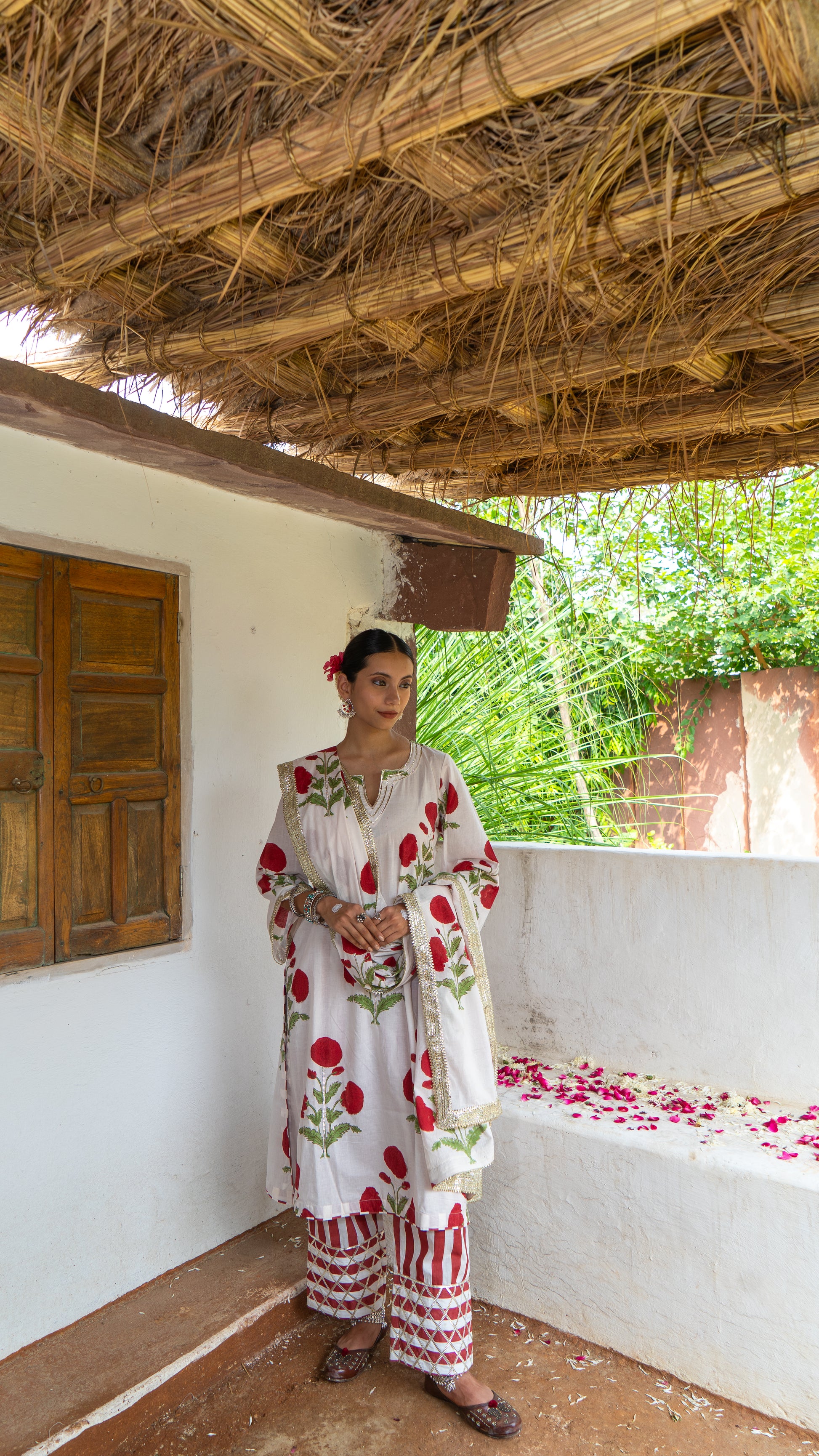 Saundh Red and White hand block printed mughal boota sharara set. Set of 3 consists of cotton kurta, dupatta and pants. Mughal boota printed kurta with soft gota highlights on each boota with Mul dupatta in same print, finished with chatai lace. Cotton stripe pants with dainty gota highlights at the hem.