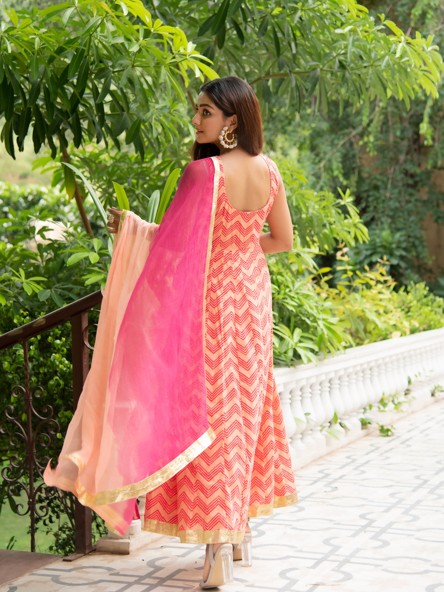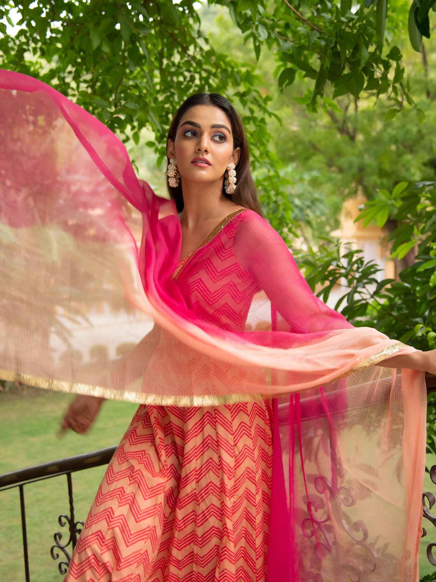 KURTA: A stunning hand printed lehriya kalidaar is mesmerizing shades of peach & red with delicate gota detailing.