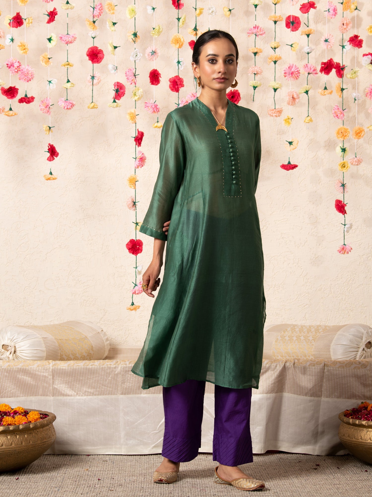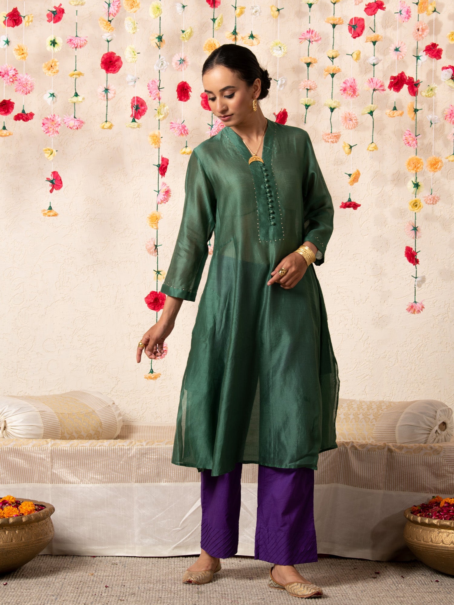 KURTA: This A-line gossamer chanderi kurta in a striking emerald comes with a side panel with gathers and dainty badla detailing on the neck and sleeves.