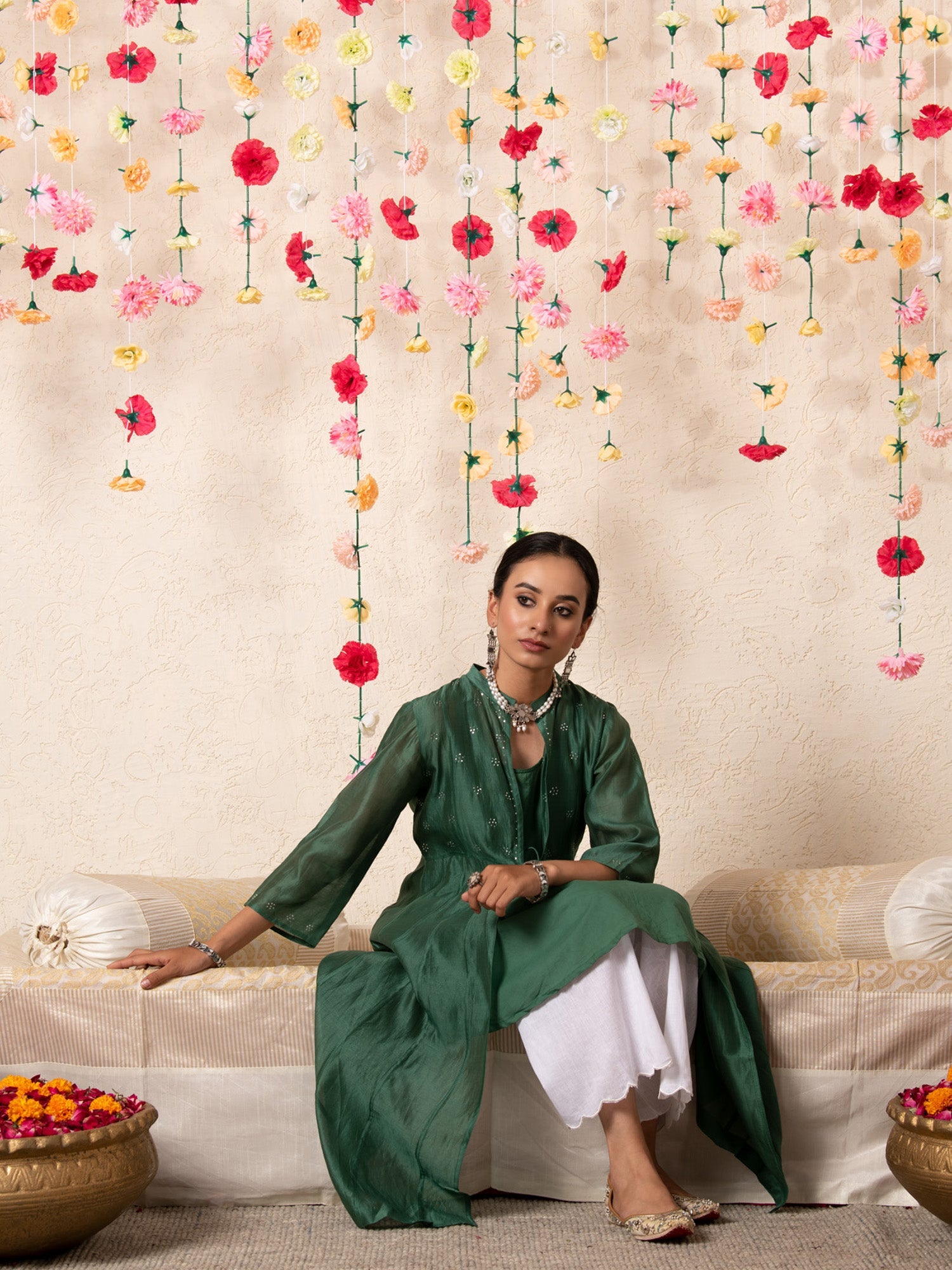 OVERLAY: This emerald paneled overlay in a rich chanderi fabric is delicately detailed with badla highlights on the body and sleeves