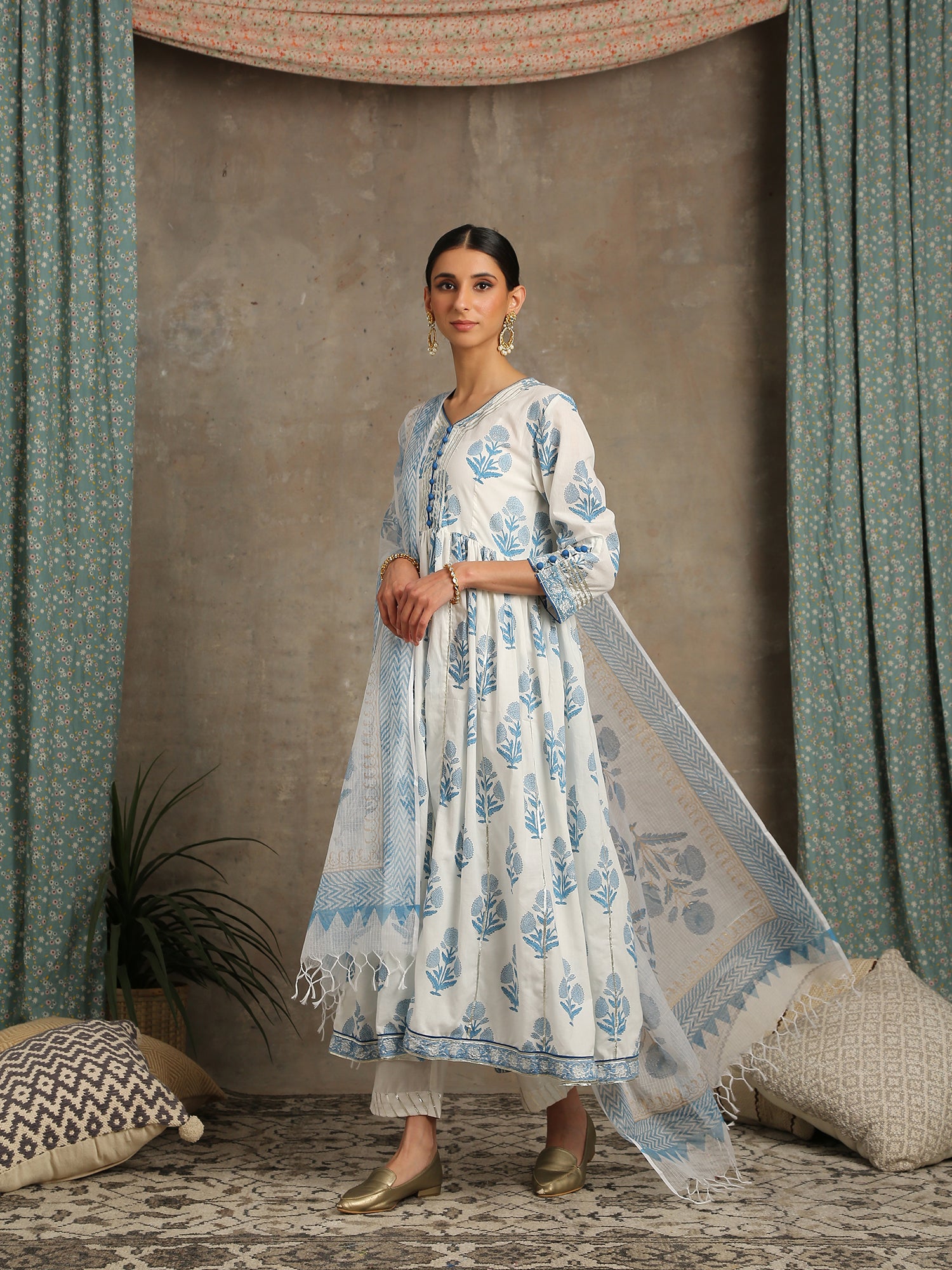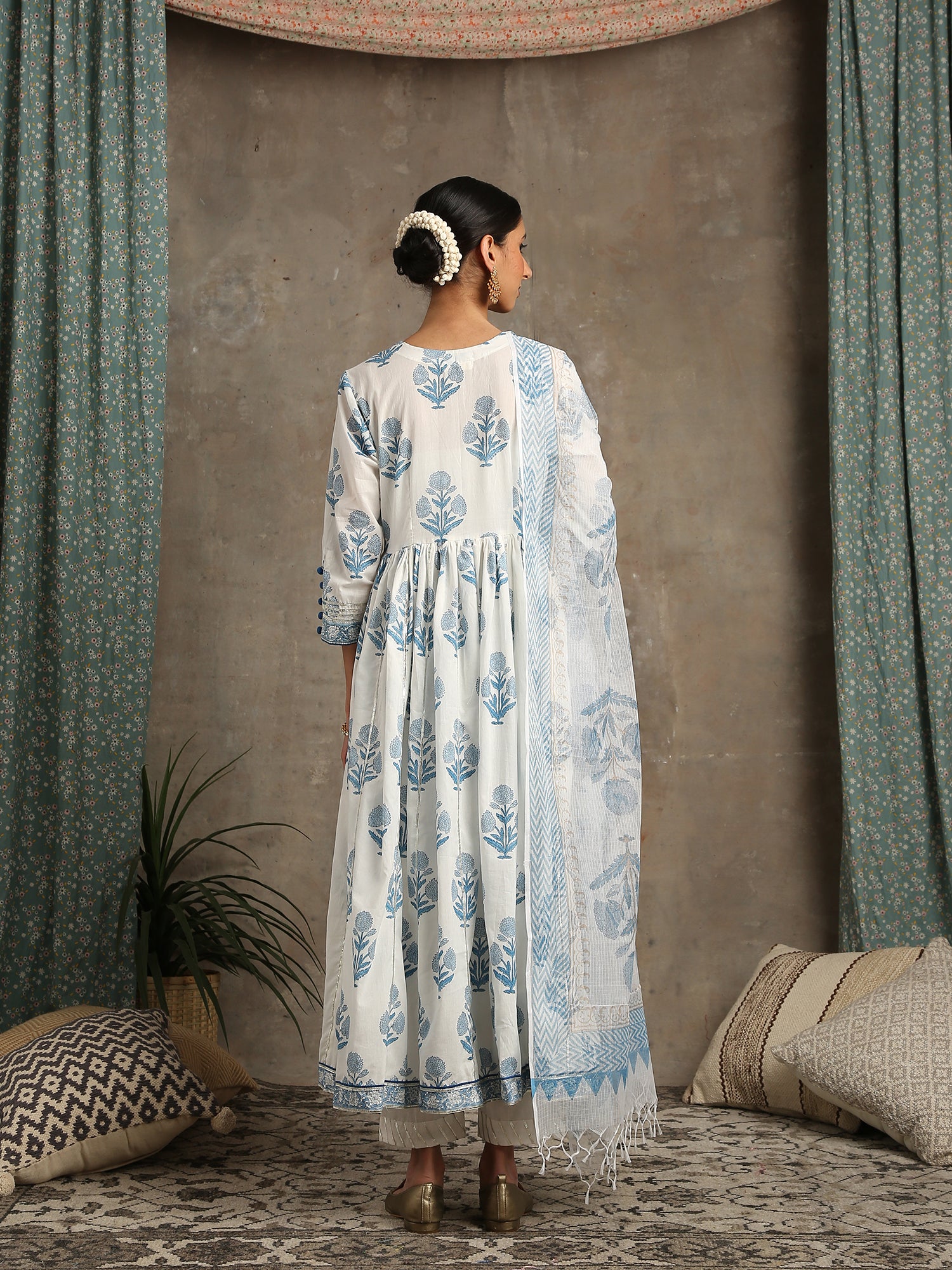 KURTA -Hand block printed poppies on an ivory base. Gathered ghera kurta with silver gota highlights, handmade potli buttons and magzi detailing on neck and sleeves.