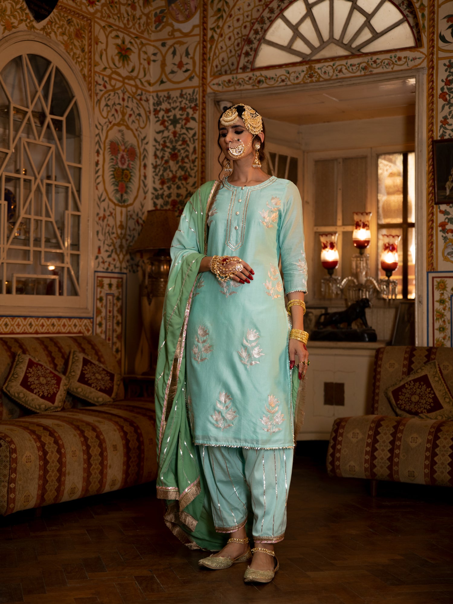 SALWAR: Sky blue cotton silk salwar is detailed with gota dhari embroidery.