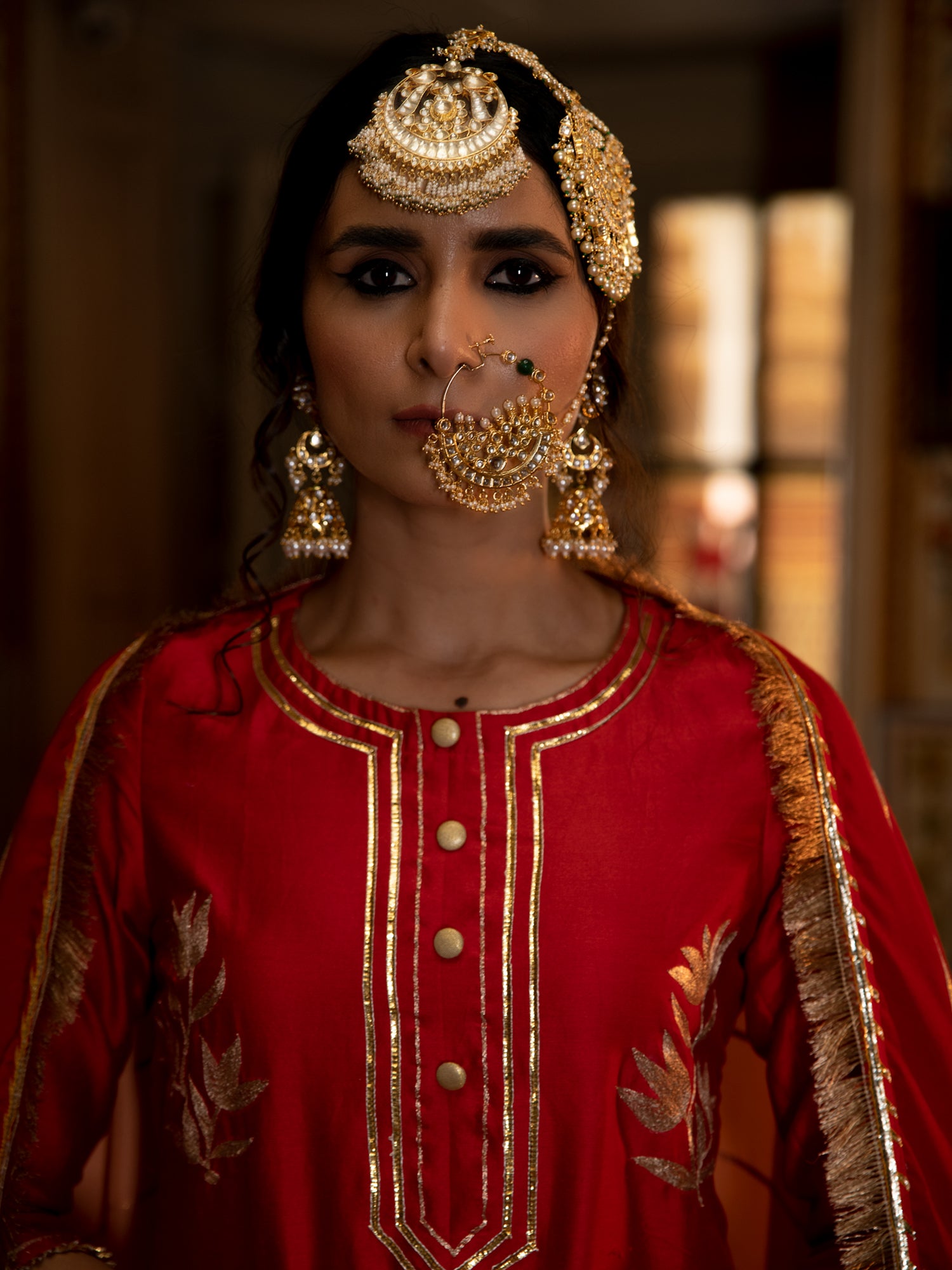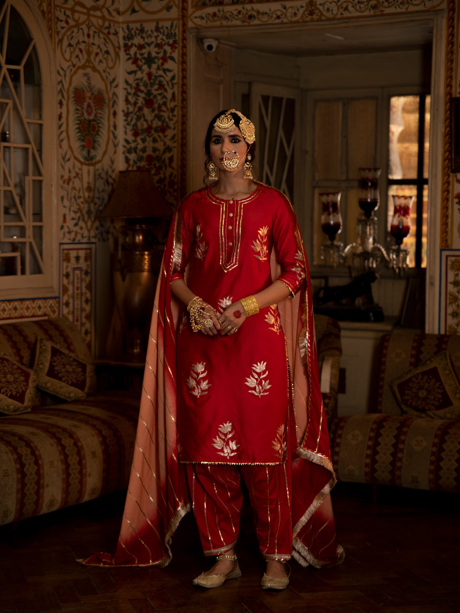 SALWAR: Red cotton silk salwar is detailed with gota dhari embroidery.