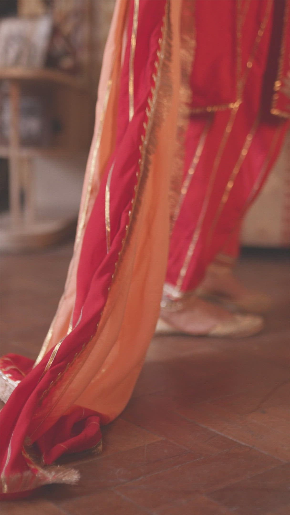 DUPATTA - An ombré dyed muslin silk dupatta in peach and red is detailed with gota dhari embroidery finished with contrast magzi and kiran detailing.