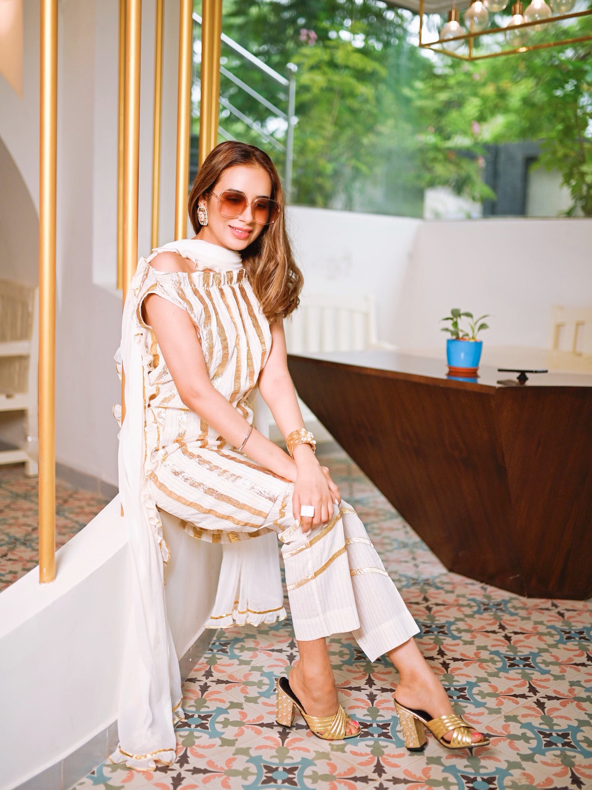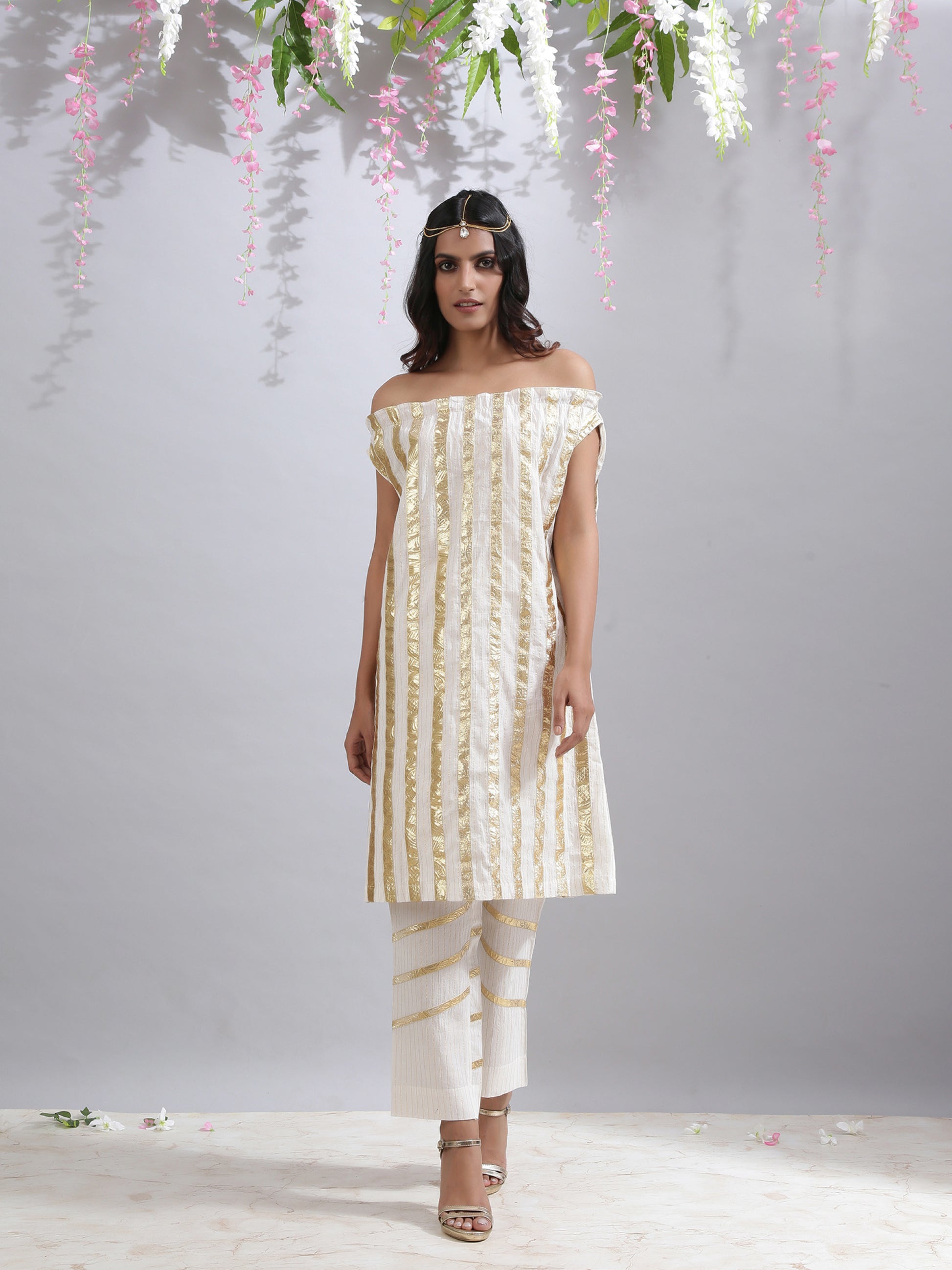 TUNIC- Off shoulder Ivory tunic crafted on a woven cotton base. Highlighted with stripes of golden gota all over. Comes with a victorian era inspired frill neckline. Combine it with our gota pants or wear it as a dress and style it with a dainty belt for a waist defining silhouette.